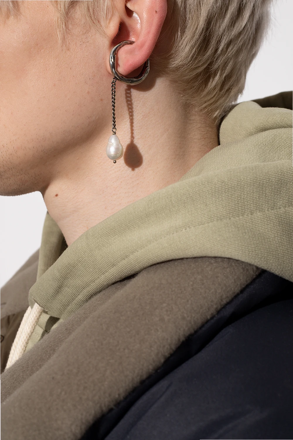 Nausznica w kolorze srebrnym Acne Studios. Wykonany z mosiądzu. Ozdobiony zawieszką imitującą perłę w kolorze białym.