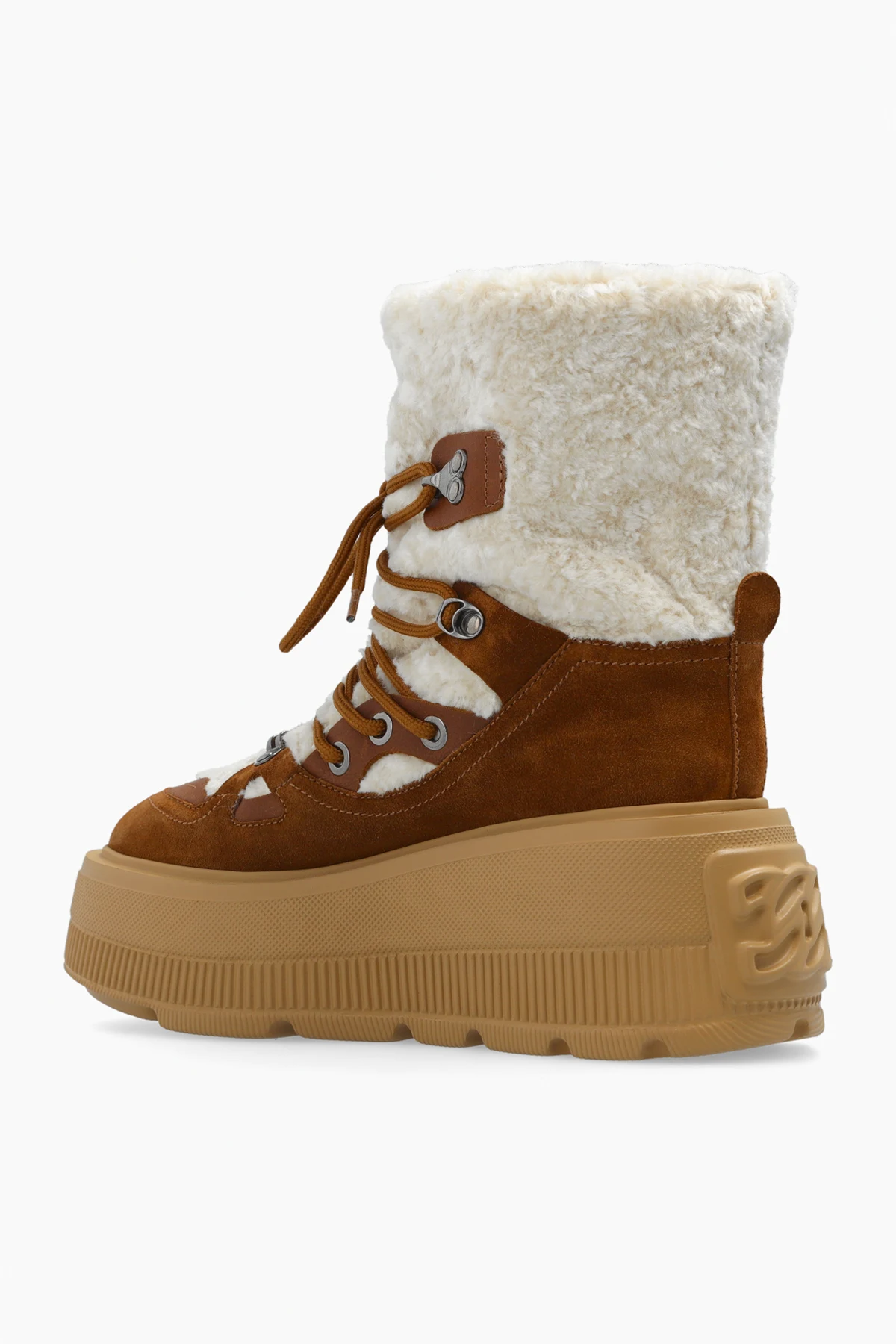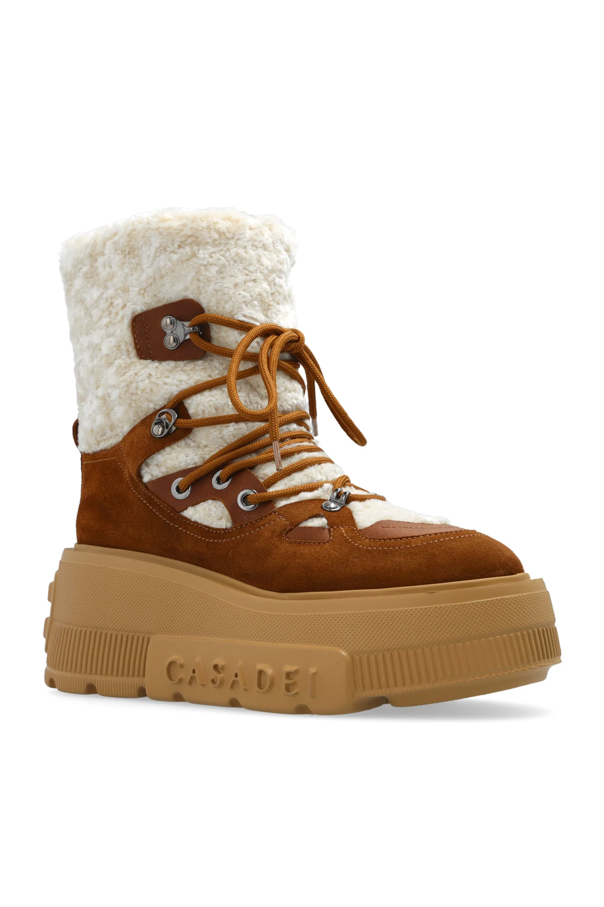 Brązowo-kremowe, sznurowane buty na platformie, model ‘Nexus Skipass’ Casadei. Wykonane z zamszu cielęcego i imitacji futra. Beżowa, gumowa podeszwa z logo.