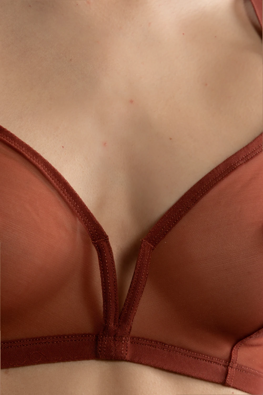 Brązowy, tiulowy biustonosz, model ‘Providence’ Eres. Z tyłu zapinany na haftki. Regulowane ramiączka. Trójkątne miseczki. Z przodu usztywnienie w kształcie litery ‘V’.