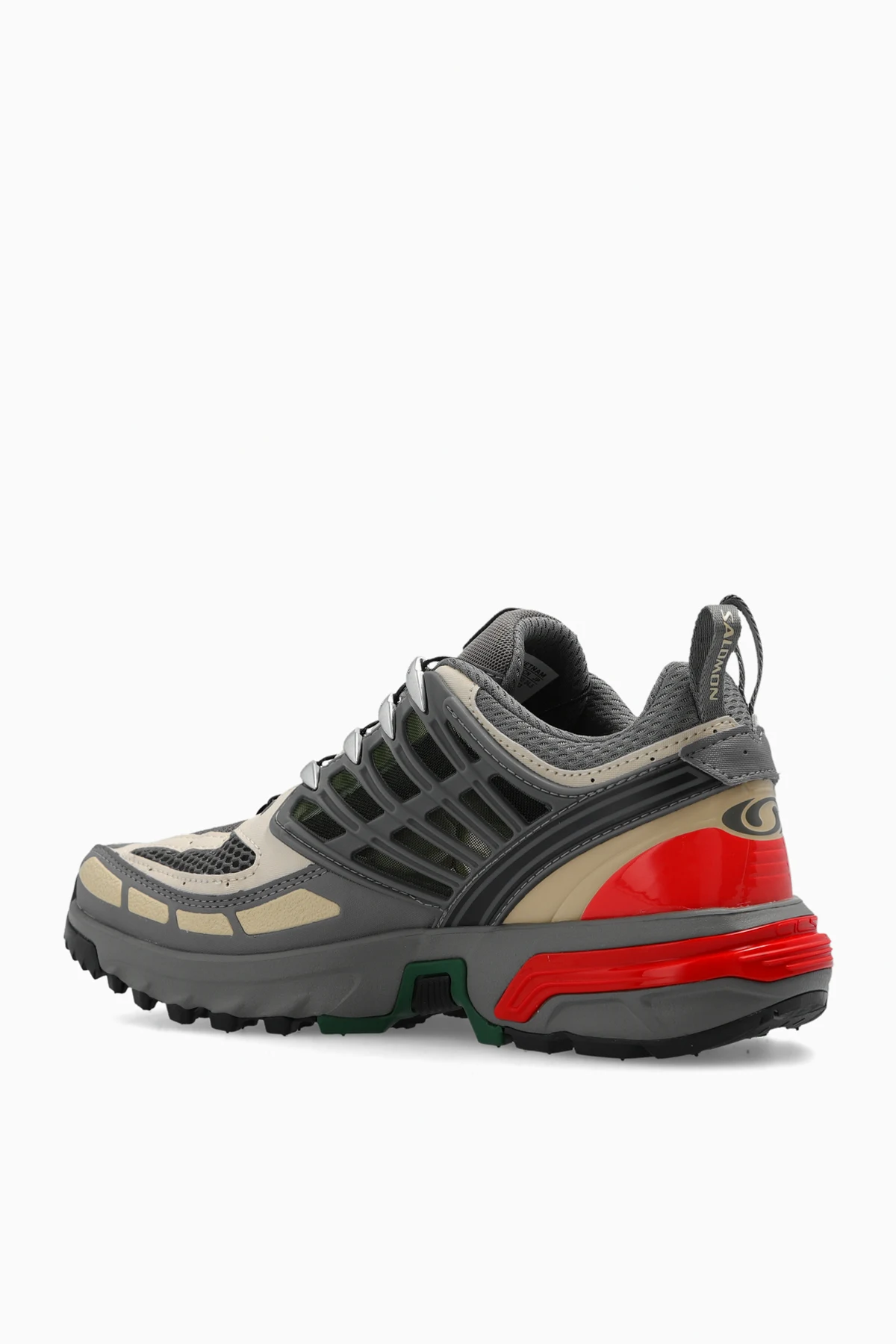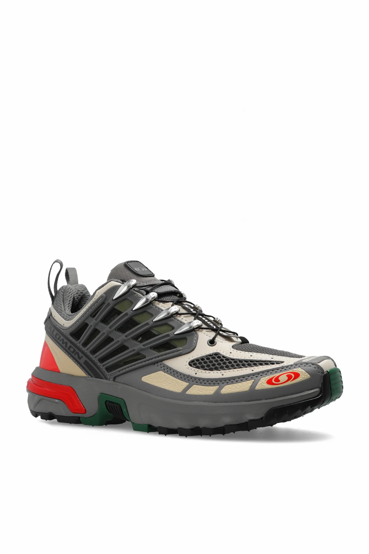 Kolorowe buty sportowe, model ‘ACS PRO’ Salomon. Wykonane z tworzywa sztucznego i materiału. System sznurowania Quicklace™. Ozdobione aplikacjami z logo. Szaro-zielono-czerwona, gumowa podeszwa.