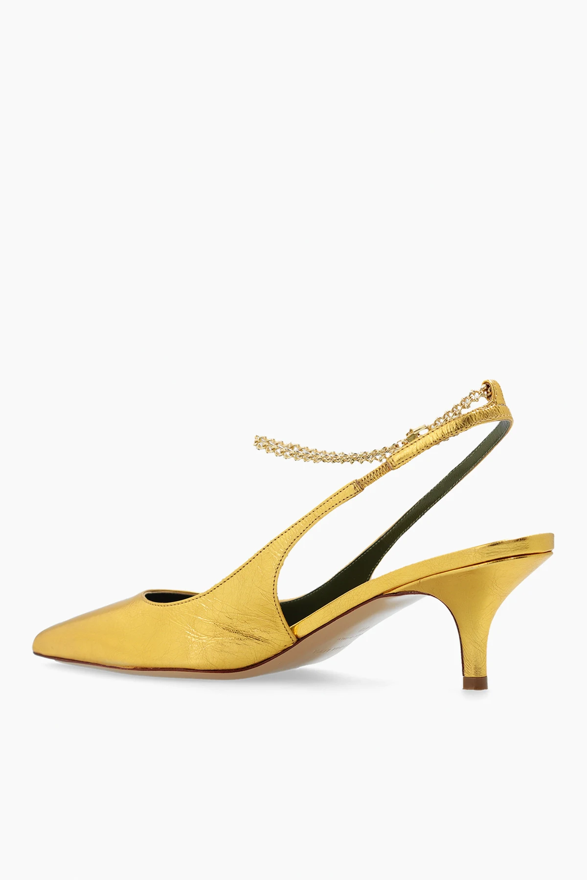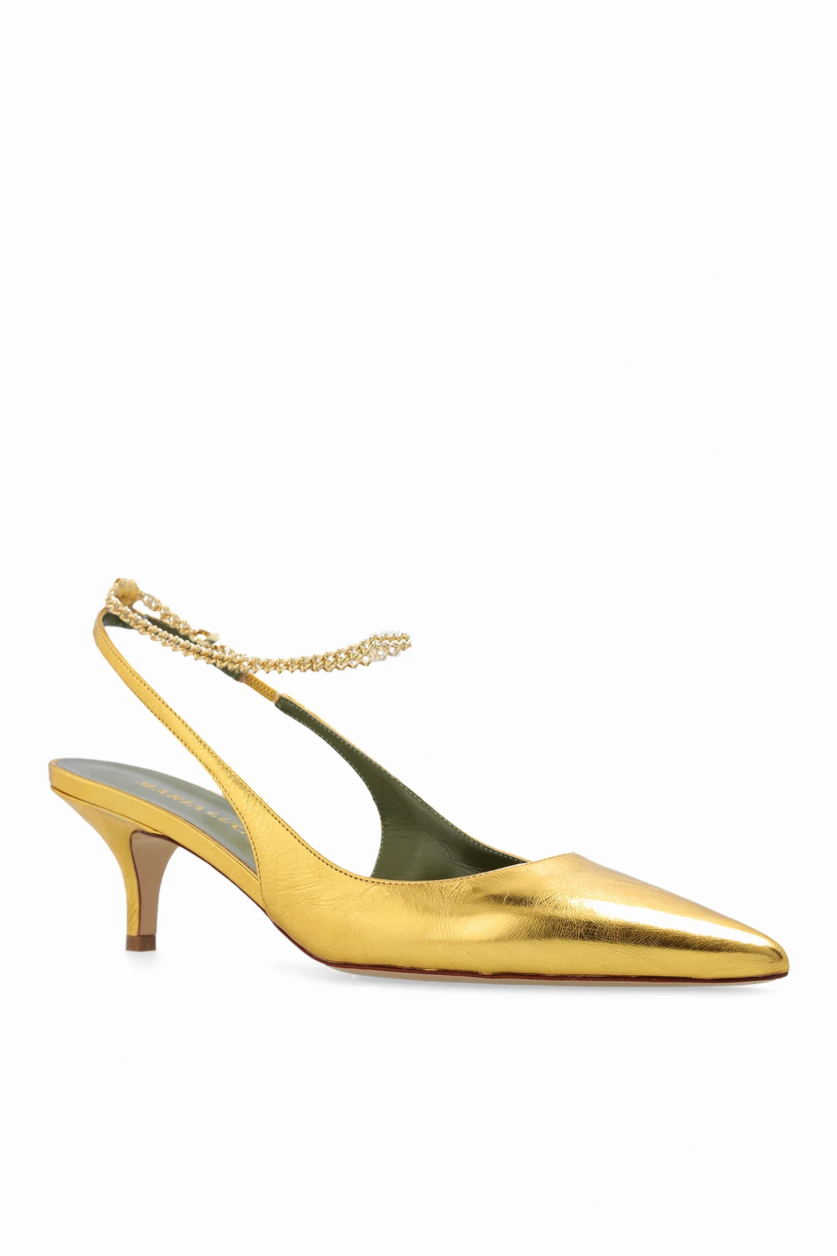 Buty na obcasie w kolorze złotym, model ‘Felicia’ Maria Luca. Wykonane ze skóry z efektem gniecenia. Wokół kostki zapinane na łańcuch. Nosek w szpic. Podeszwa wykonana ze skóry w kolorze beżowym.