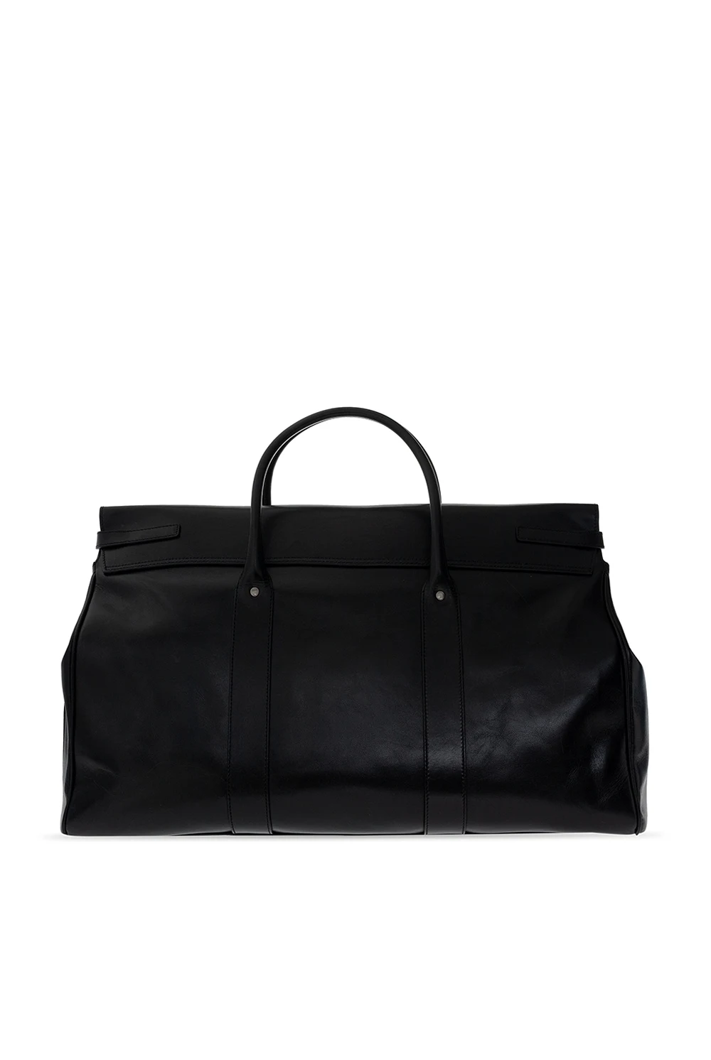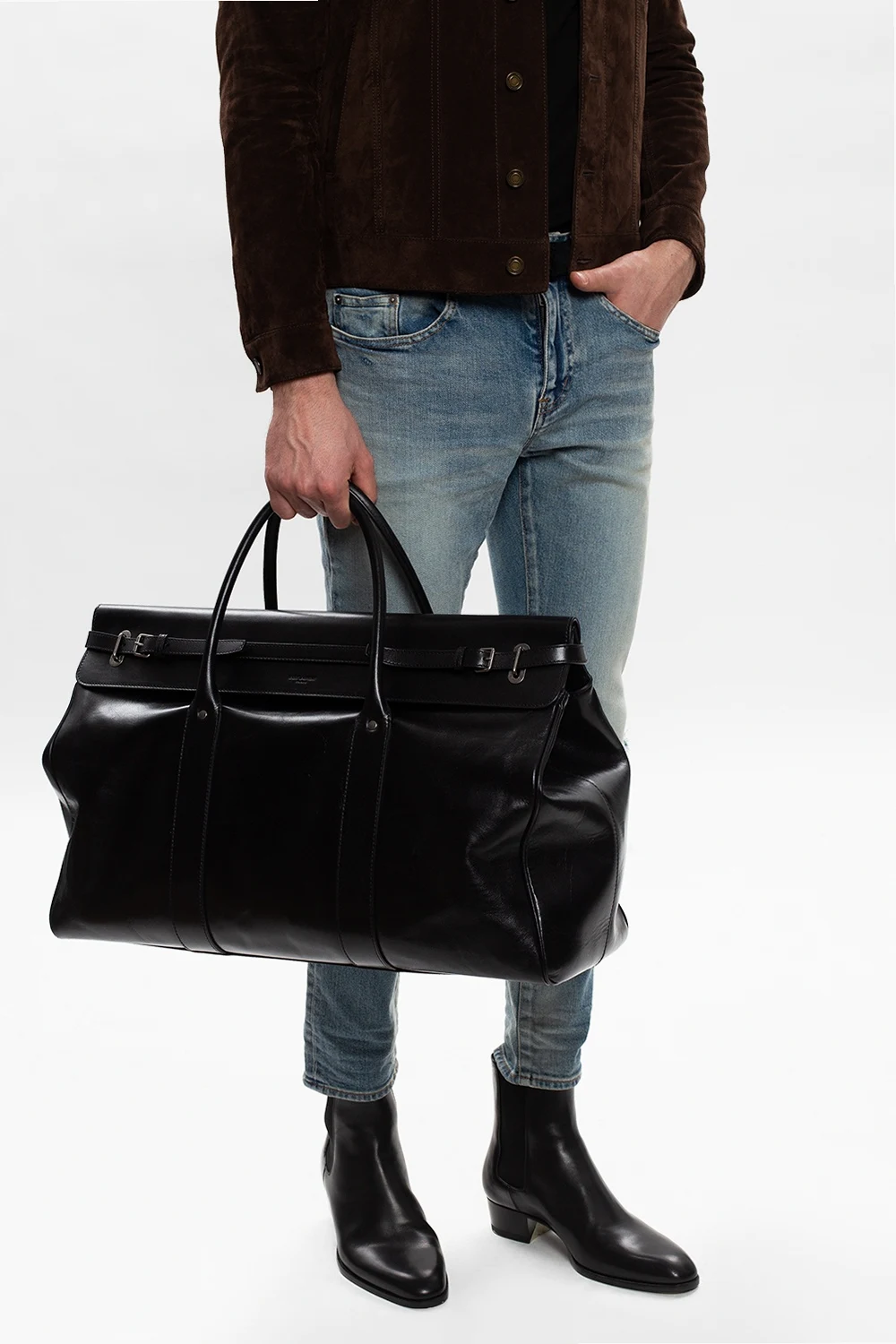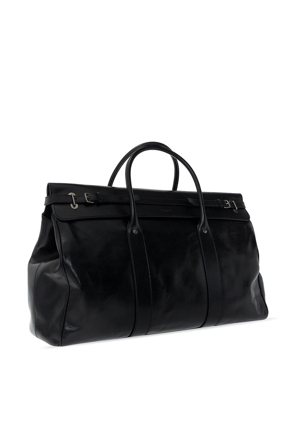 Czarna torba podręczna Saint Laurent. Wykonana z cielęcej skóry. Zapinana na podwójny pasek z metalową klamrą. Z przodu wytłoczone logo. Dwie półokrągłe rączki. Czarna warstwa wewnętrzna. Wewnątrz komora i dwie kieszenie: wsuwana i zamykana na zamek. Metalowe wykończenie w kolorze srebrnym.