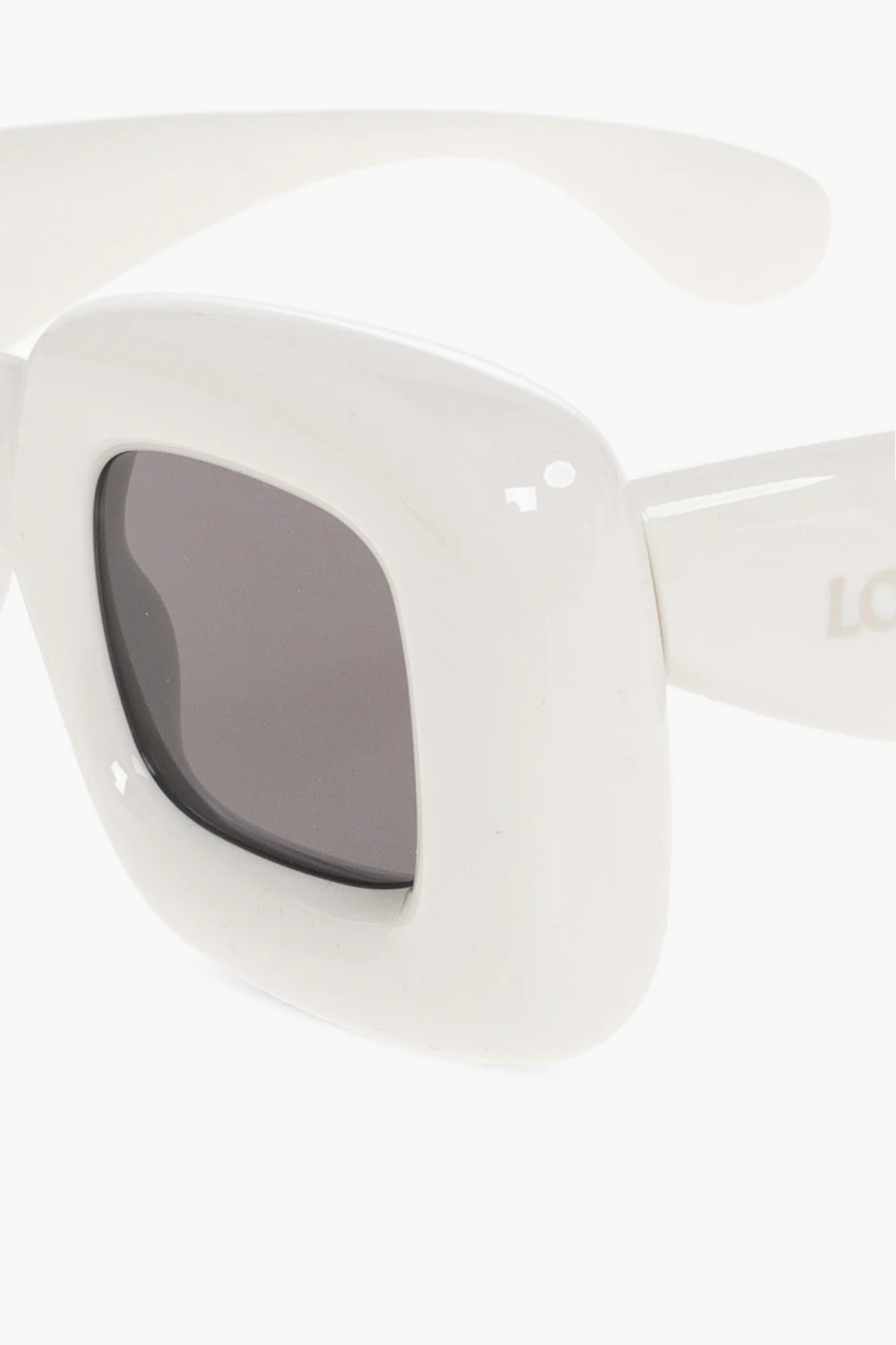 Jasnoszare okulary przeciwsłoneczne Loewe. Dekoracyjne, kwadratowe oprawki i zauszniki wykonane z acetatu. Po bokach nadrukowane logo. Szare, nylonowe szkła ze 100% ochroną przed promieniami UV. Dołączone etui.