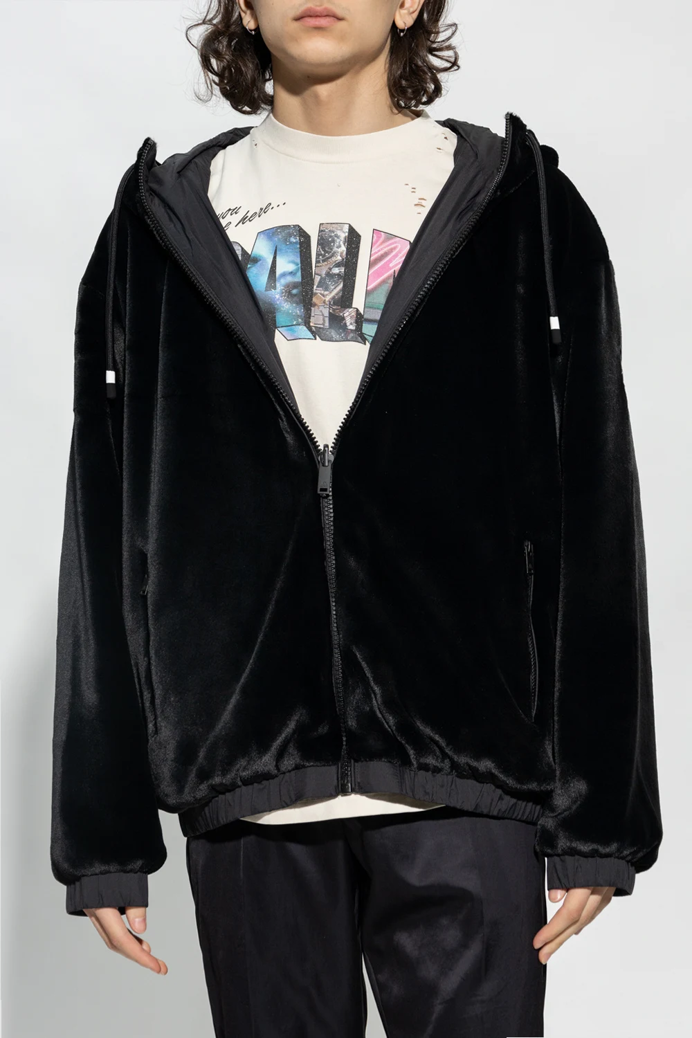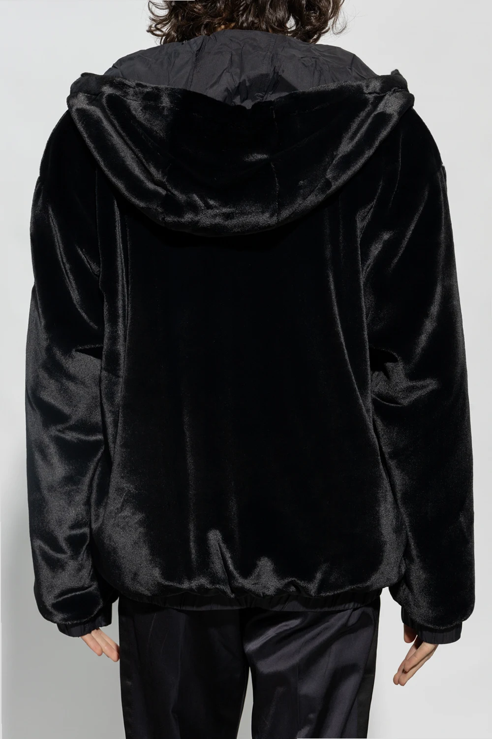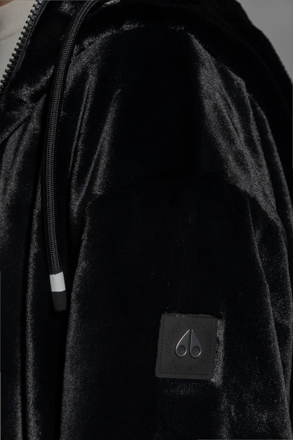 Czarna kurtka Moose Knuckles. Zapinana na zamek. Kaptur ściągany trokami. Długie rękawy - na jednym naszywka z logo. Z jednej strony futrzana. Z przodu dwie kieszenie zapinane na zamek. Z drugiej strony gładka, czarna. Z przodu dwie kieszenie.