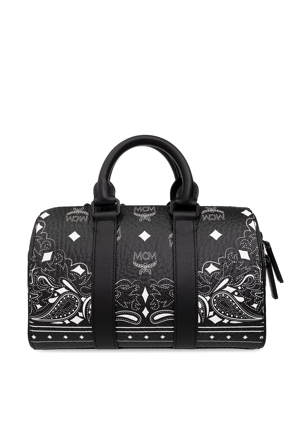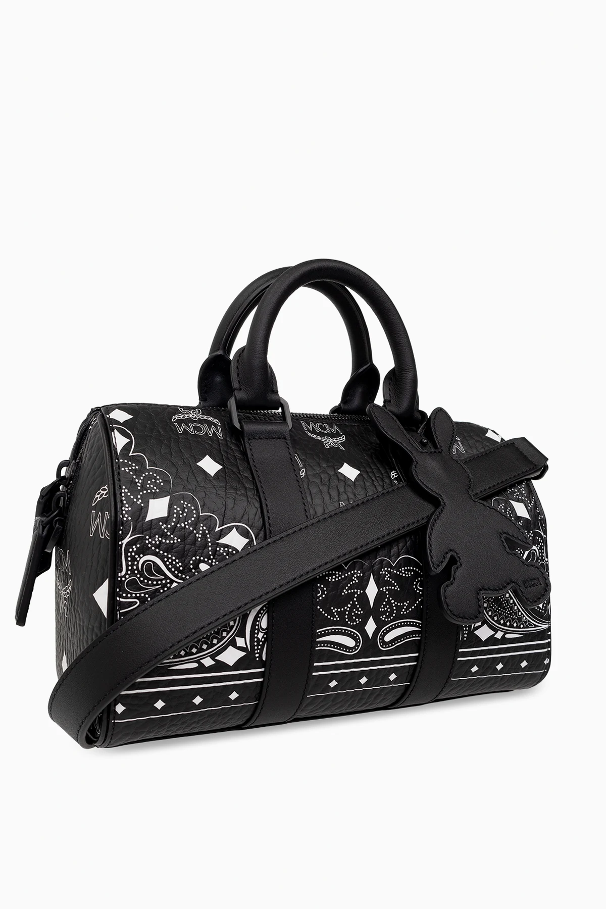 Czarna torba na ramię, model ‘Aren Boston Small’ MCM. Wykonana z powlekanego płótna i wykończona skórą. Zamykana na dwubiegunowy zamek. Ozdobiona monogramem ‘Visetos’ i motywem ‘paisley’ w kolorze białym. Dwie półokrągłe rączki oraz odpinany, regulowany pas na ramię. Dołączona zawieszka w kształcie królika. Wewnątrz komora z dwiema kieszeniami: zamykaną na zamek oraz wsuwaną.