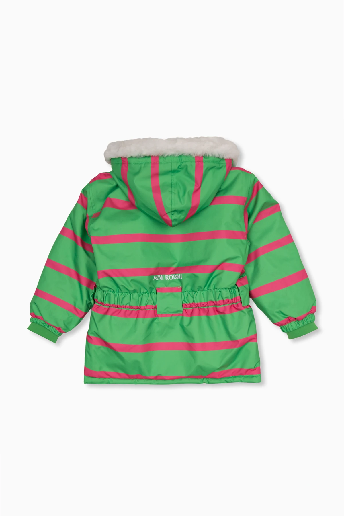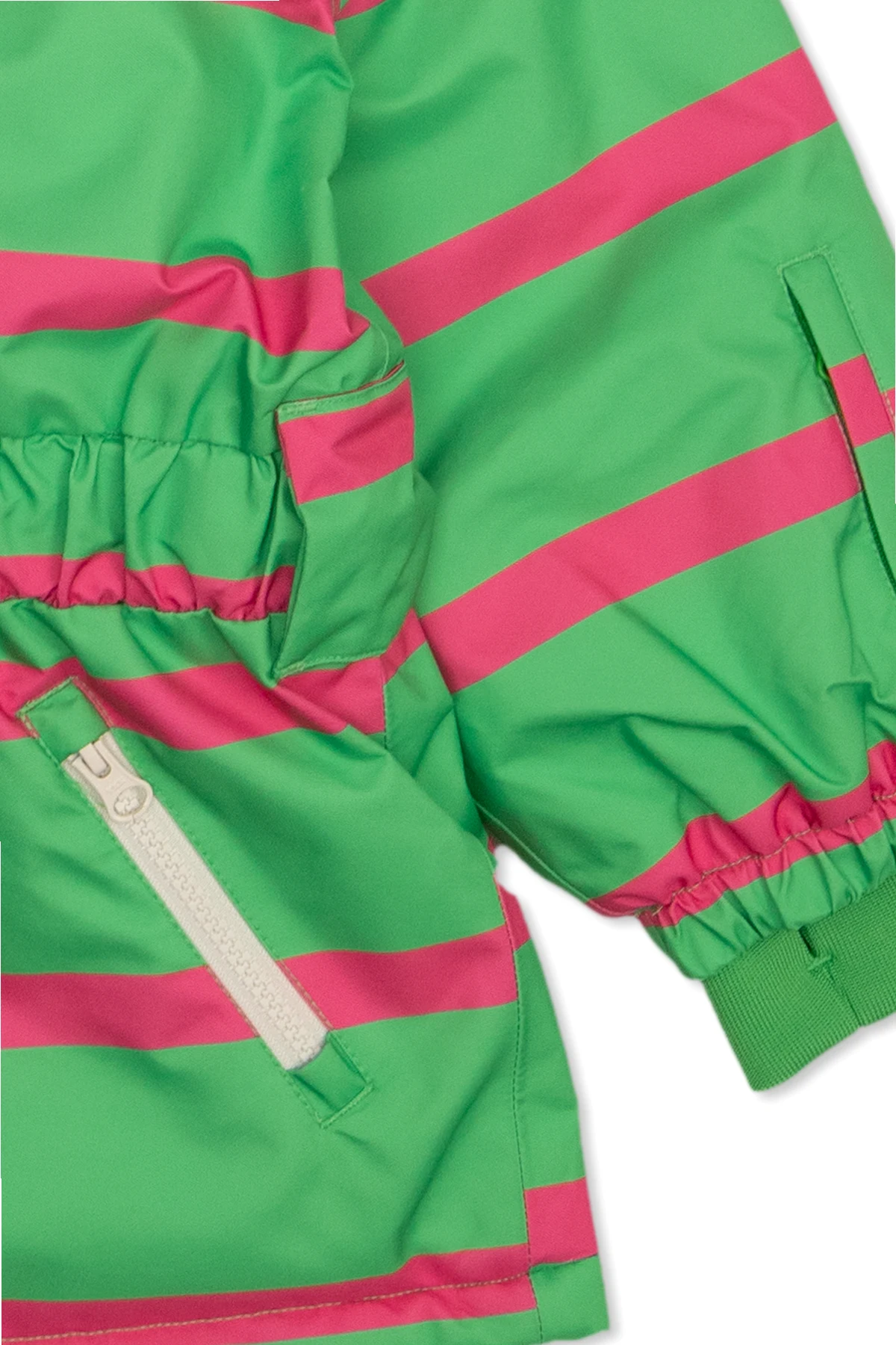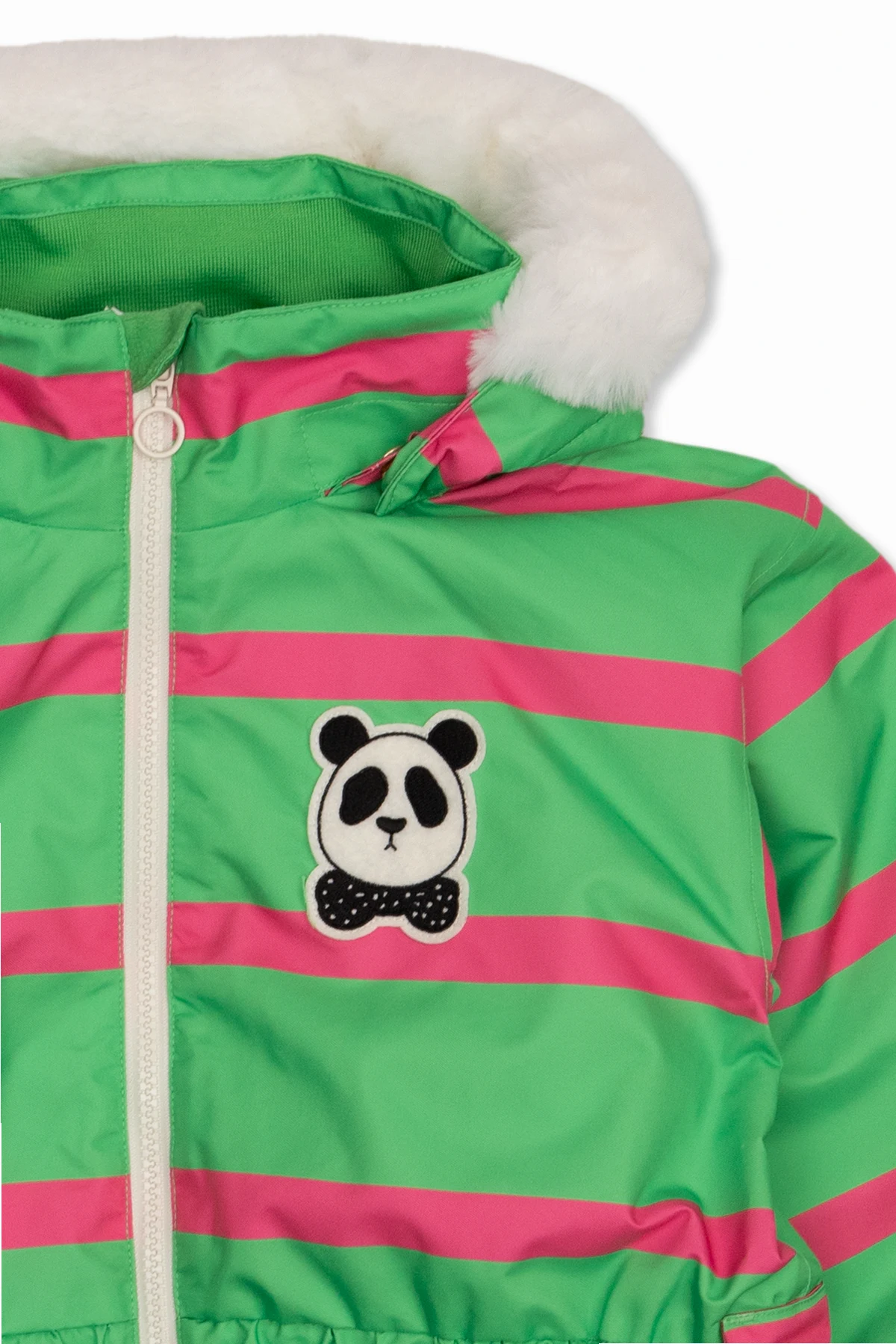 Zielono-różowa, ocieplana kurtka Mini Rodini. Wykonana z wodoodpornego, oddychającego i chroniącego przed wiatrem materiału pozyskanego częściowo z recyklingu. Wykończona BIONIC FINISH®ECO-ekologiczną alternatywą dla tradycyjnego, hydrofobowego wykończenia materiałów DWR. Zapinana na zamek. W pasie wszyty ściągacz. Ozdobiona wzorem w paski i naszywką w kształcie pandy w kolorze czarno-białym. Z tyłu nadrukowane, odblaskowe logo. Kaptur z odpinanym sztucznym futrem w kolorze białym. Trzy kieszenie zapinane na zamek. Długie rękawy zakończone ściągaczem z wycięciem na palce.