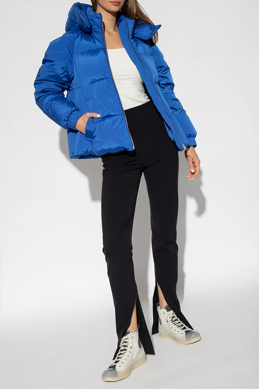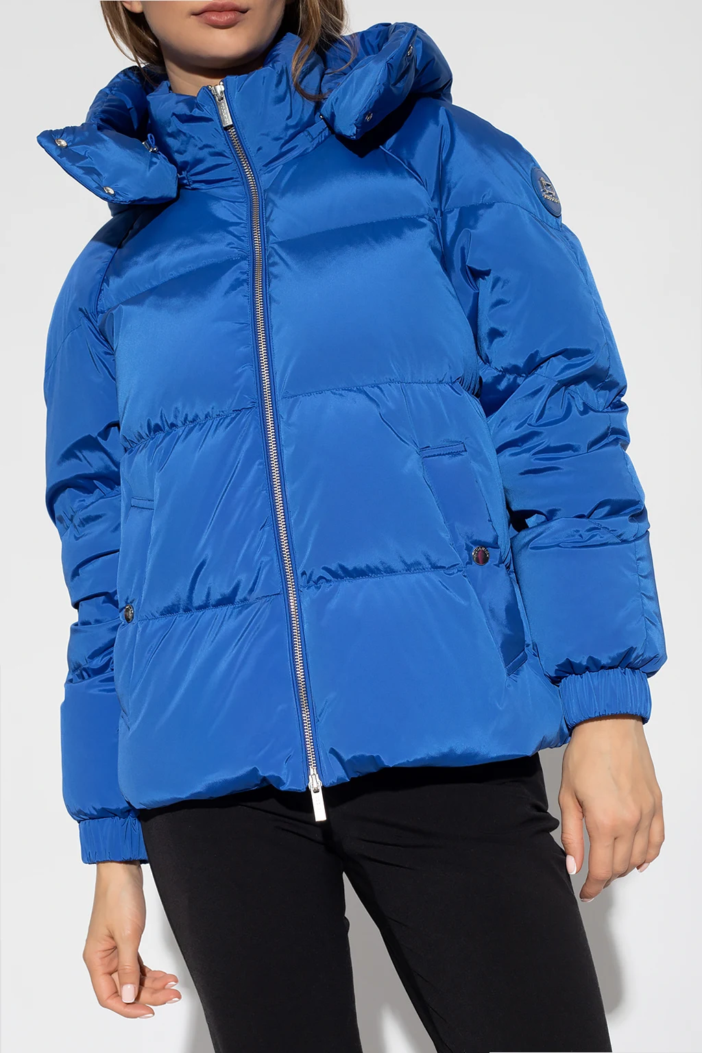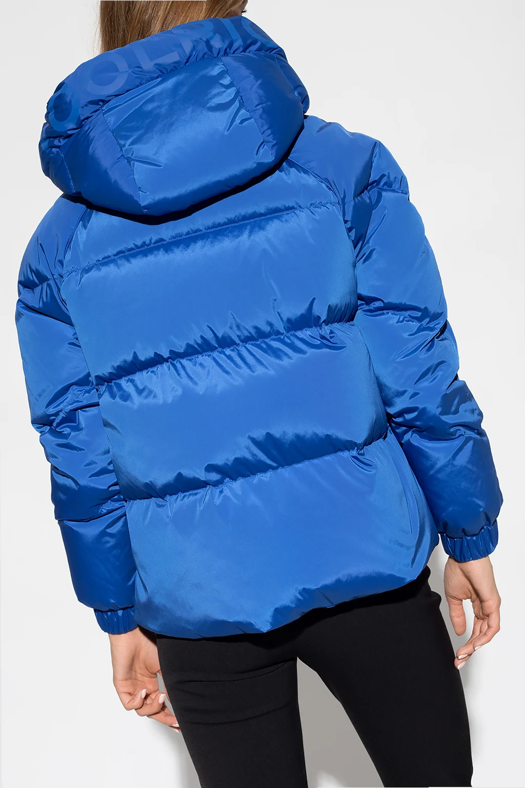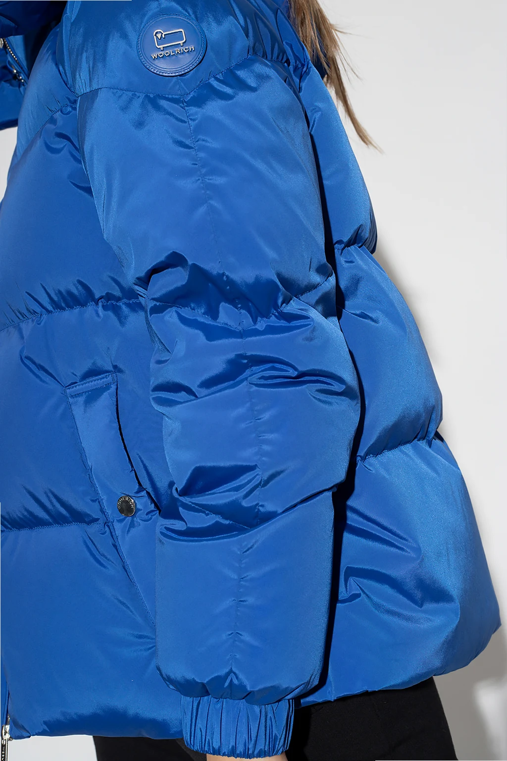 Niebieska kurtka puchowa, model ‘Alsea’ Woolrich. Zapinana na dwubiegunowy zamek. Odpinany kaptur ściągany trokami. Ozdobiona nadrukowanym logo i naszywką z logo. Z przodu dwie kieszenie zapinane na zatrzask. Dół kurtki po bokach ściągany trokami. Długie rękawy zakończone ściągaczem. Zakres temperatur: 0°C / -10°C.