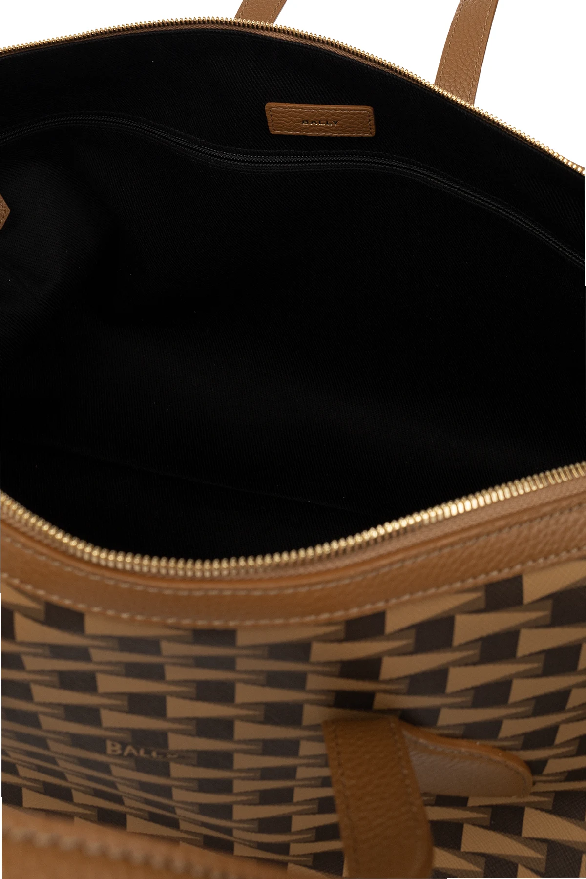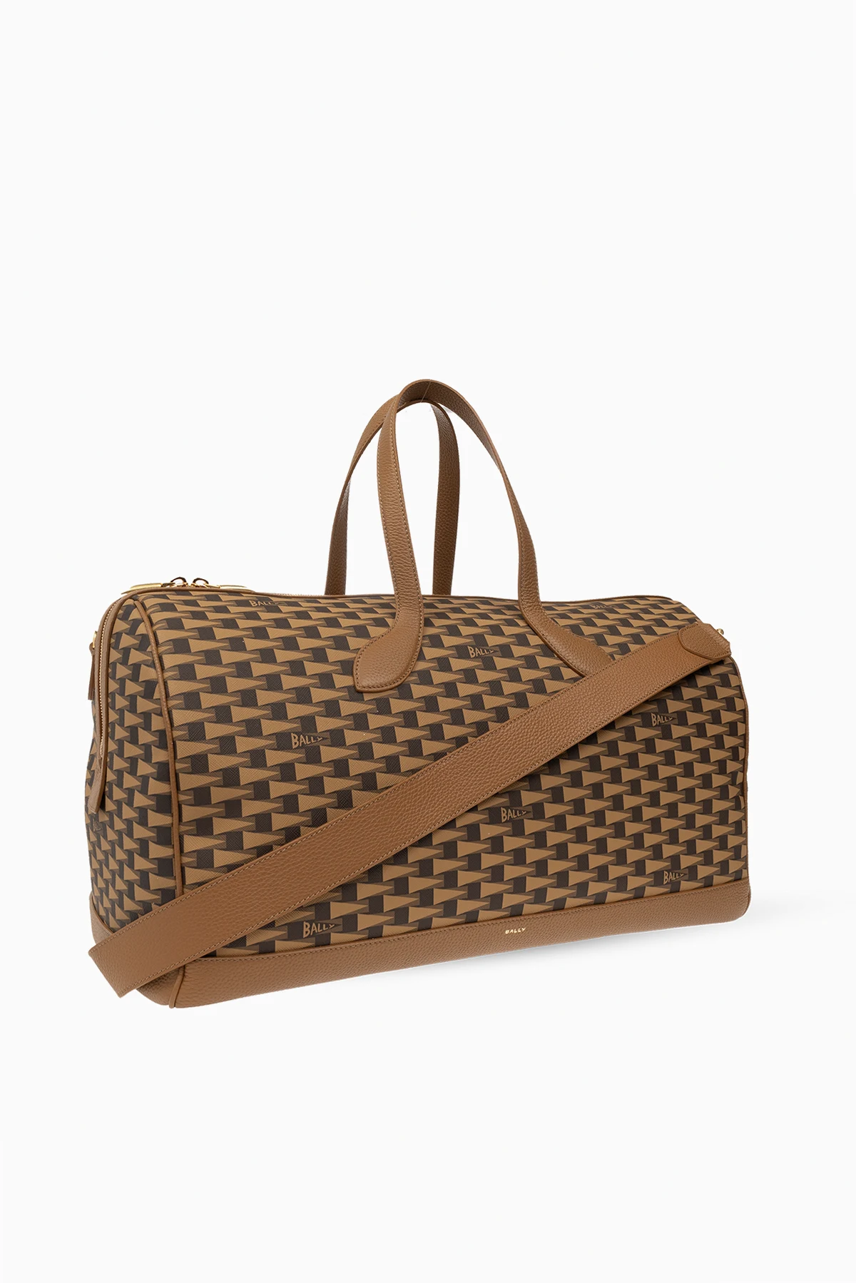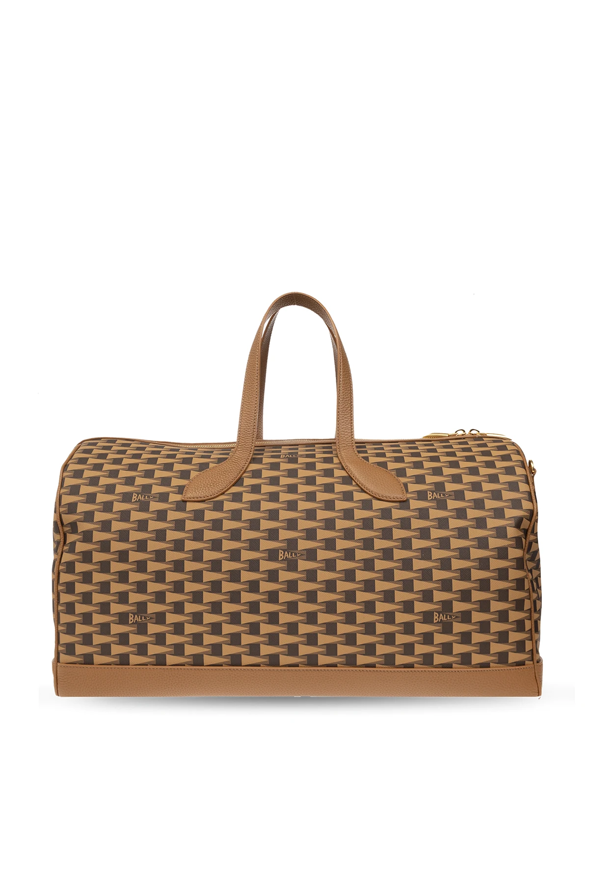 Brązowa torba podręczna Bally. Wykonana z płótna powlekanego i skóry. Ozdobiona wzorem z logo. Zamykana na dwubiegunowy zamek. Dwie półokrągłe rączki. Pasek na ramię z możliwością regulacji długości. Wewnątrz komora oraz trzy kieszenie: jedna zamykana na zamek i dwie wsuwane. Metalowe wykończenia w kolorze złotym.