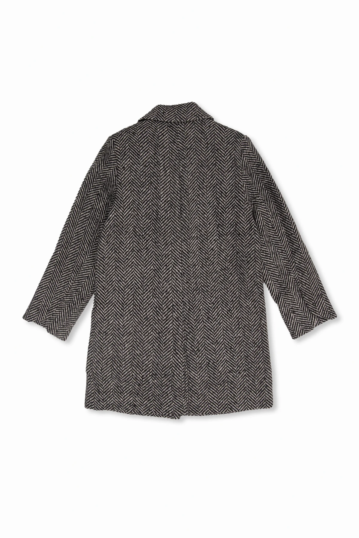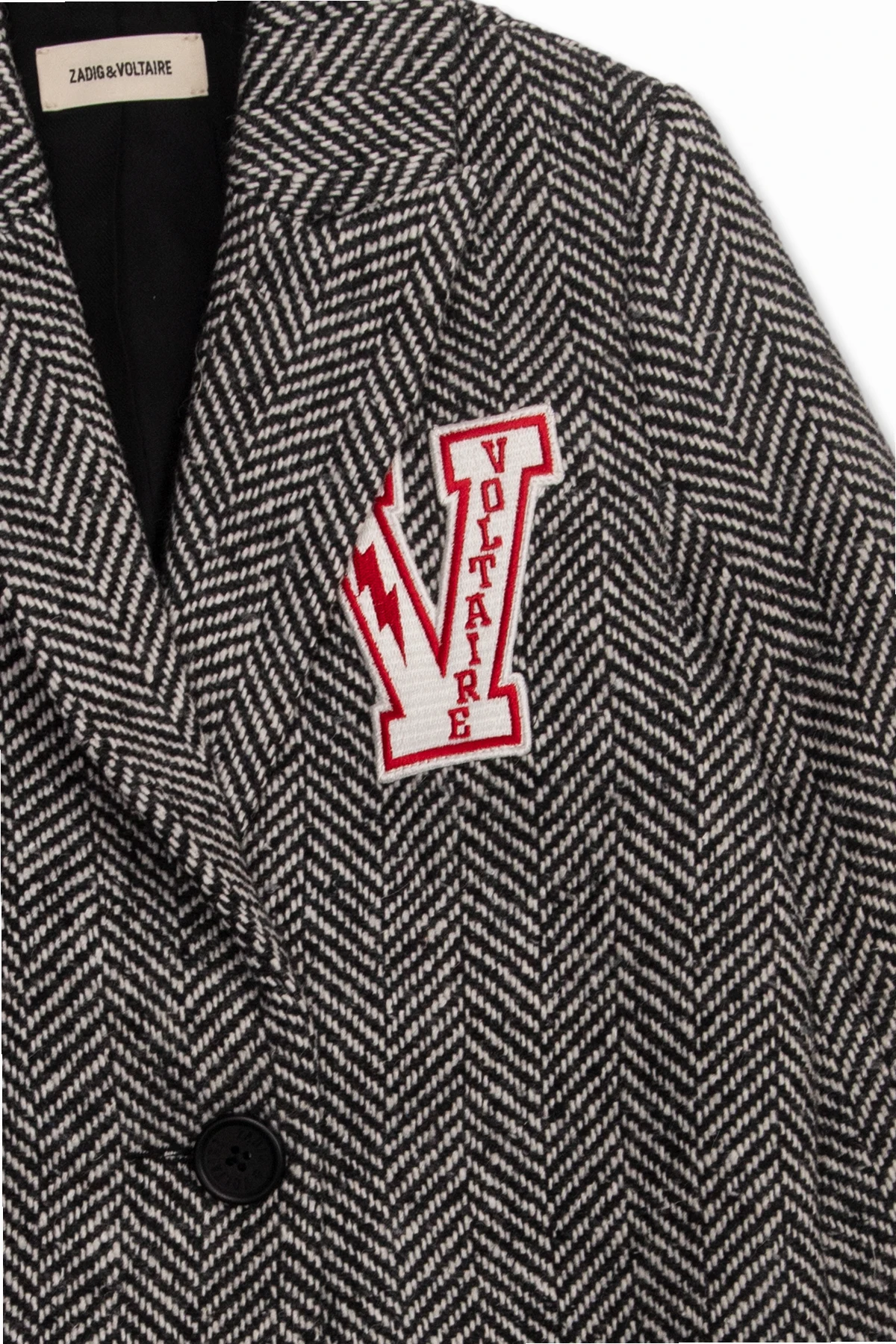 Czarno-biały płaszcz Zadig & Voltaire Kids. Wykonany z wełny. Zapinany na guzik. Ozdobiony wzorem w jodełkę oraz naszywką z logo. Dwie kieszenie wsuwane. Zamknięte klapy.