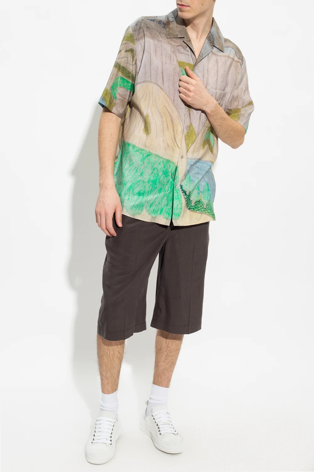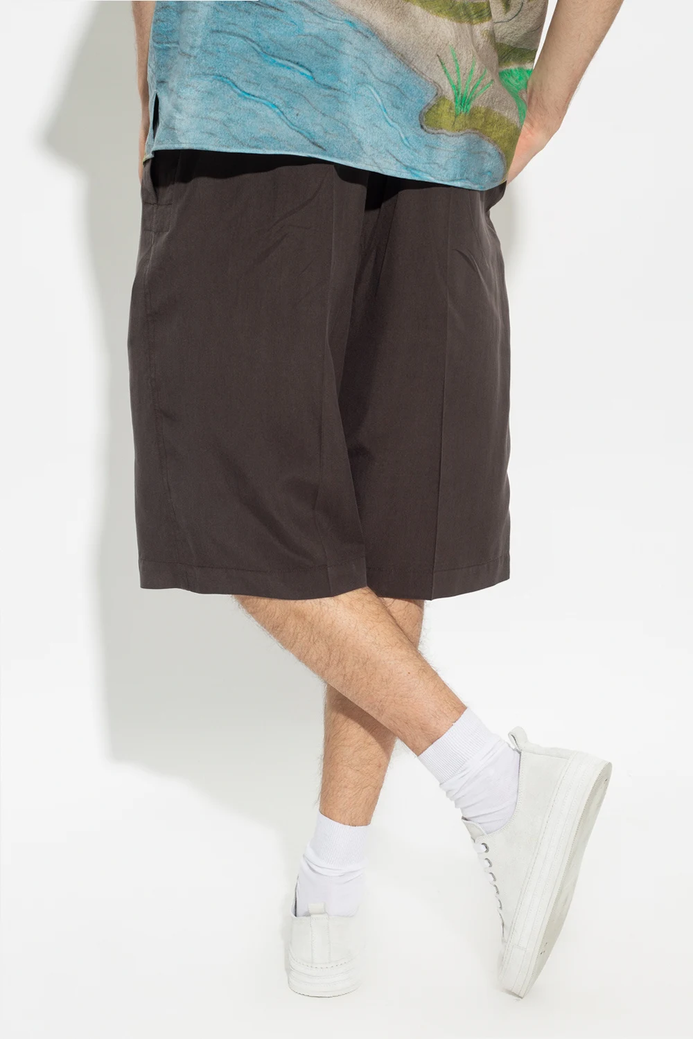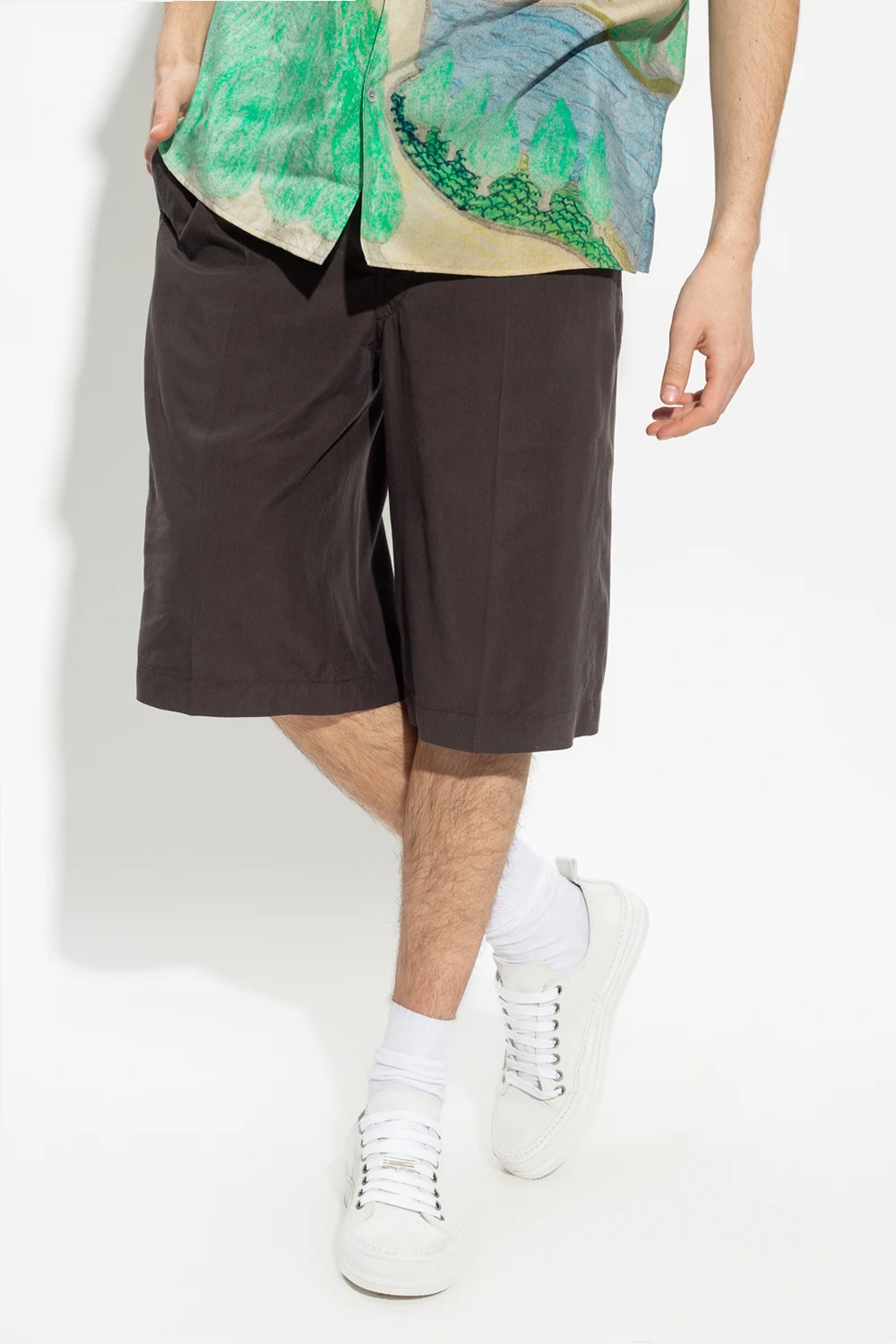 Ciemnobrązowe, jedwabne szorty o luźnym kroju Lemaire. Zapinane na guziki ‘Corozo’ . W pasie wszyta guma. Trzy kieszenie: dwie wsuwane z przodu oraz zapinana na guzik z tyłu. Nogawki w kant.