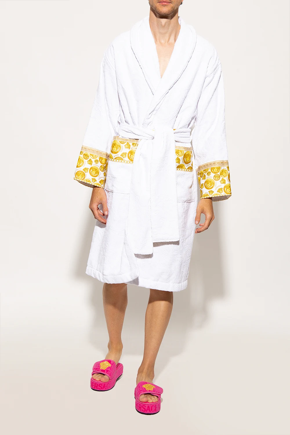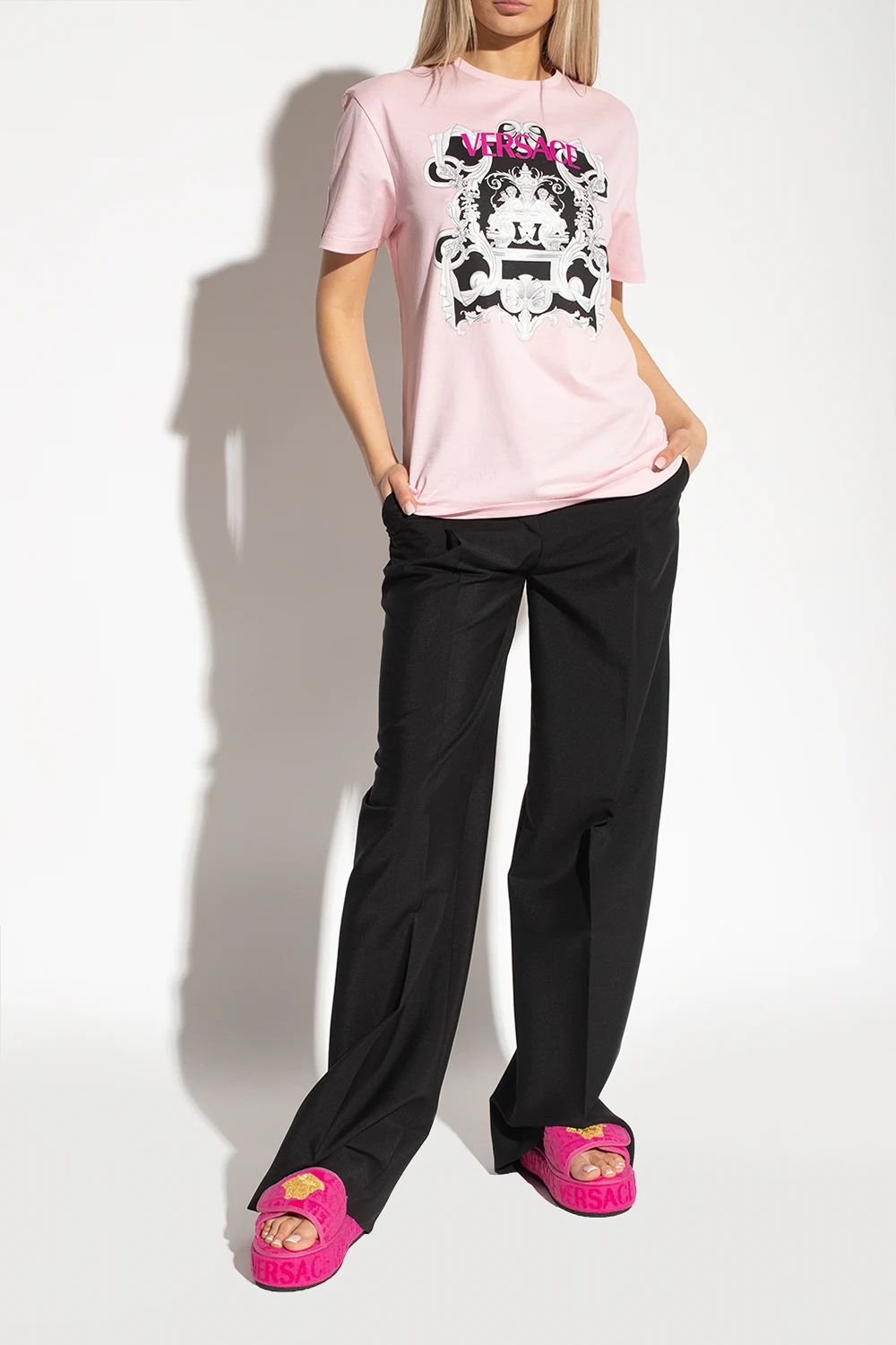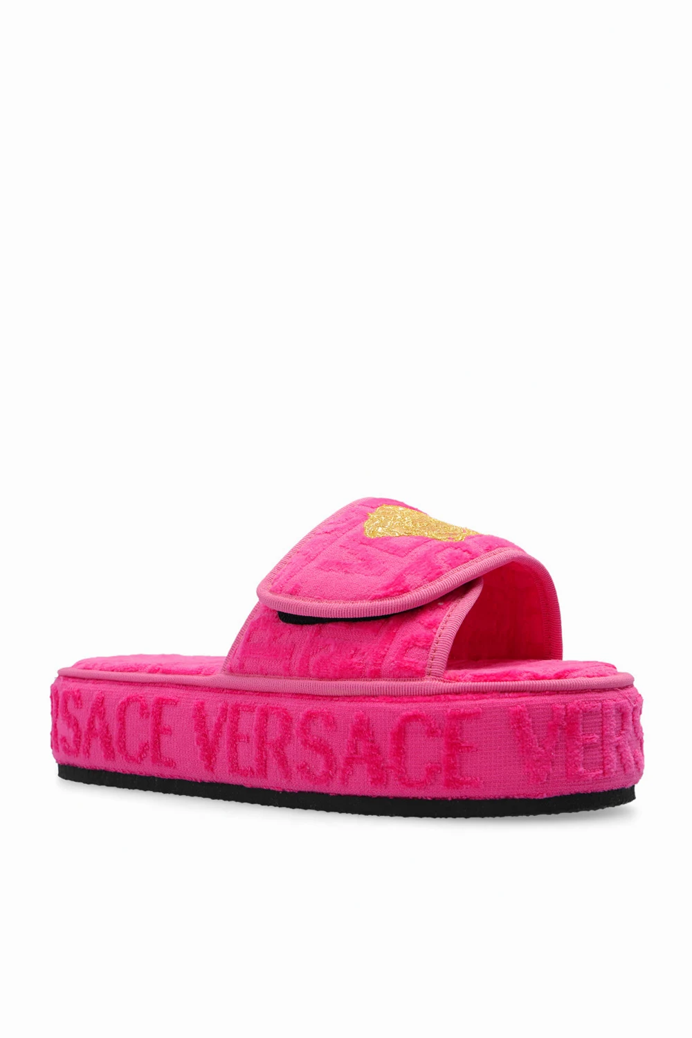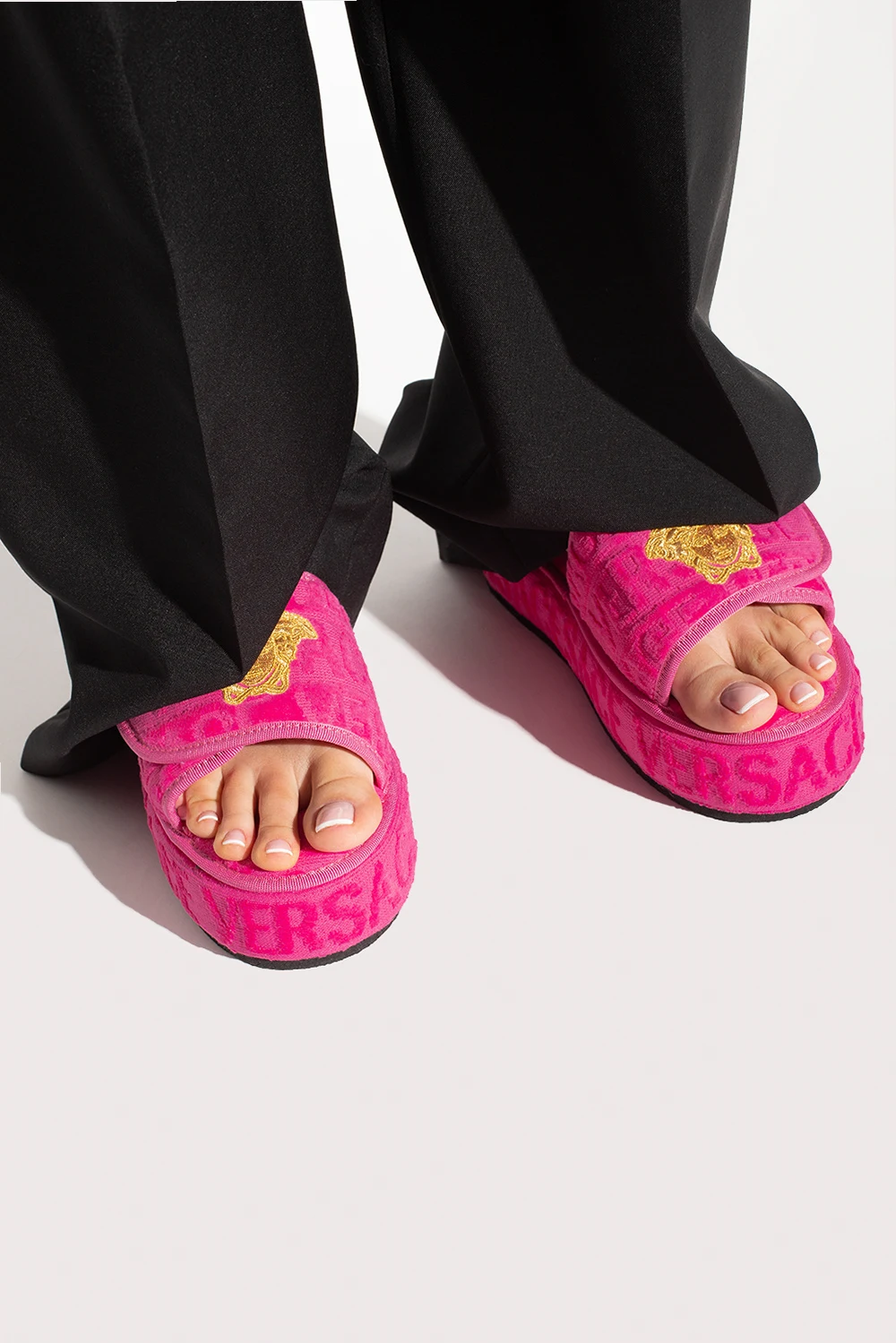 Różowe klapki na platformie Versace. Wykonane z bawełny. Zapinane na rzep. Ozdobione wyszytym logo i charakterystyczną głową Meduzy w kolorze złotym.