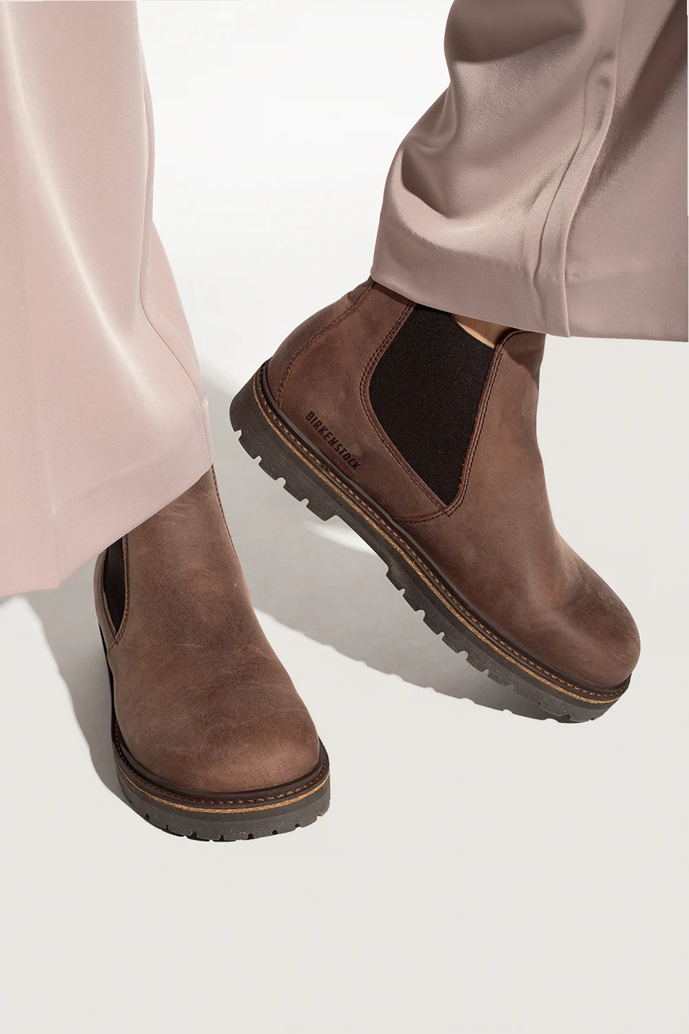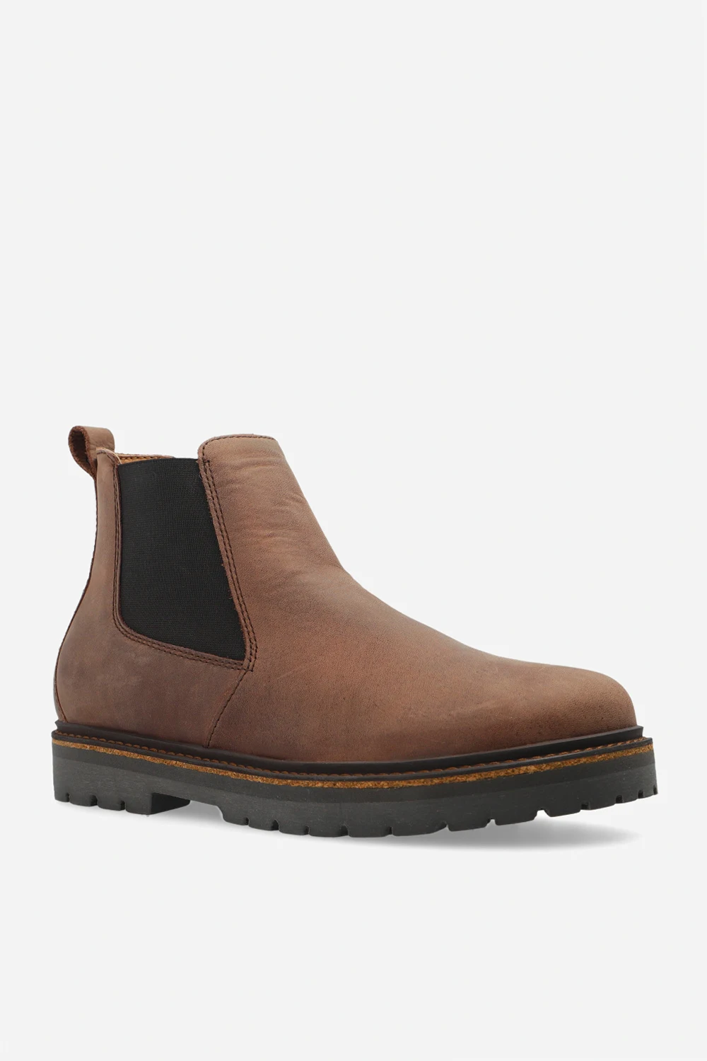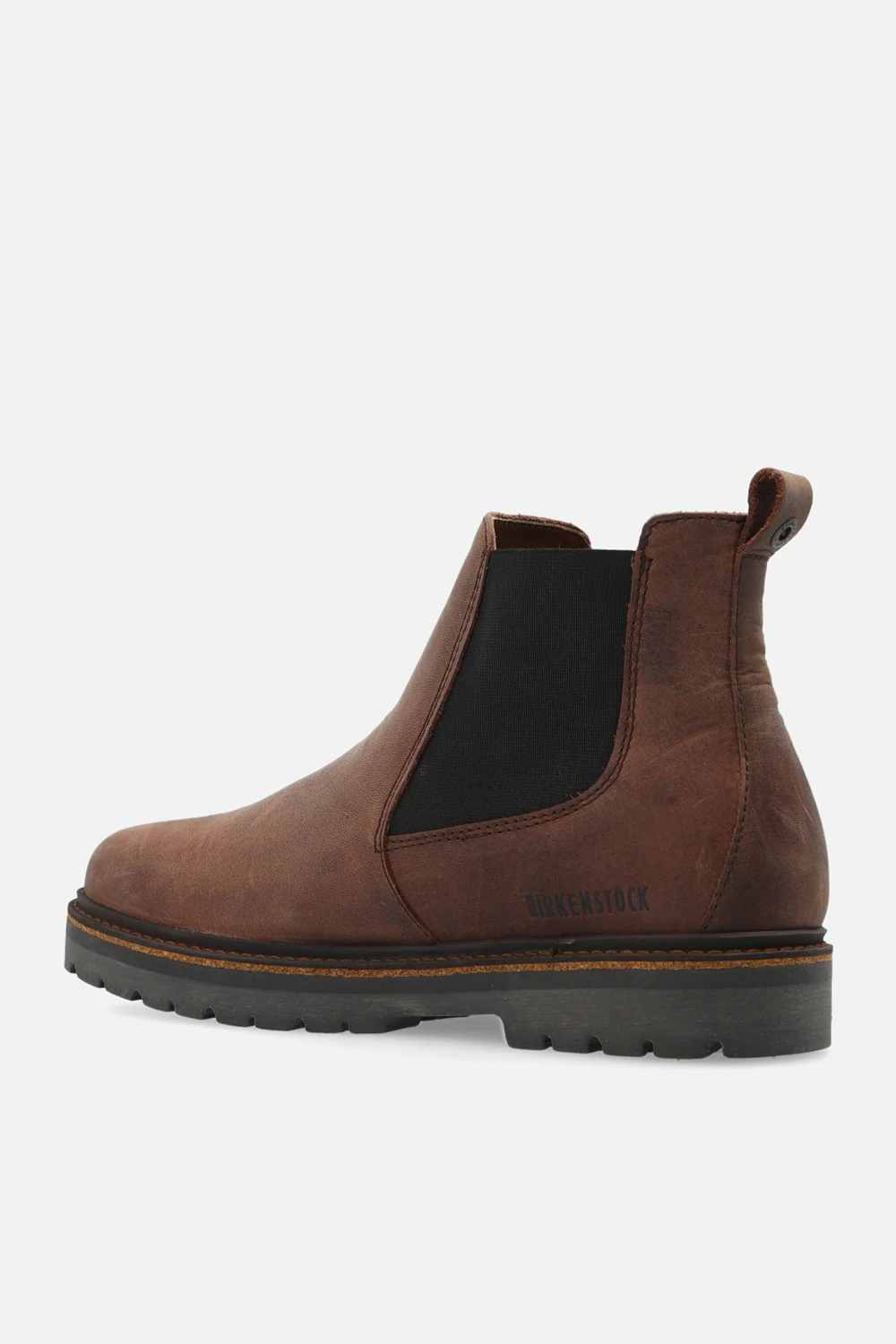 Brązowe, wsuwane botki, model ‘Stalon II’ Birkenstock. Cholewka wykonana z olejowanej skóry nubukowej. Po bokach wszyta guma. Profil ozdobiony wytłoczonym logo. Wyjmowana, anatomicznie ukształtowana wkładka korkowo-lateksowa. Brązowa, antypoślizgowa podeszwa wykonana z gumy.