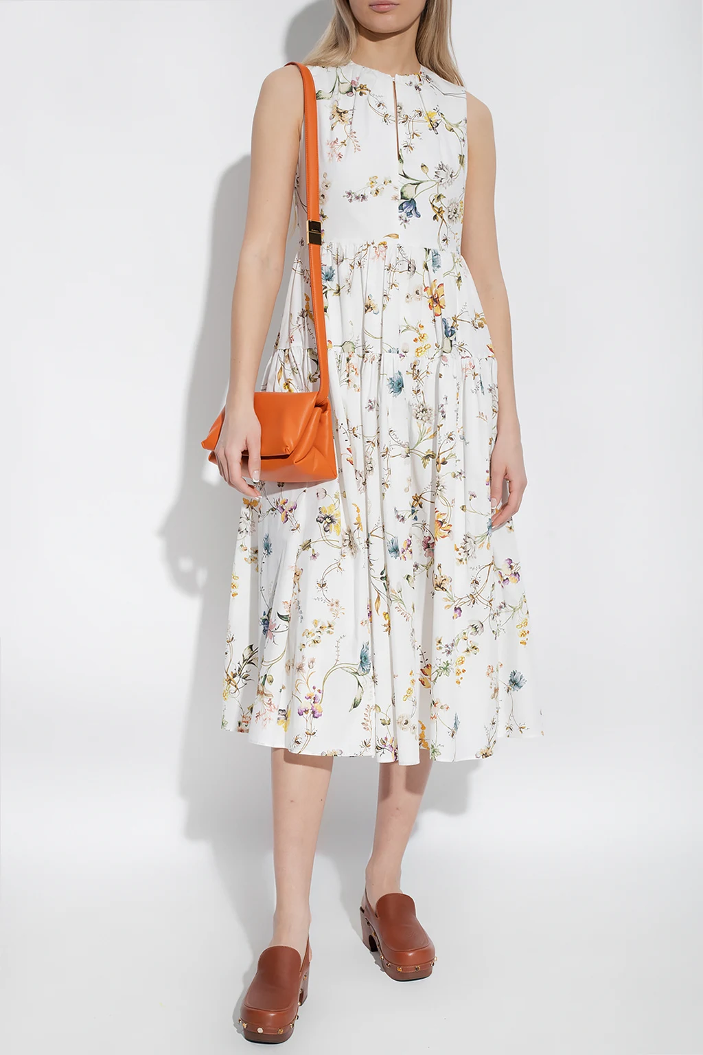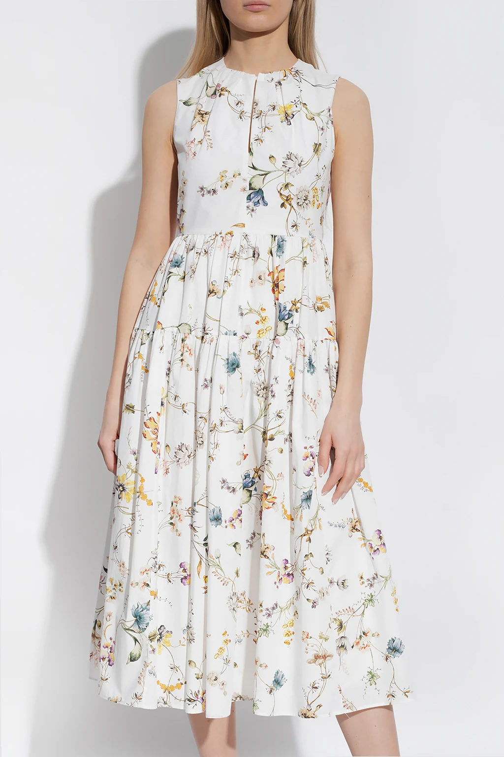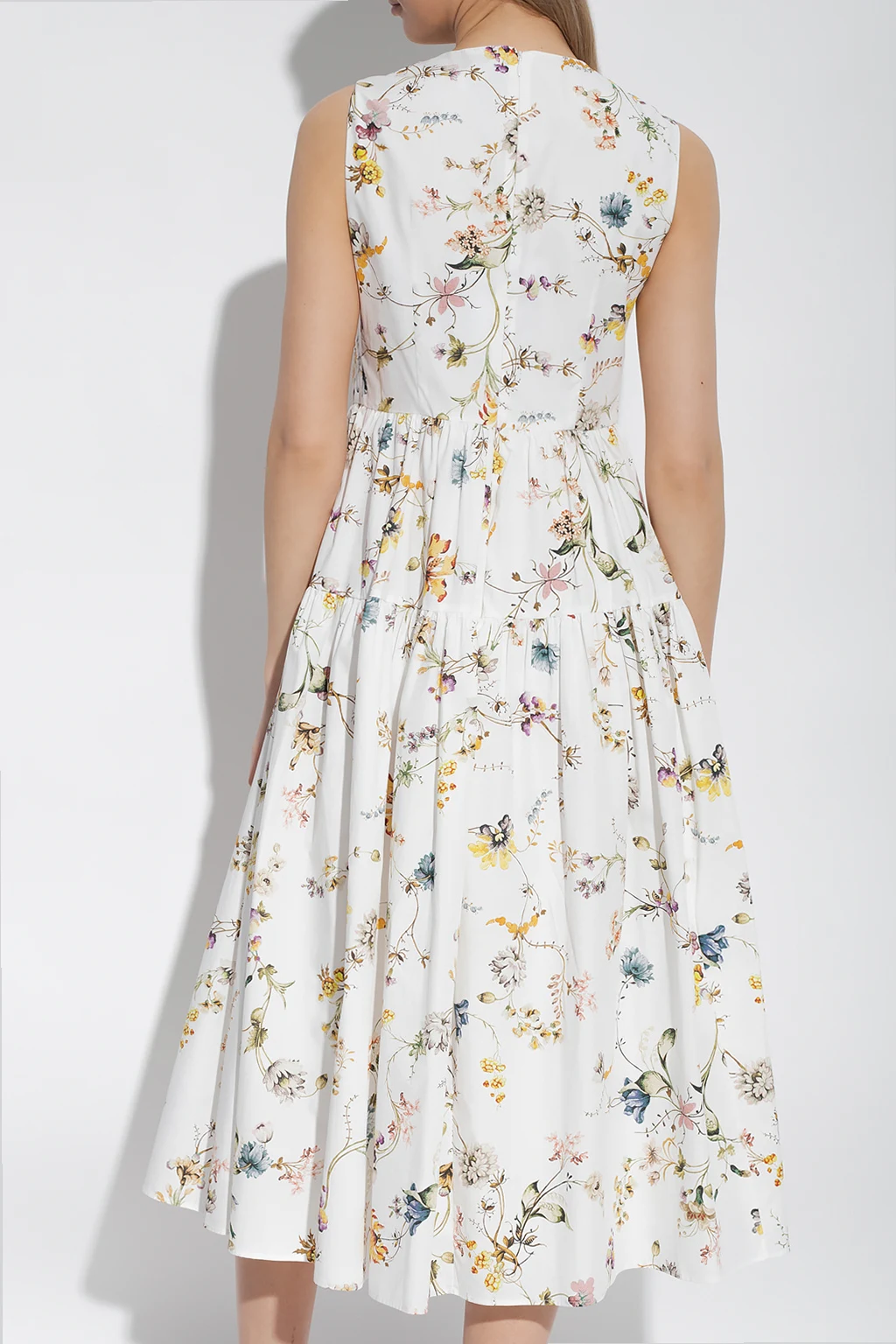 Biała sukienka bez rękawów, model ‘Eleonore’ Erdem. Wykonana z bawełny. Zapinana z tyłu na kryty zamek. Ozdobiona kolorowym wzorem z motywem kwiatowym ‘Laurenson Vine’, inspirowanym motywami z XVIII wieku. Okrągły dekolt z wycięciem zapinanym na guzik. Rozszerzany dół.