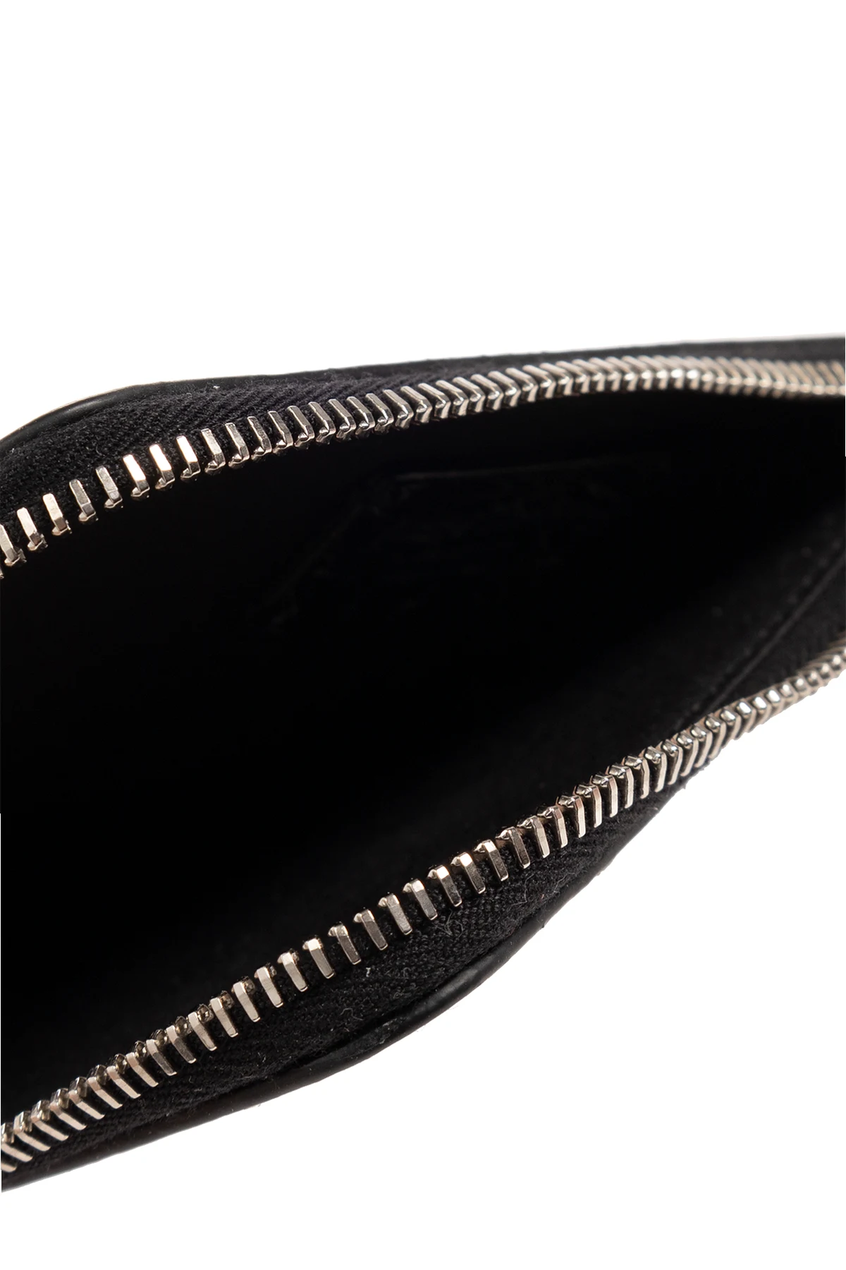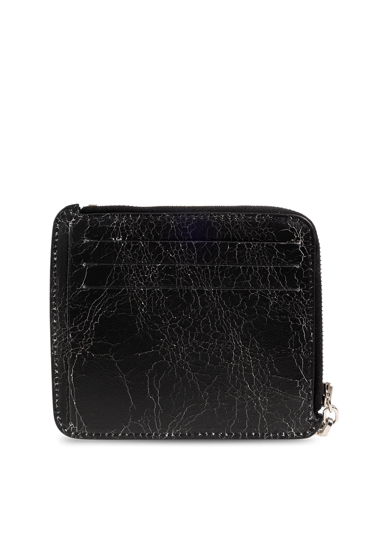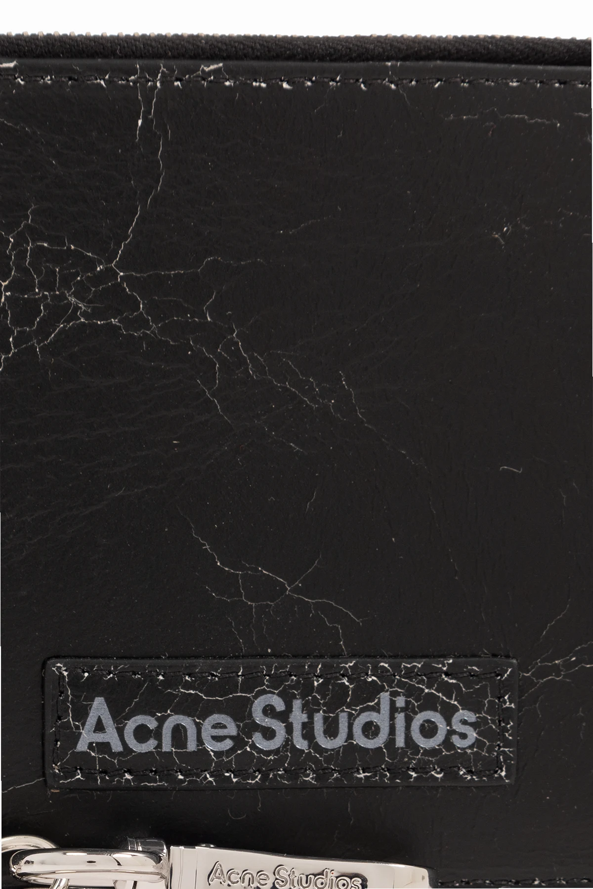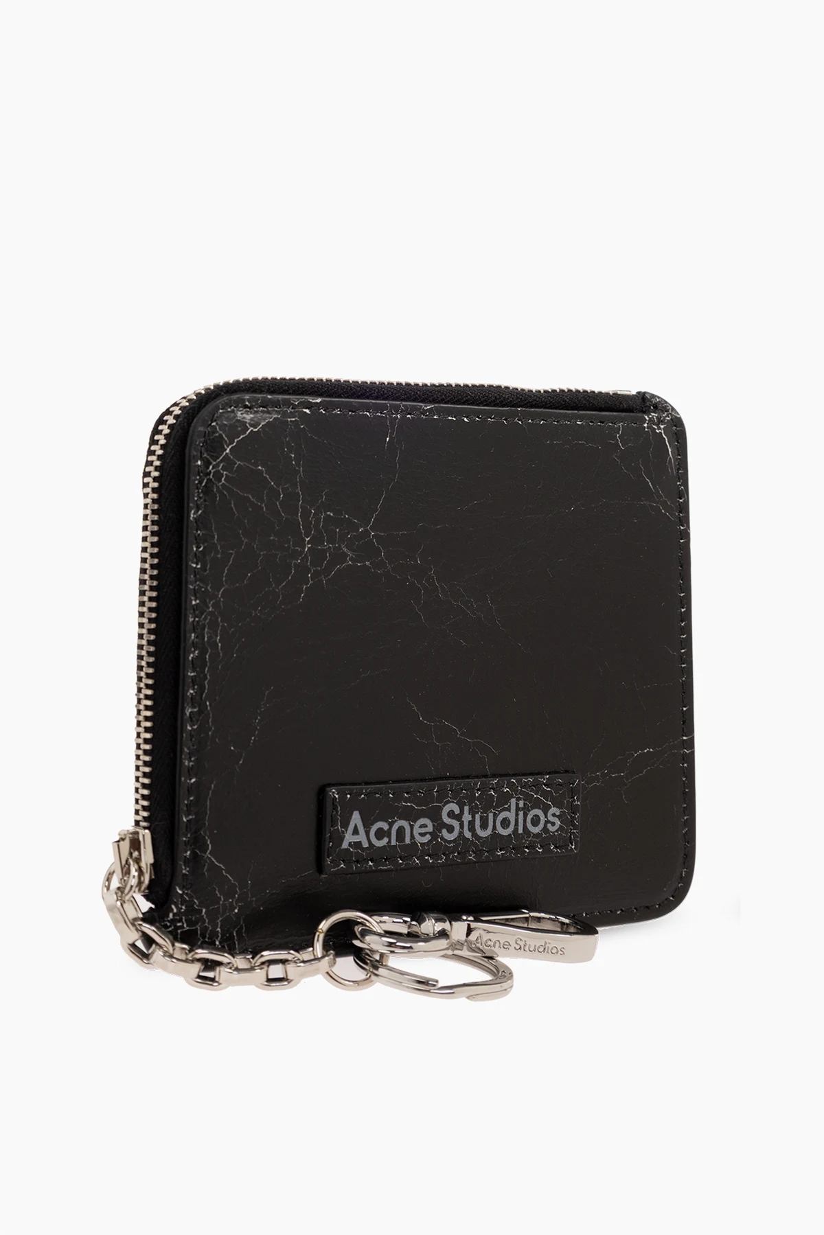 Czarny portfel na łańcuchu Acne Studios. Wykonany ze skóry o postarzanej i popękanej fakturze. Zamykany na zamek z dołączonym brelokiem i karabińczykiem na łańcuchu. Z przodu naszywka z logo. Z tyłu wsuwana kieszeń i trzy miejsca na karty. Wewnątrz komora.
