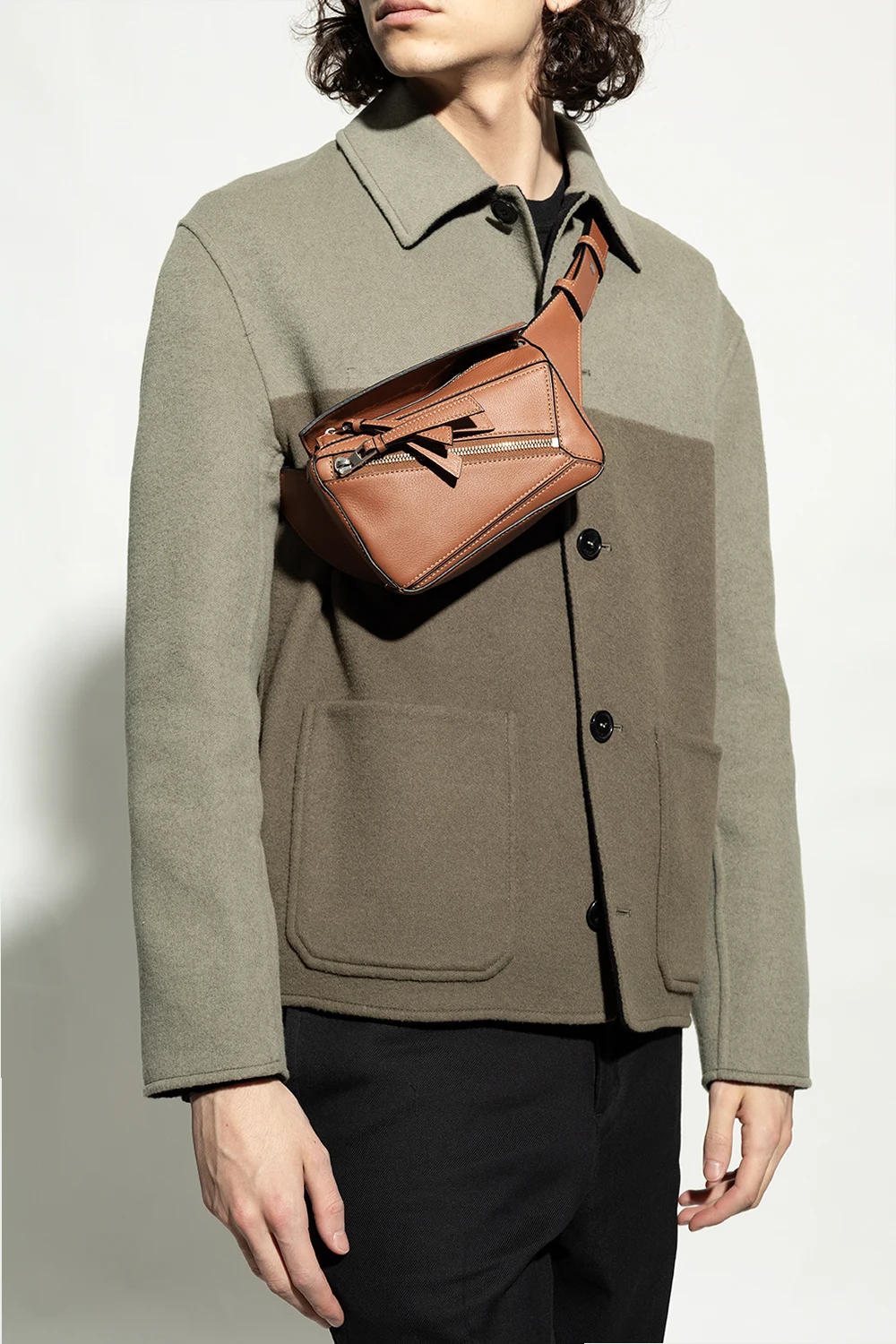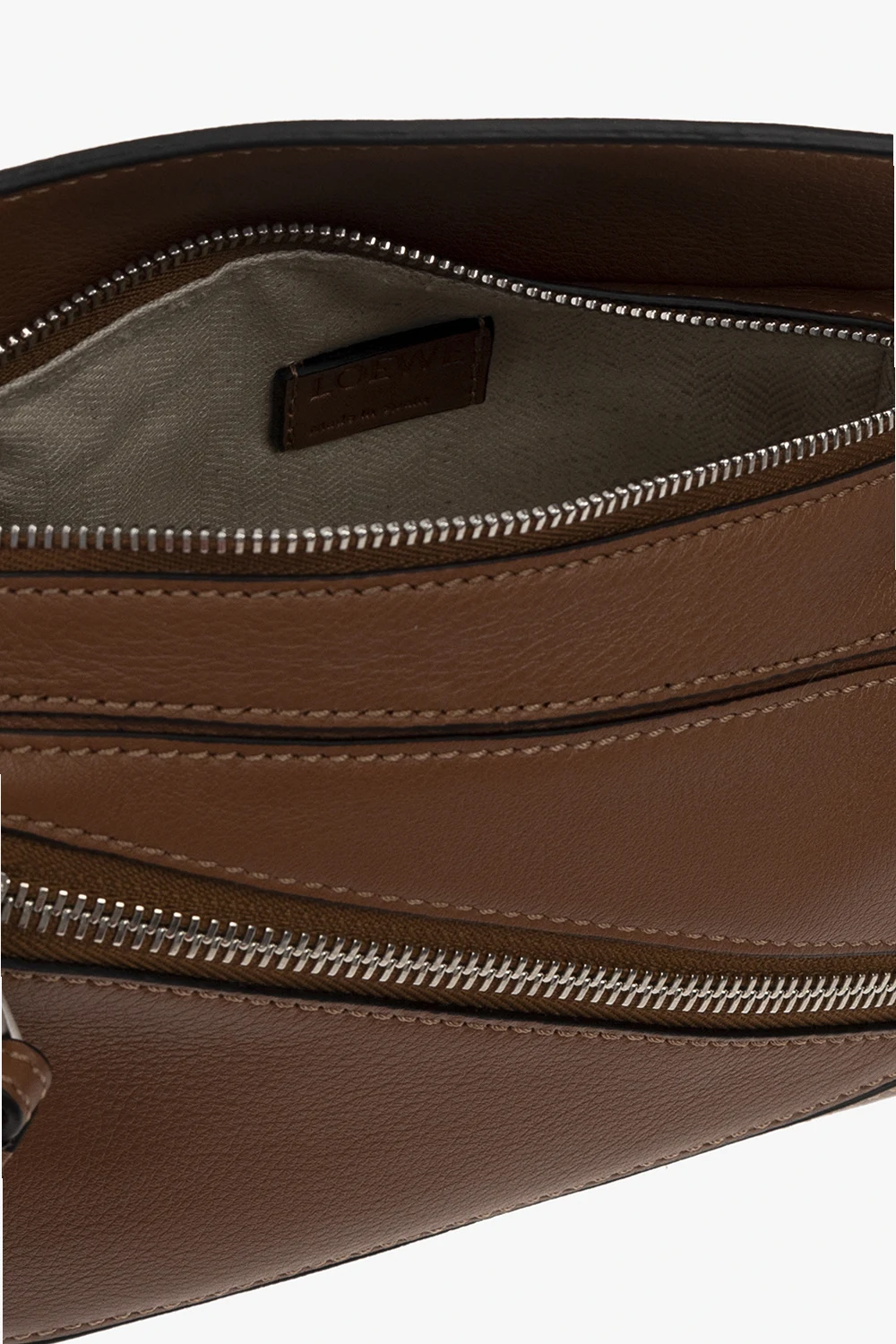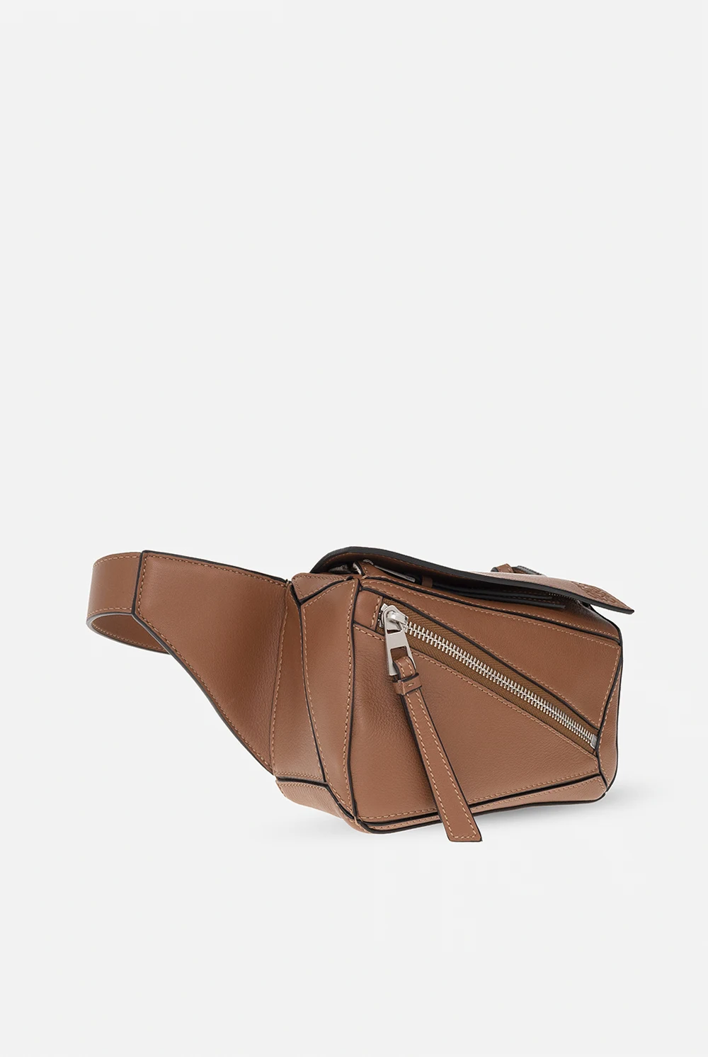 Brązowa torba na pas, model ‘Puzzle Mini’ Loewe. Wykonana ze skóry cielęcej. Zamykana na klapę z wytłoczonym logo ‘Anagram’ oraz zamek. Ozdobiona asymetrycznymi naszywkami. Z przodu kieszeń z zamknięciem na zamek. Regulowany pas z zapinany na zatrzask. Wewnątrz komora. Metalowe wykończenie w kolorze srebrnym.