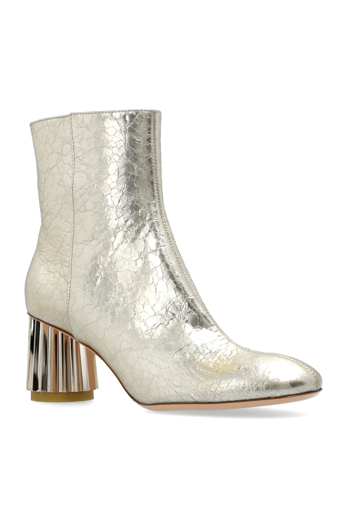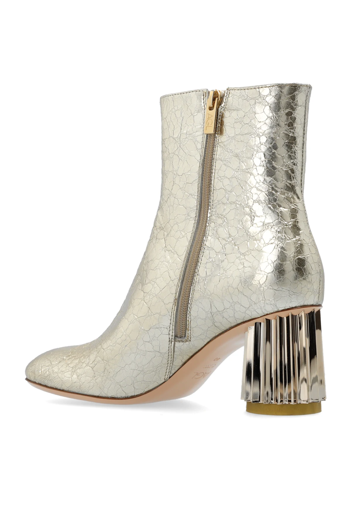 Botki na obcasie w kolorze złotym, model ‘Dorica’ AGL. Wykonane ze skóry z efektem pogniecenia. Zapinane z boku na zamek. Zaokrąglony nosek. Dekoracyjny obcas. Pudroworóżowa, skórzana podeszwa.
