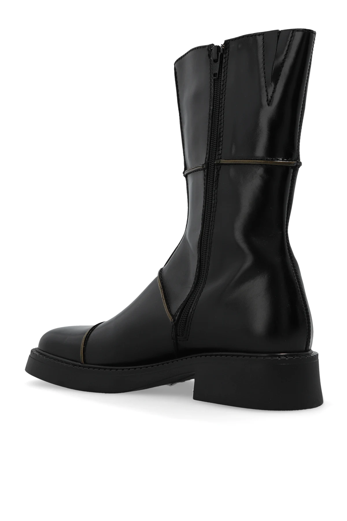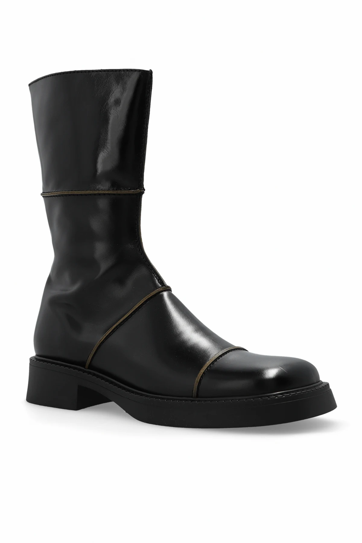 Czarne botki, model ‘Dahlia’ Miista. Wykonane ze skóry. Ozdobione surowym szwem. Z boku zapięcie na zamek. Migdałowy nosek. Czarna, gumowa podeszwa.