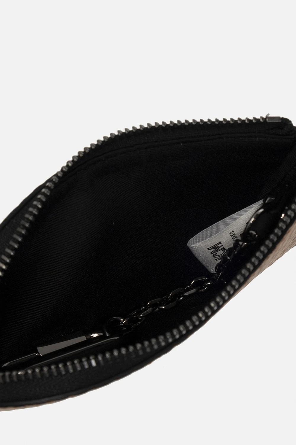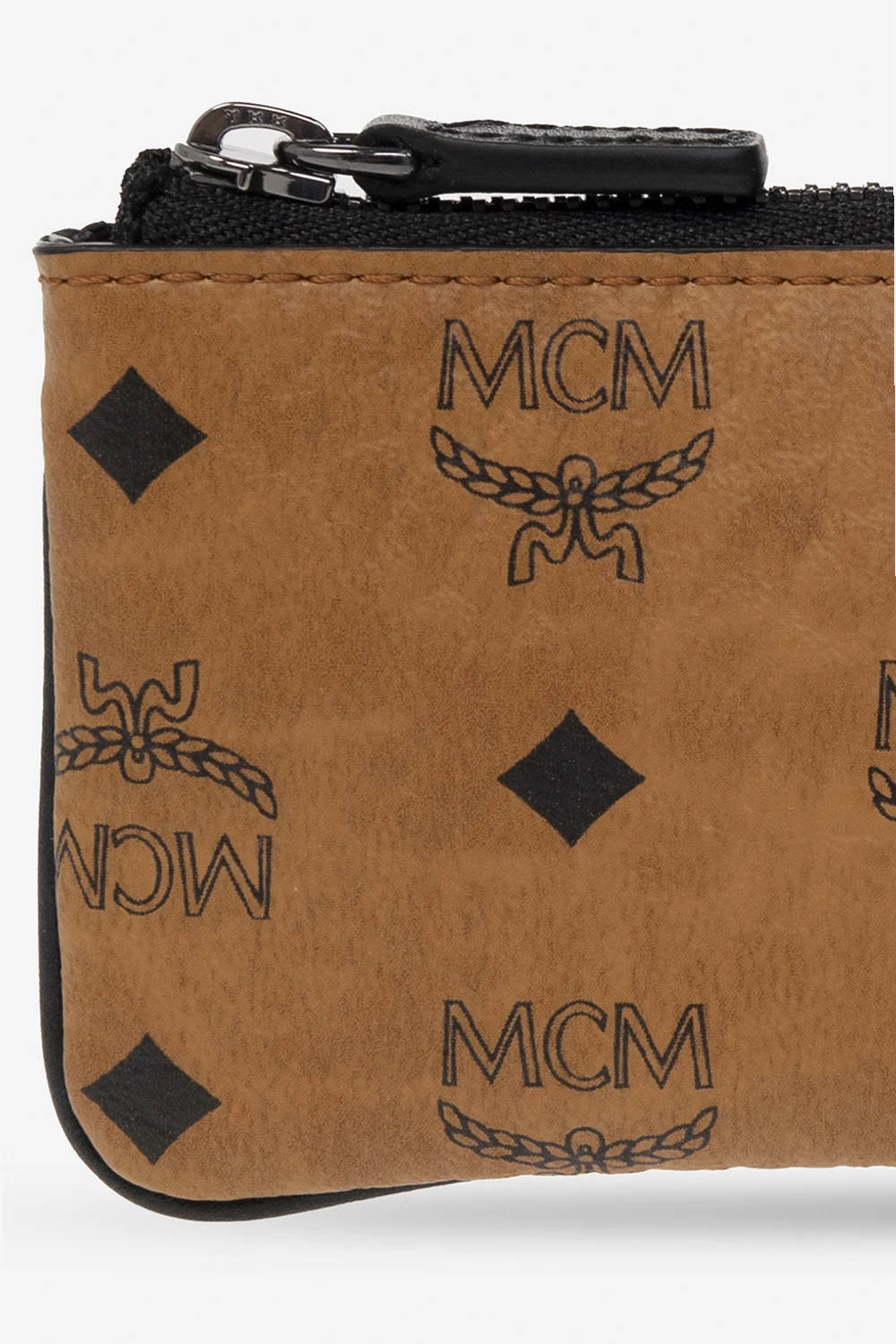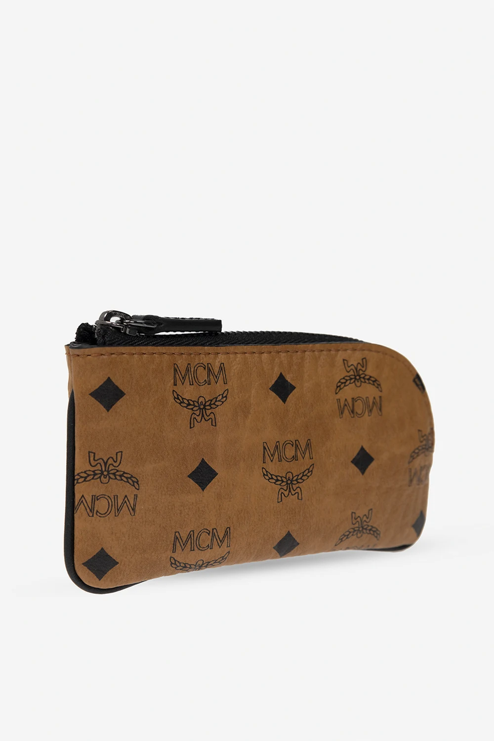 Brązowe etui na klucze MCM. Wykonane charakterystycznego płótna ‘Visetos’ ozdobionego czarnym monogramem. Zamykane na zamek. Wewnątrz komora i brelok na łańcuchu.
