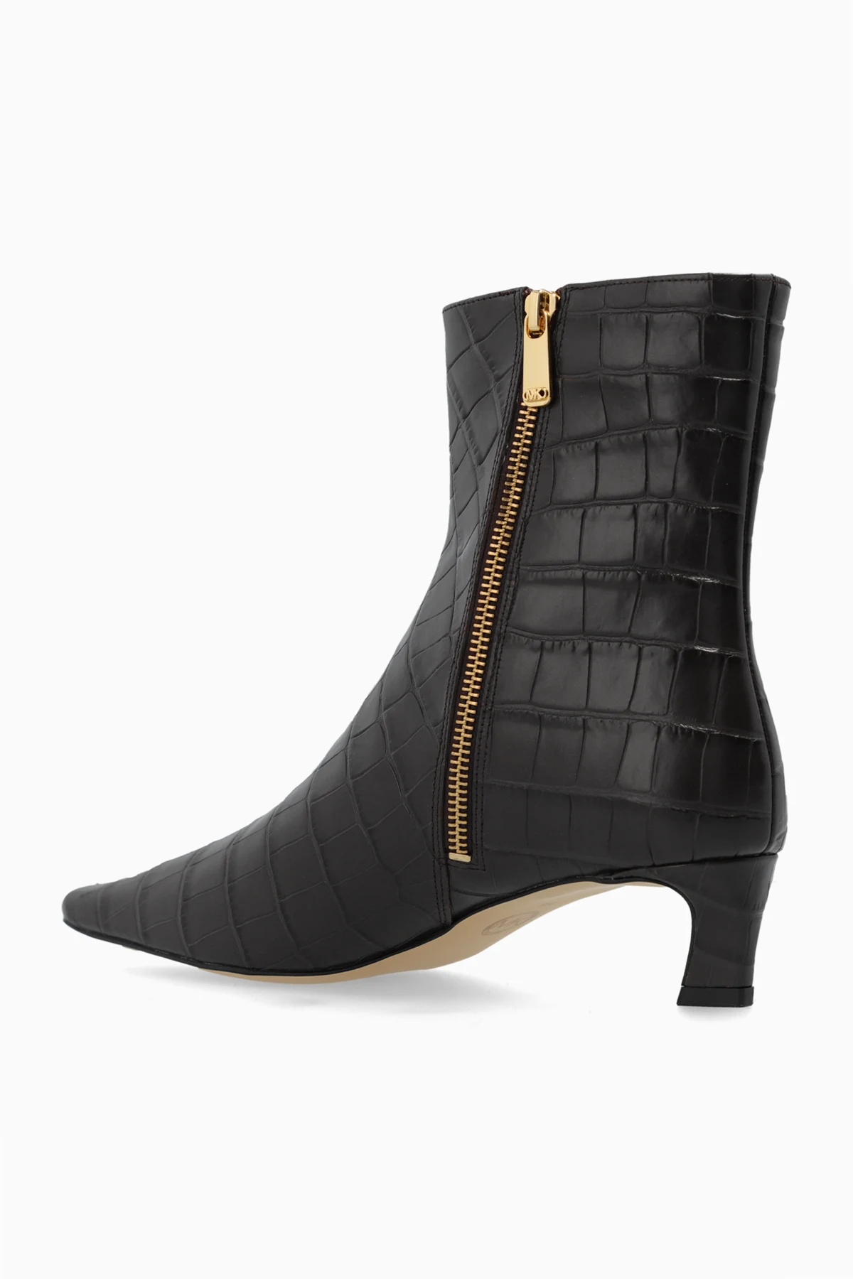 Detale: Złoty zamek błyskawiczny, umieszczony po wewnętrznej stronie butów, ułatwia ich zakładanie i zdejmowanie, a jednocześnie stanowi istotny element dekoracyjny. Wnętrze butów jest wyściełane, co zapewnia komfort noszenia, a na wkładce wewnątrz buta widnieje napis "MICHAEL MICHAEL KORS", świadczący o prestiżu marki.