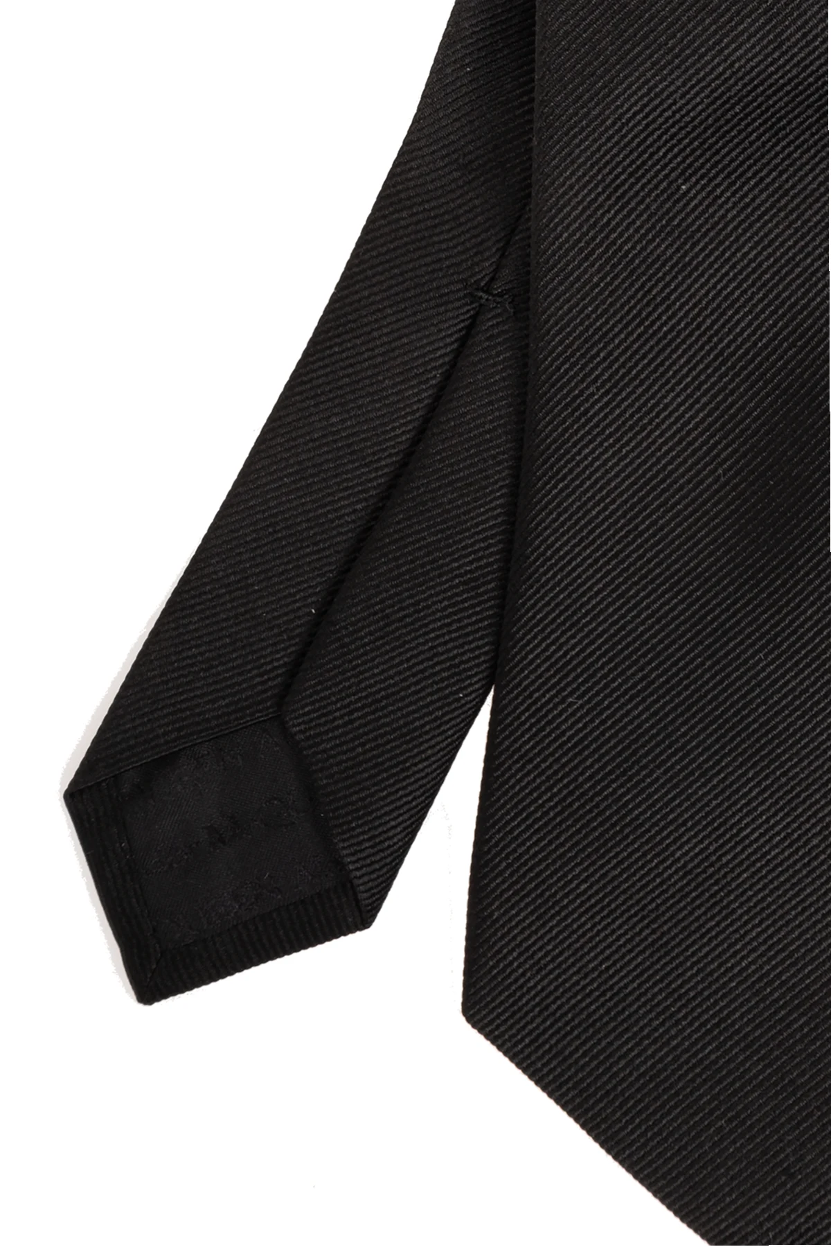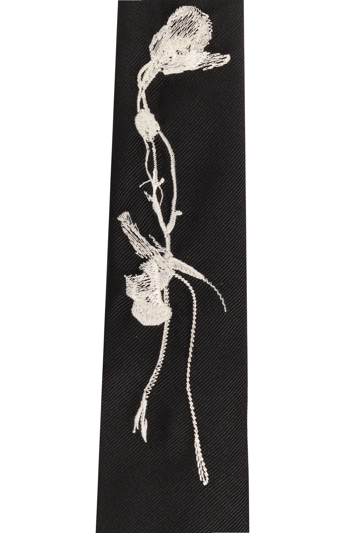 W dolnej części krawata umieszczona została haftowana etykieta z niewyraźnym logo projektanta, co stanowi subtelną, ale wyraźną wskazówkę co do jego pochodzenia z atelier Alexander McQueen .
