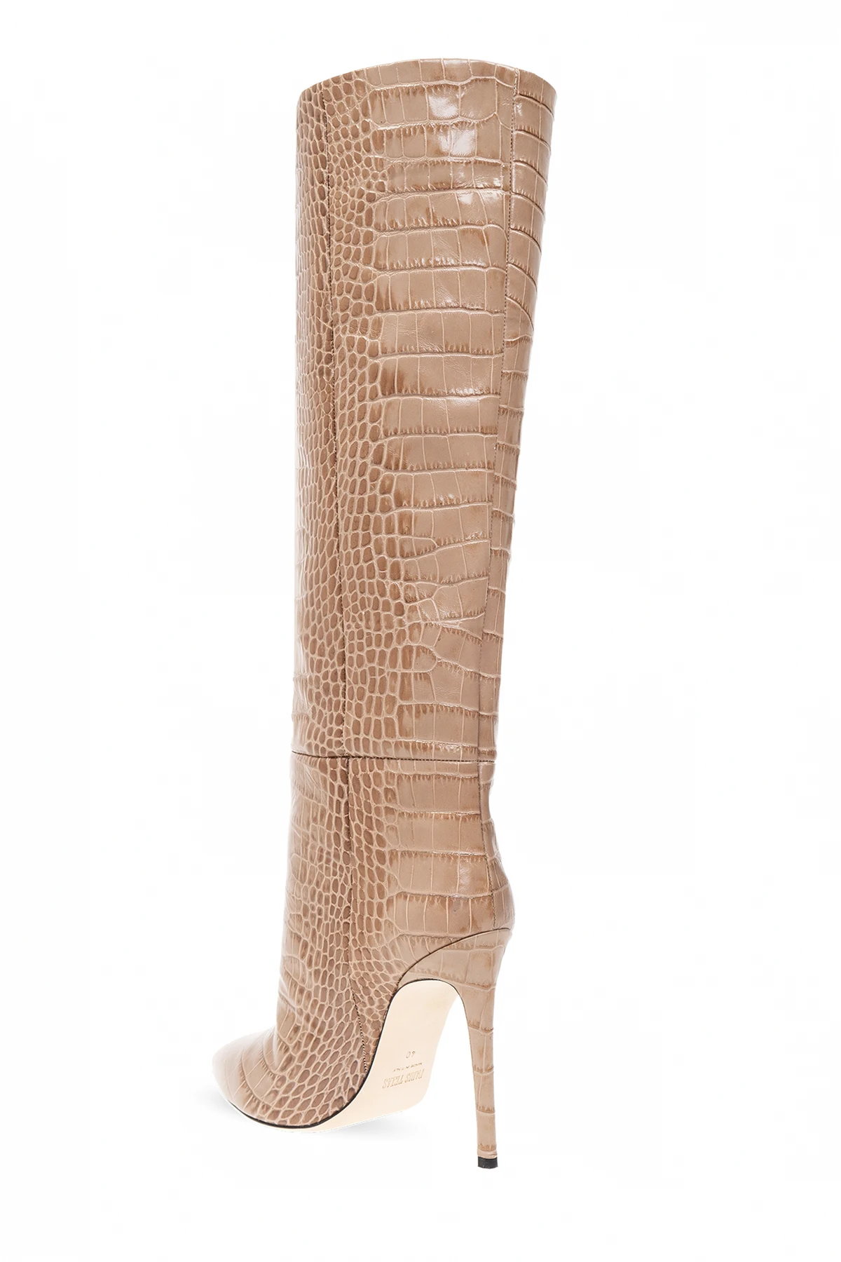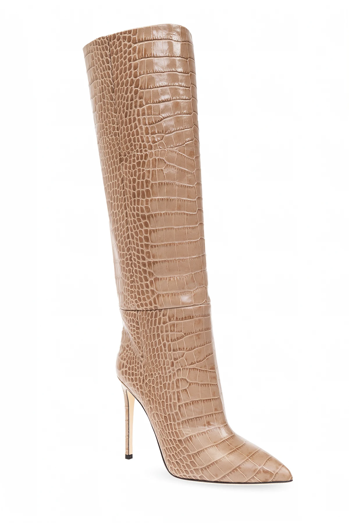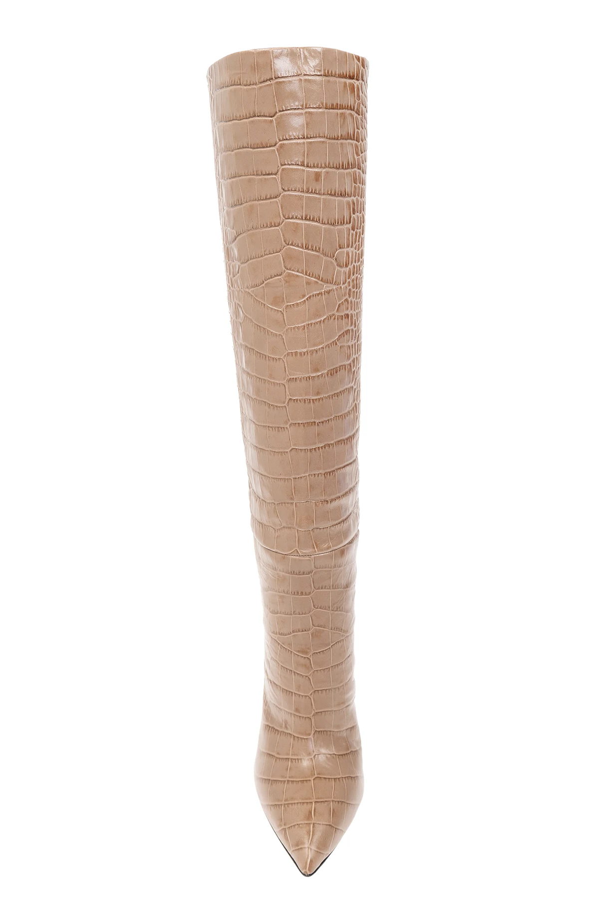 Beżowoszare, wsuwane kozaki na obcasie Paris Texas. Wykonane ze skóry imitującej skórę krokodyla. Nosek w szpic. Kremowa, skórzana podeszwa.