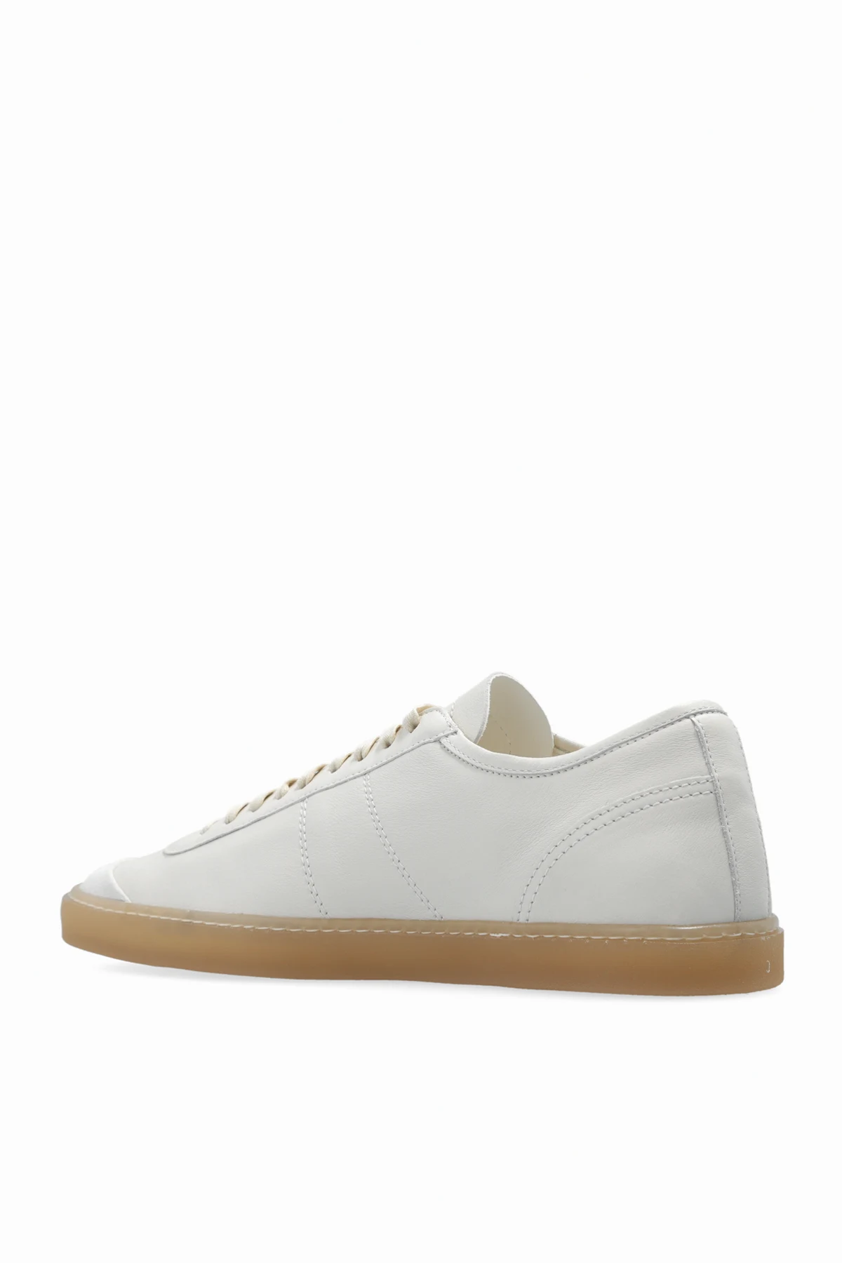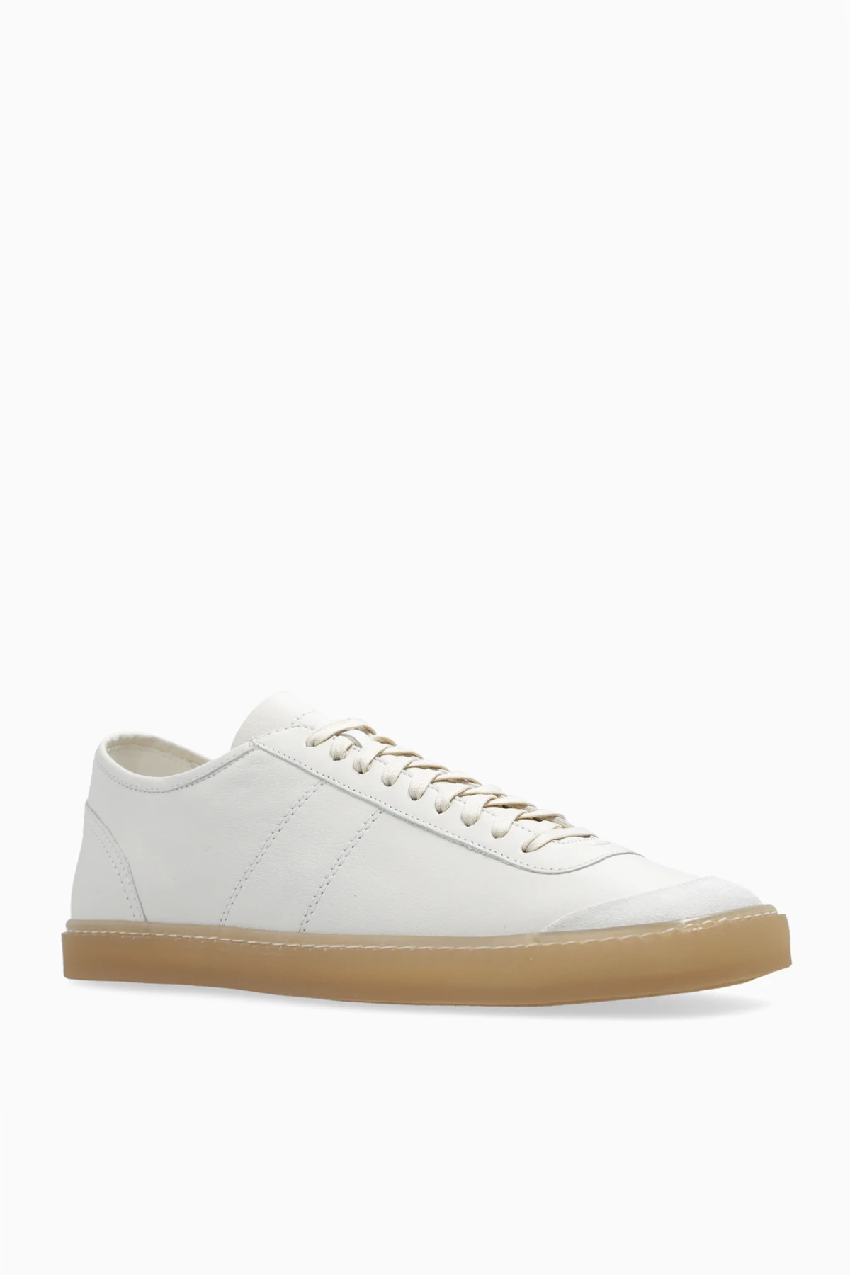 Kremowe, sznurowane buty sportowe Lemaire. Wykonane z krowiej skóry. Z przodu zamszowa wstawka. Transparentna podeszwa wykonana z gumy o specjalnej fakturze.
