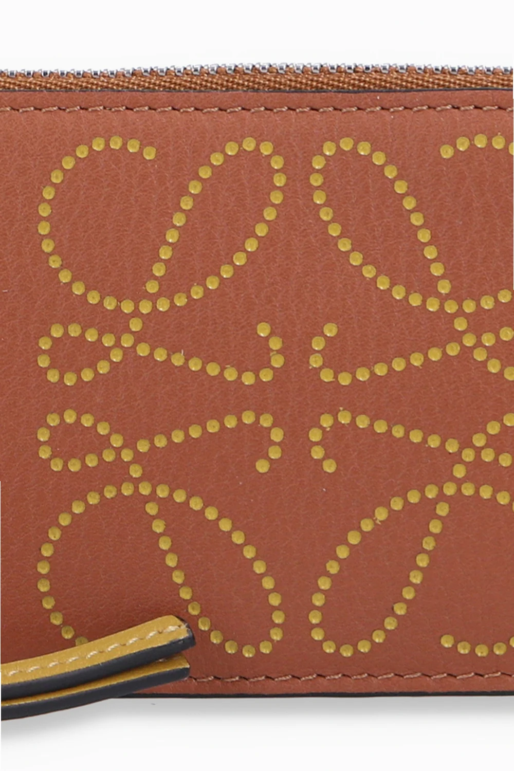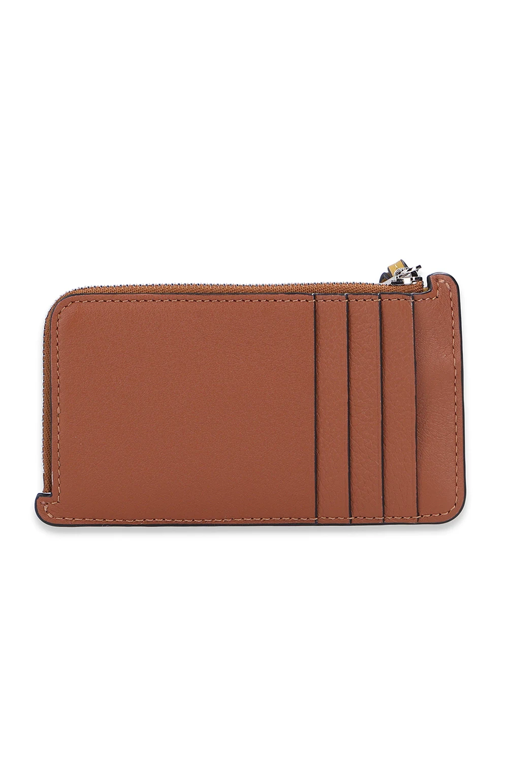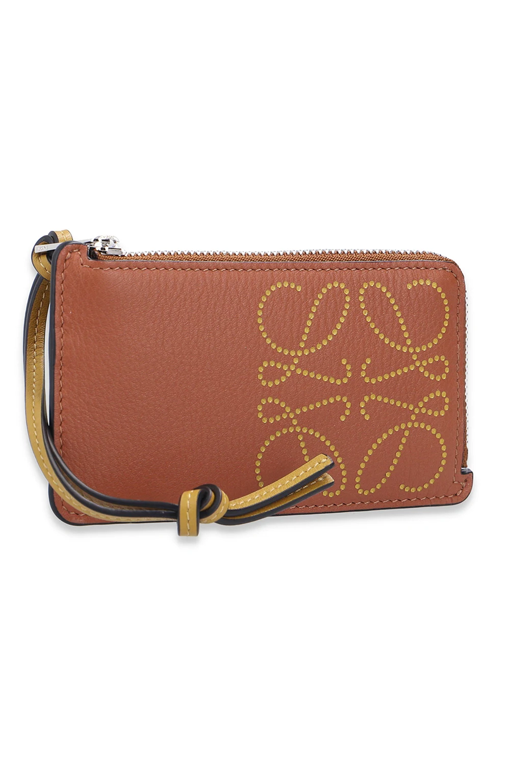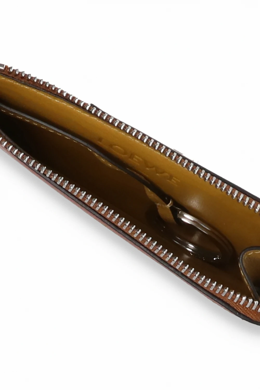 Brązowe etui na klucze Loewe. Wykonane ze skóry cielęcej. Zamykane na zamek. Ozdobione wytłoczonym wzorem z logo w kolorze żółtym. Cztery miejsca na karty. Wsuwana kieszeń.