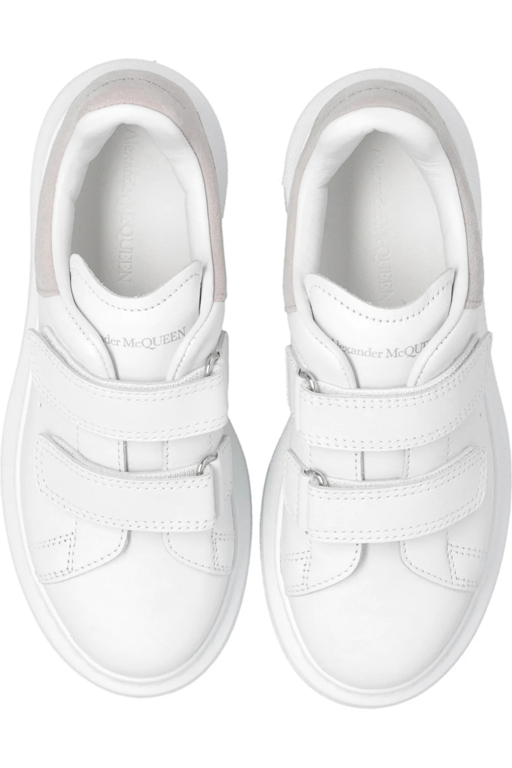 Białe buty sportowe Alexander McQueen Kids. Wykonane ze skóry i wykończone zamszem. Cholewka zapinana na podwójne rzepy i ozdobiona z przodu nadrukowanym logo. Zapiętek w kolorze pudrowego różu. Biała, gumowa podeszwa.