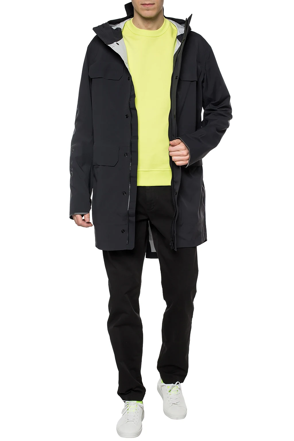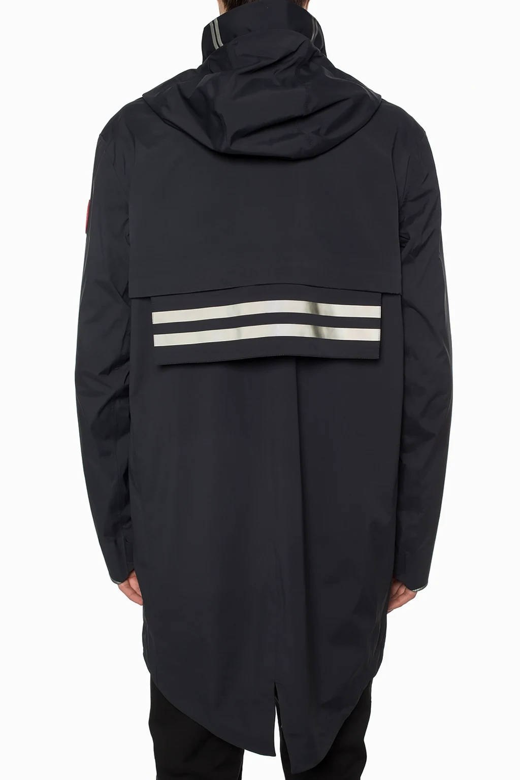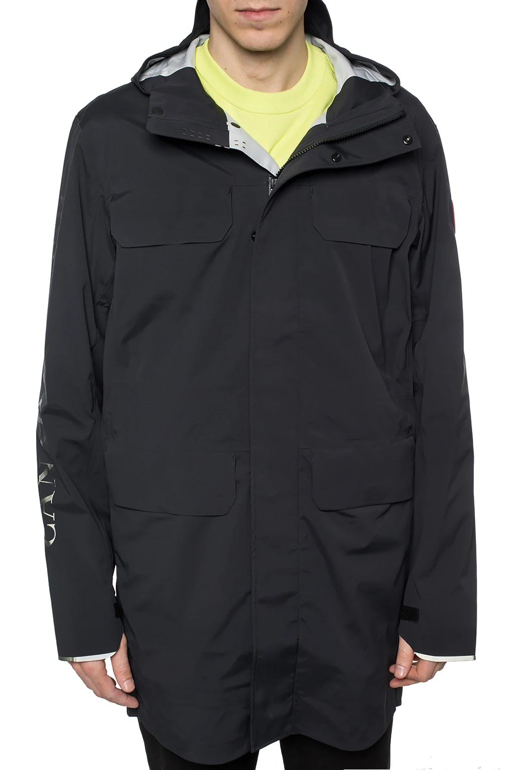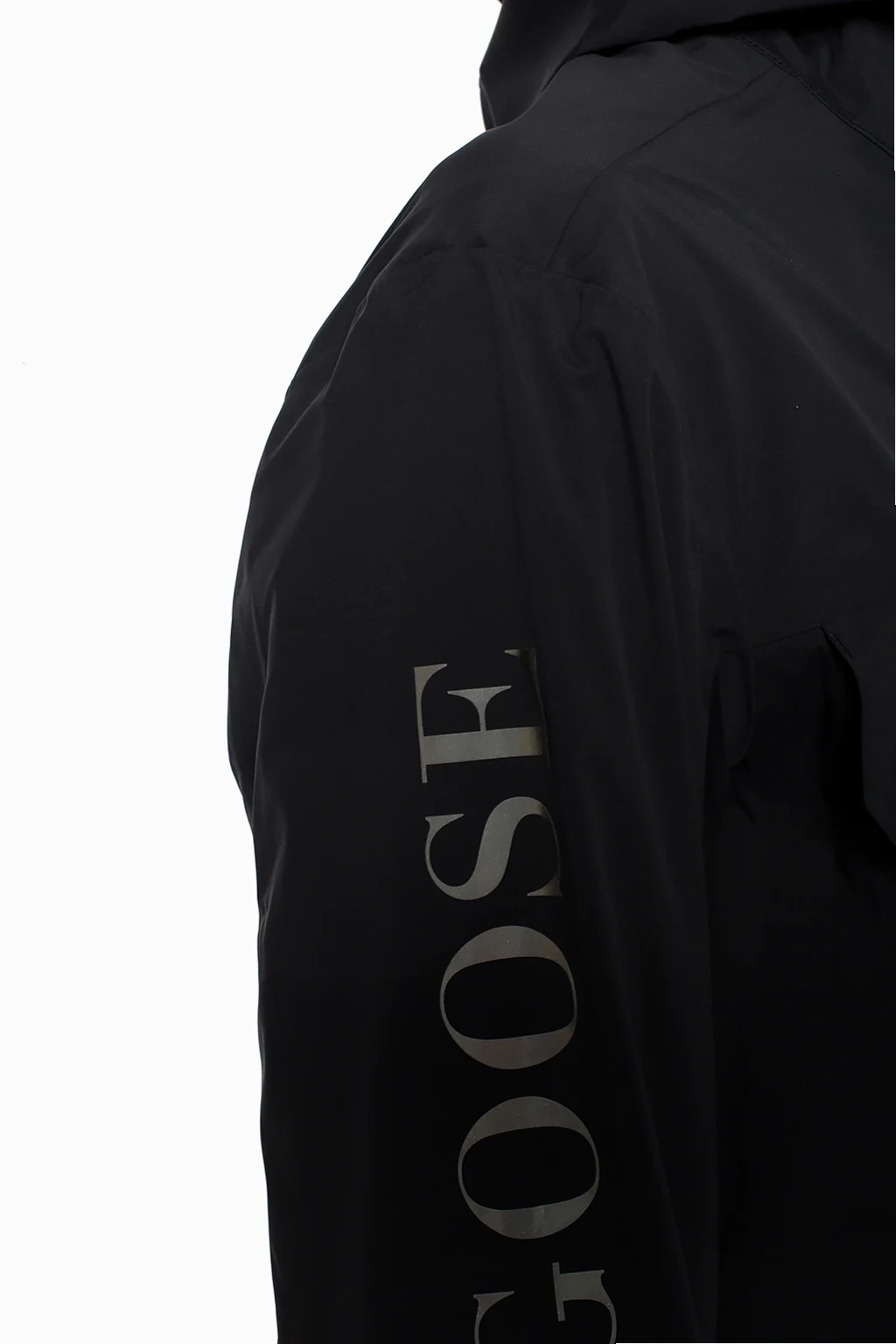Czarna kurtka z kapturem, model 'Seawolf' Canada Goose. Zapinana na dwubiegunowy zamek i zatrzaski z krytą plisą. Rękawy, tył i kaptur ozdobione odblaskowymi nadrukami. Z przodu cztery kieszenie z patkami zapinane na rzep. Na rękawie aplikacja z wyszytym logo w kolorze czerwono-biało-granatowym. Zakres temperatur 5°C do -5°C.