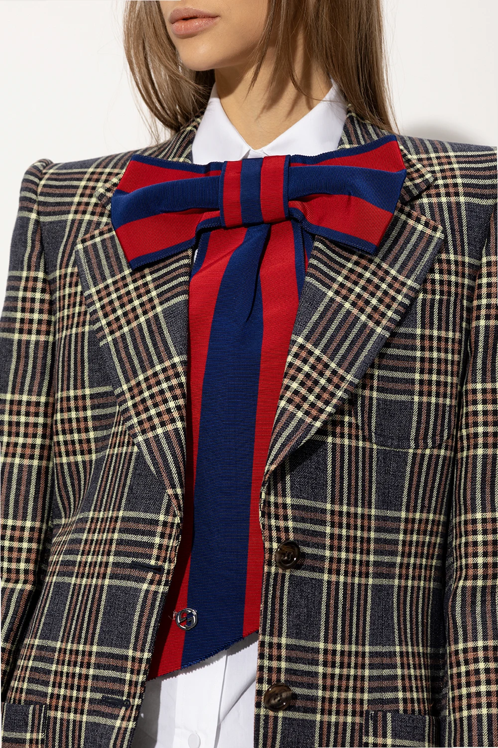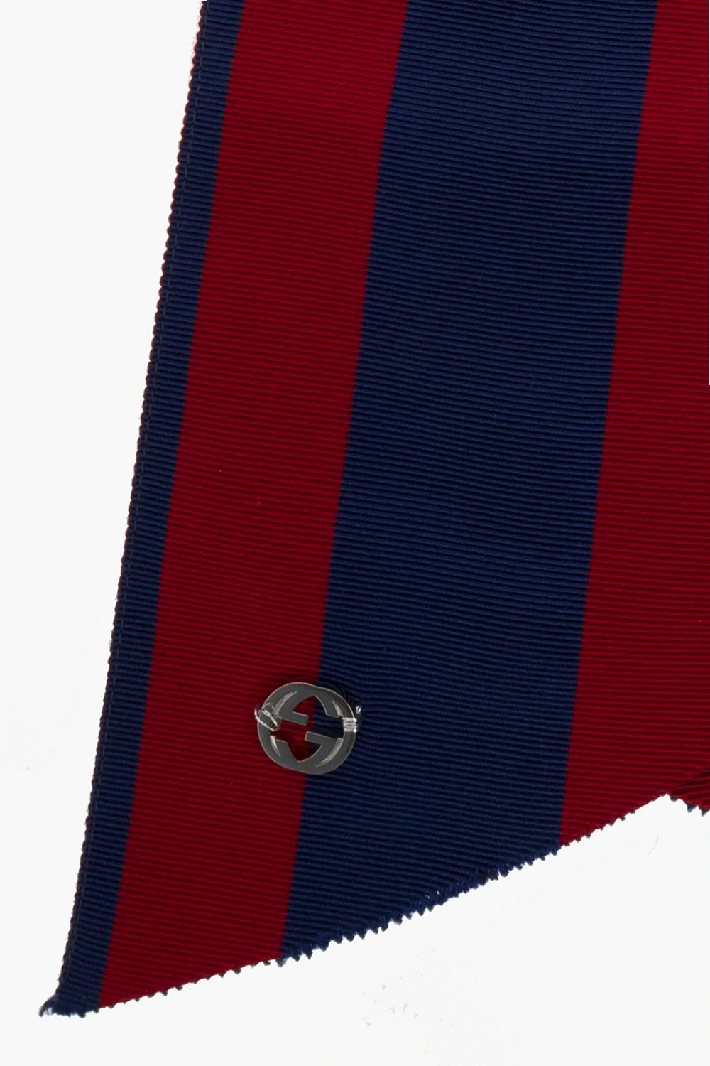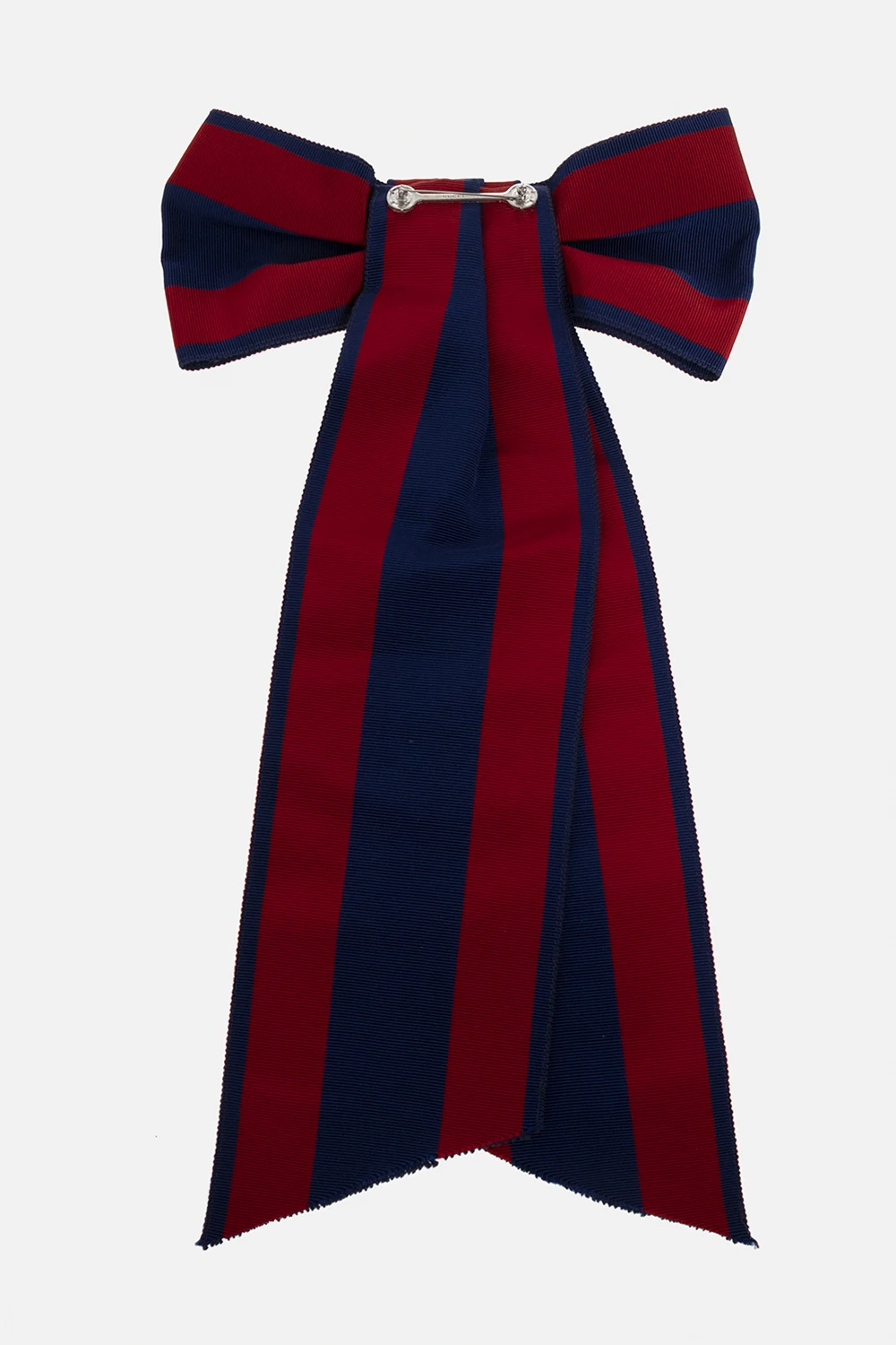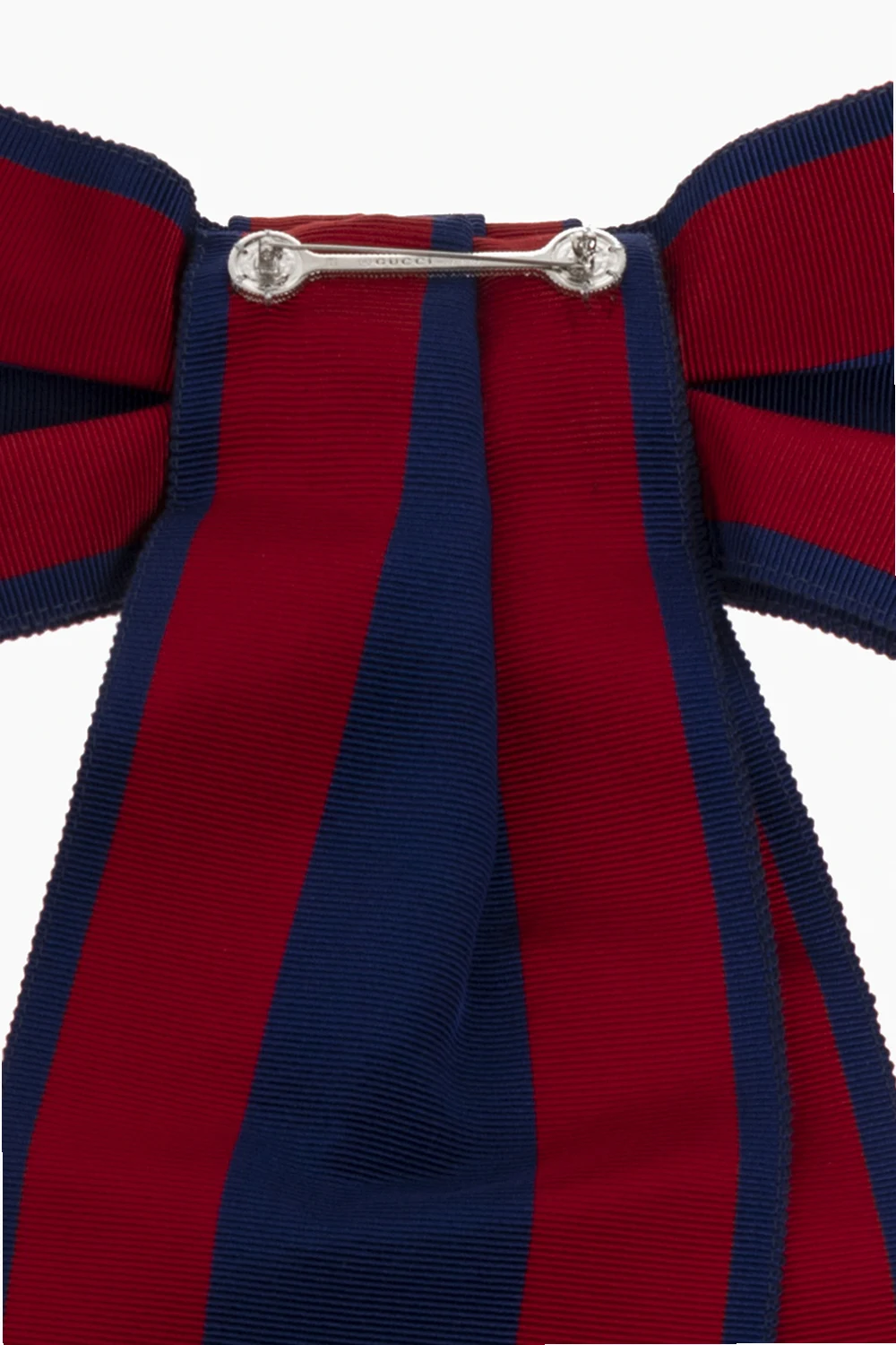 Granatowo-czerwona broszka w kształcie kokardy Gucci. Zapinana na szpilkę. Ozdobiona wzorem w pasy oraz aplikacją w kształcie logo ‘Interlocking G’. Metalowe elementy wykonane z mosiądzu w kolorze srebrnym.