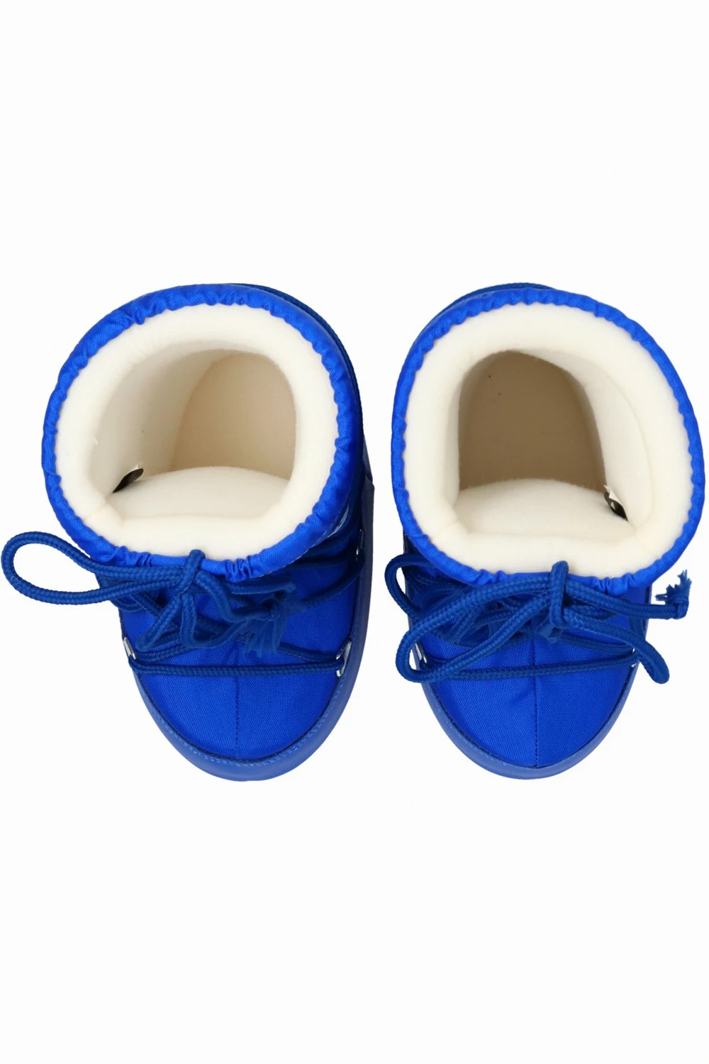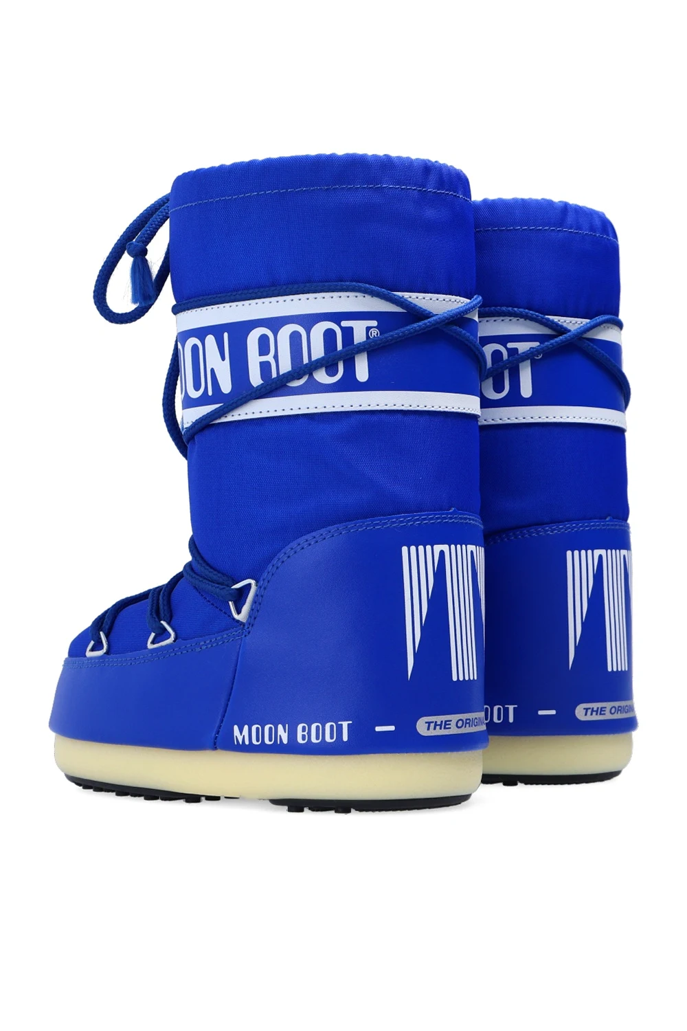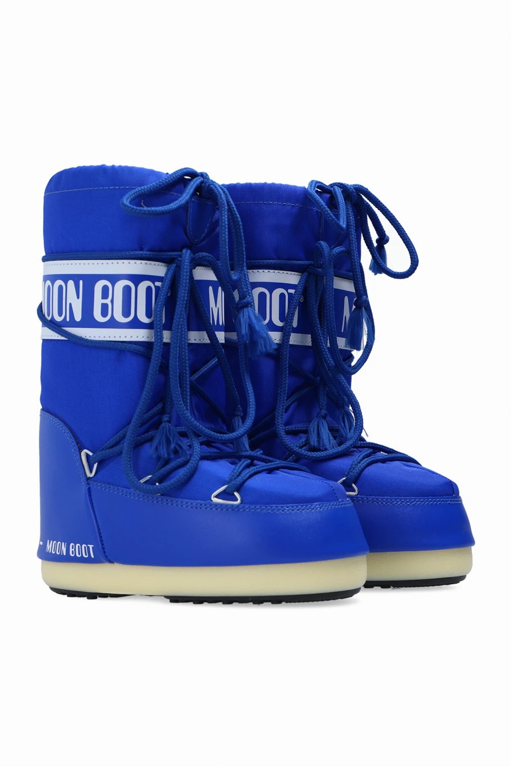 Zielono-niebieskie, sznurowane, wodoodporne śniegowce, model ‘Classic Nylon’ Moon Boot Kids. Na górze ściągane trokami. Ozdobione nadrukowanym logo w kolorze białym. Czarna, gumowa podeszwa.