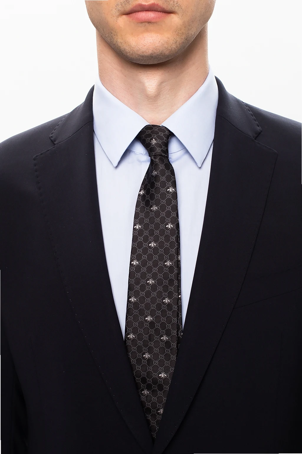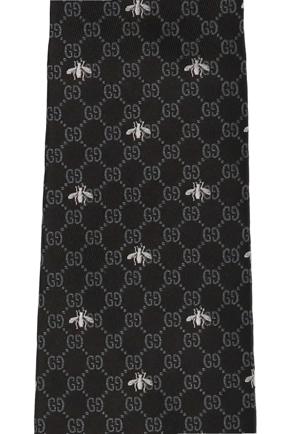 Czarny krawat Gucci. Ozdobiony szarym wzorem ‘GG’ oraz motywem zwierzęcym.