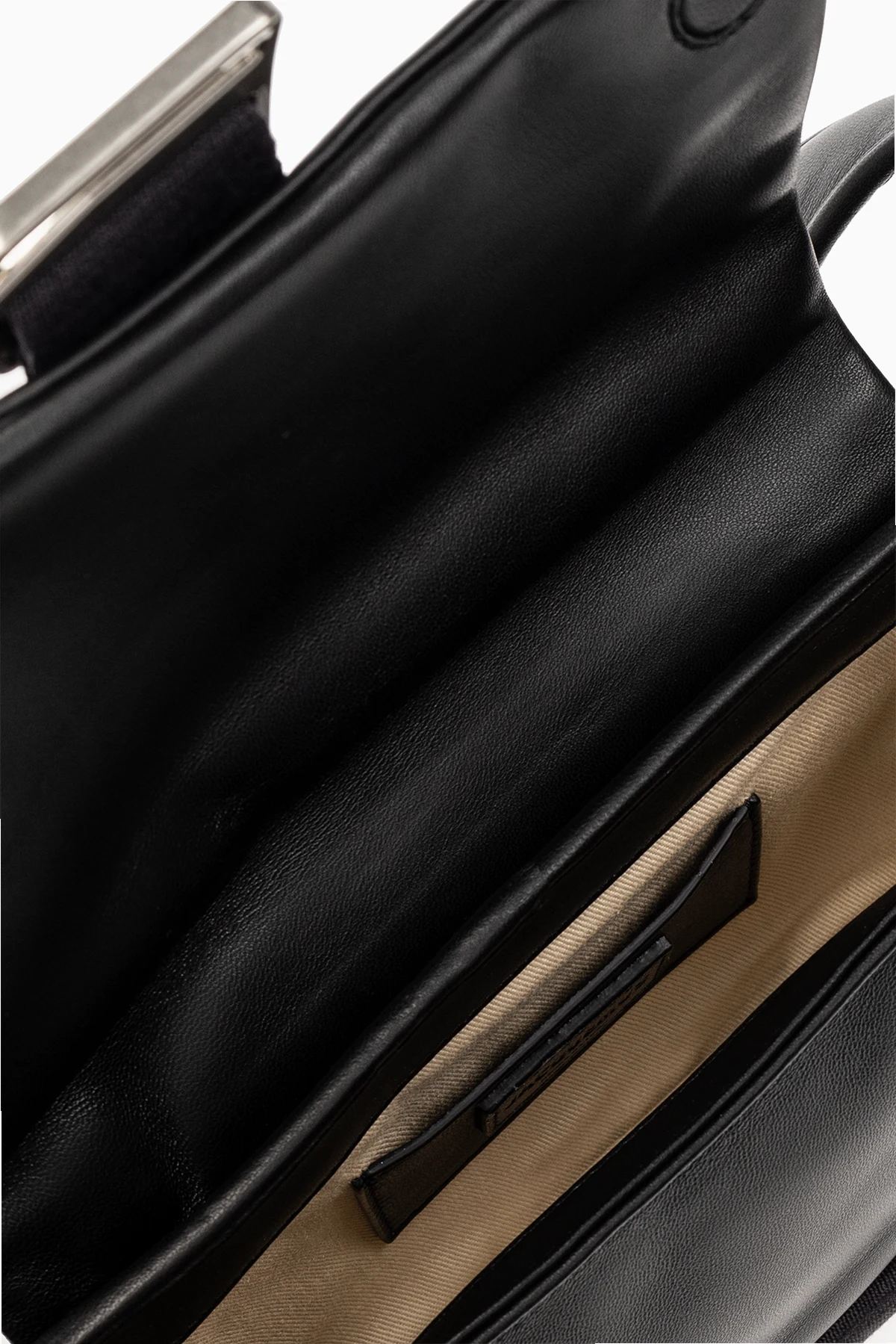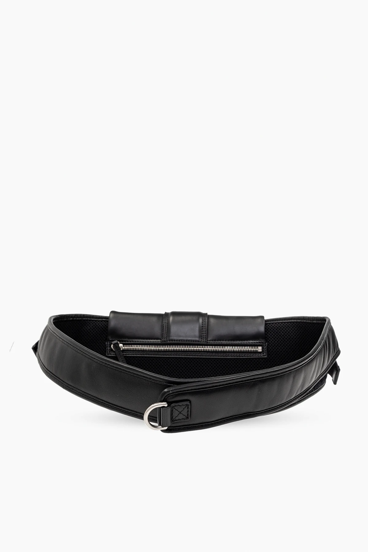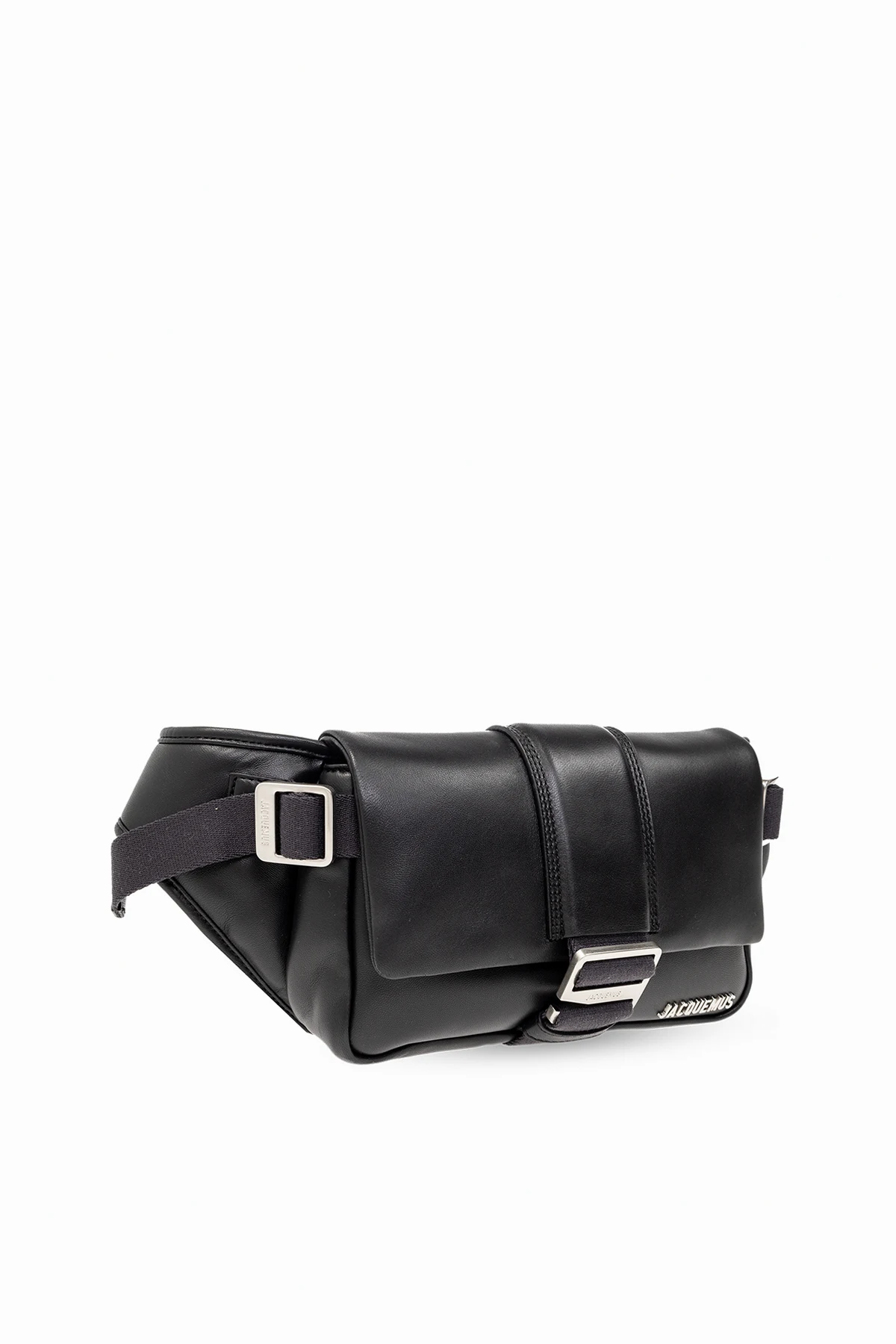 Czarna torba na pas, model ‘Le Banane Bambimou’ Jacquemus. Wykonana ze skóry jagnięcej. Zamykana na pasek z klamrą i magnetyczne zatrzaski. Z przodu metalowa aplikacja w kształcie logo. Z tyłu kieszeń z zamknięciem na zamek. Regulowany pasek. Wewnątrz komora z miejscem na kartę. Metalowe wykończenie w kolorze srebrnym.