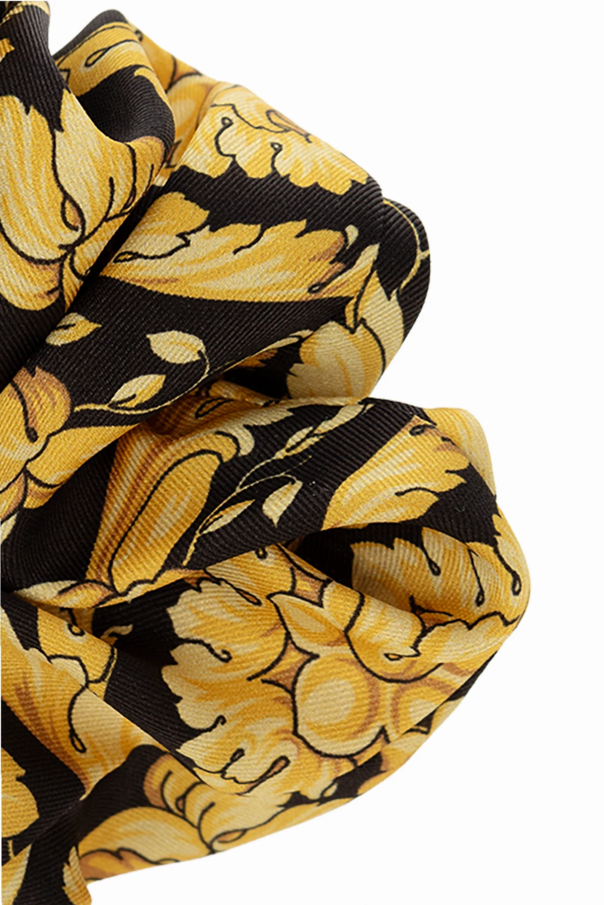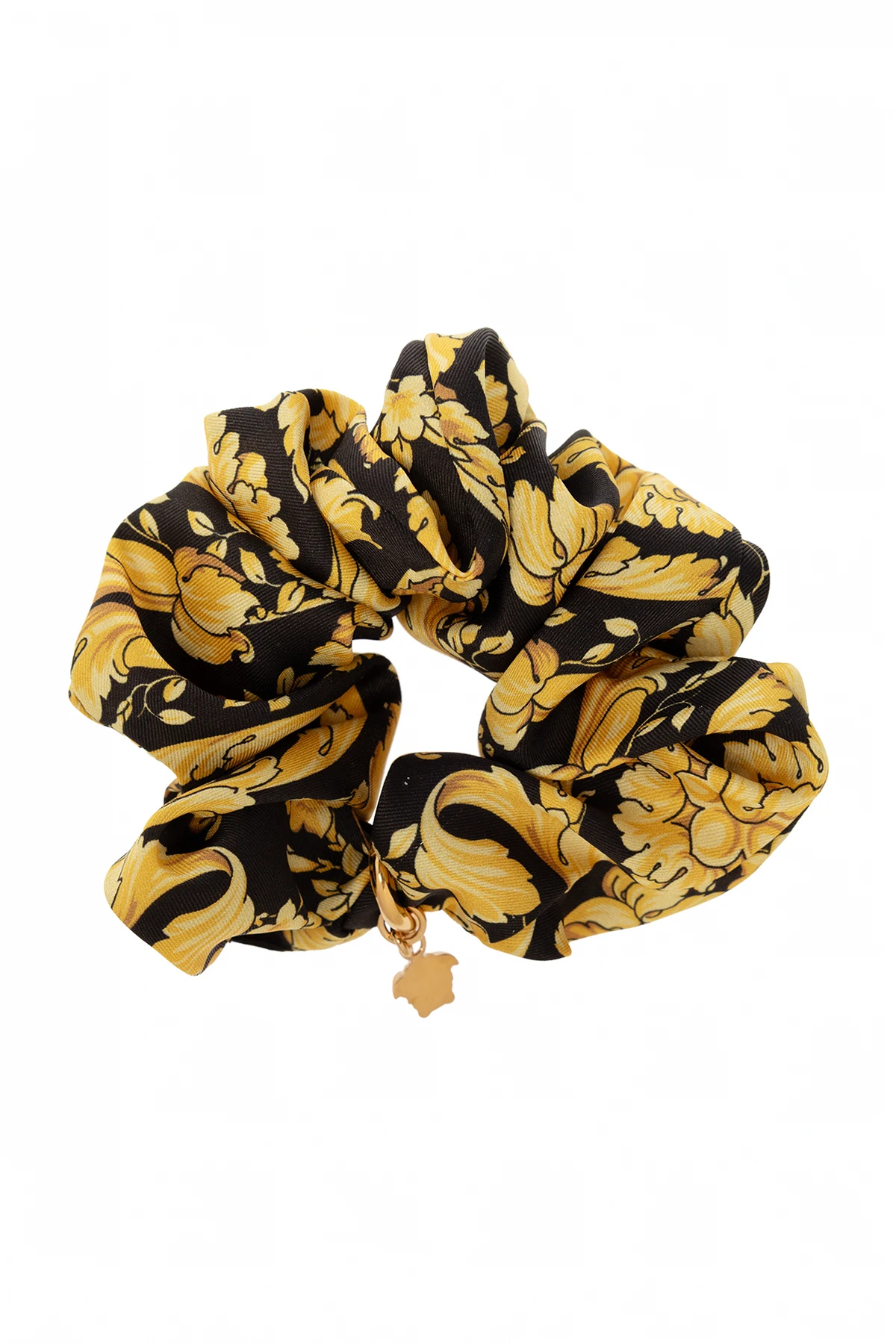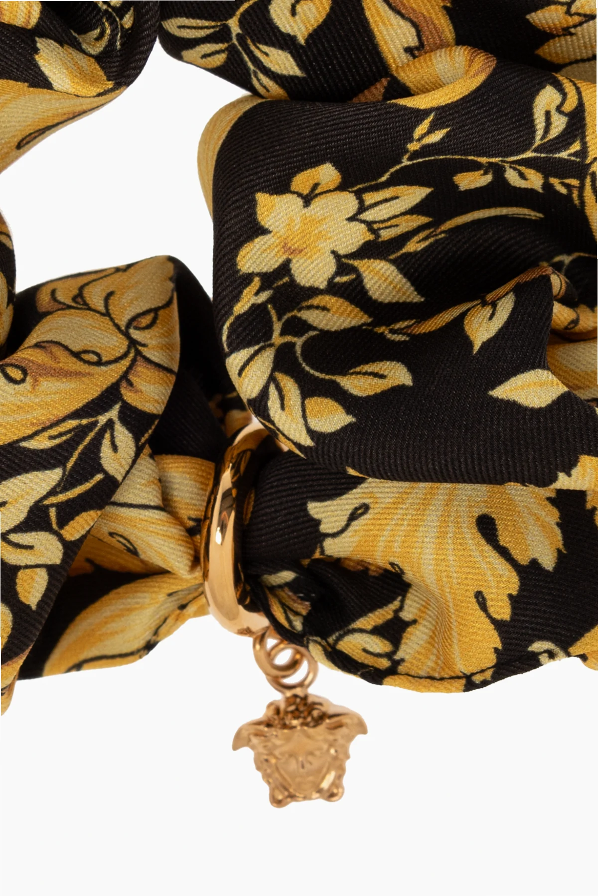 Czarna gumka do włosów Versace. Ozdobiona żółto-brązowym wzorem z motywem ‘Barocco’ i metalowym pierścieniem z zawieszką w kształcie głowy Meduzy w kolorze złotym.