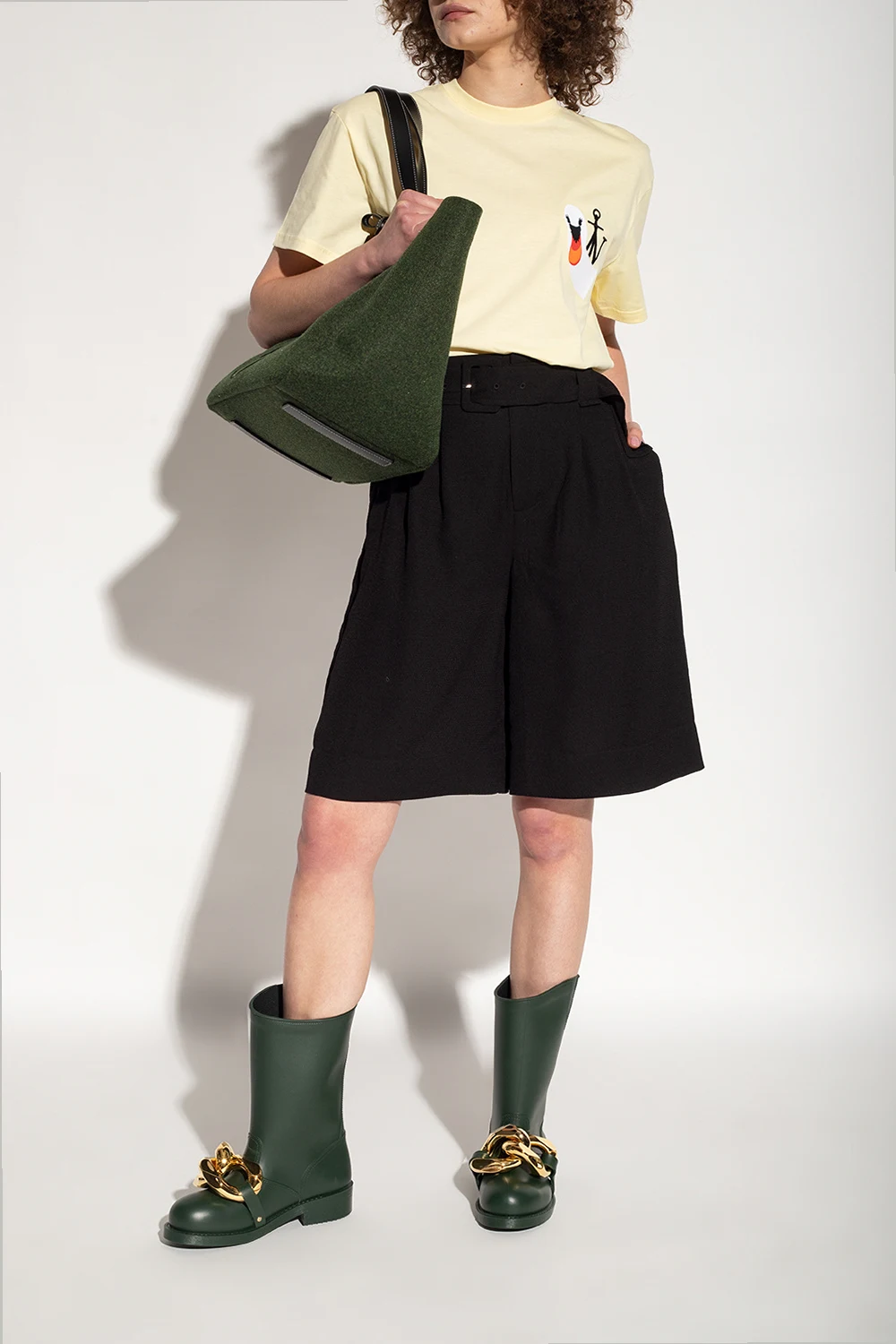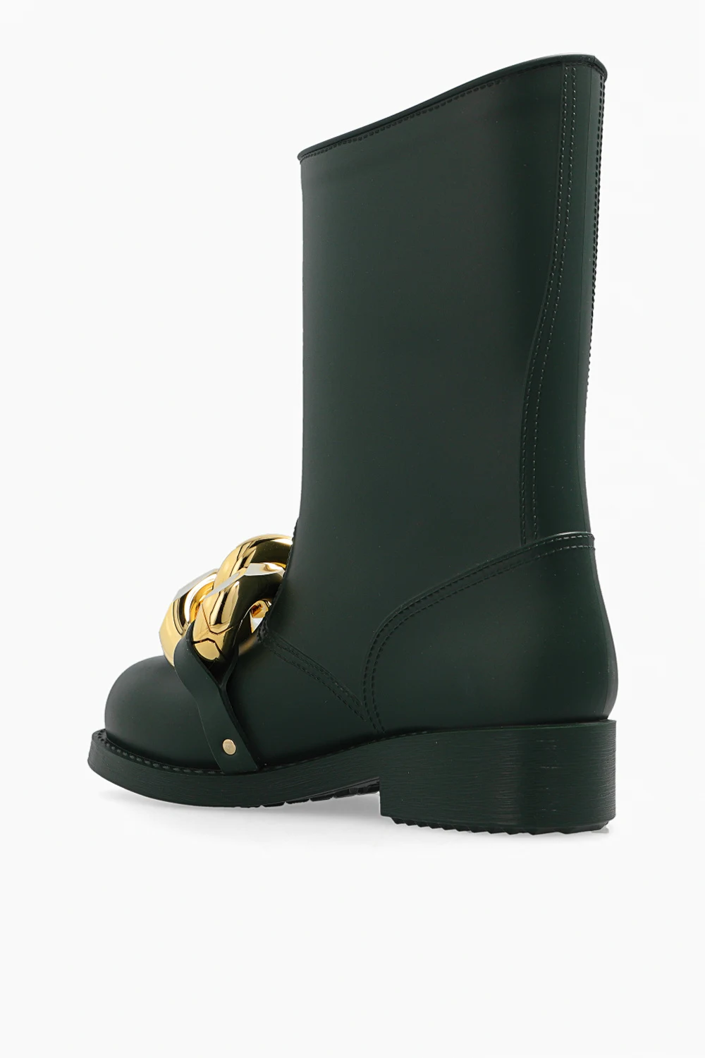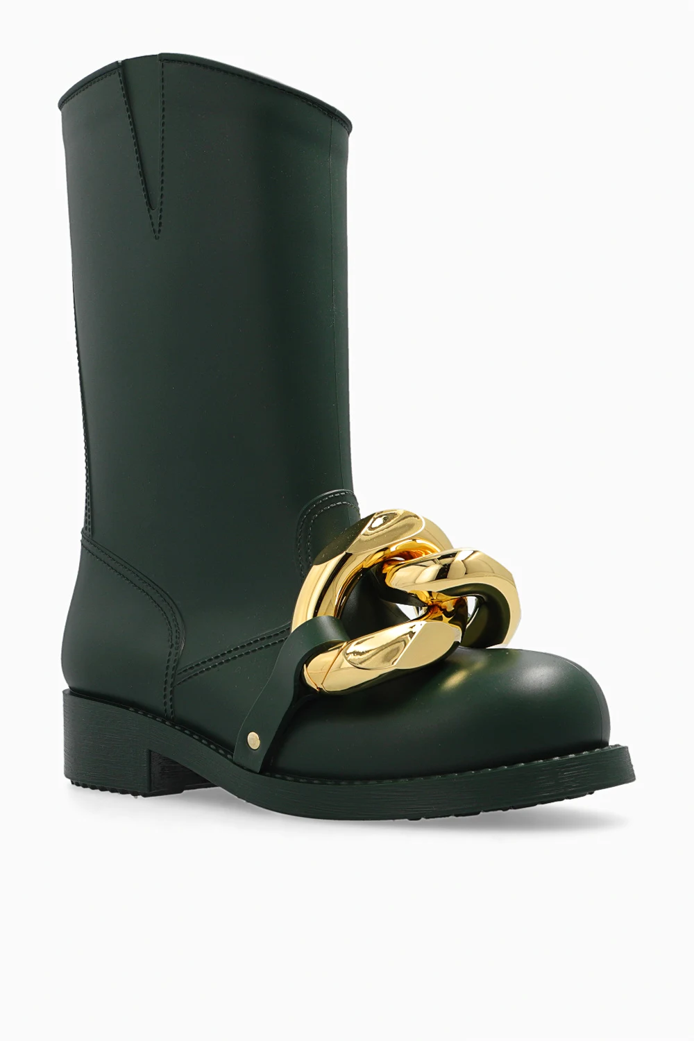 Ciemnozielone kalosze JW Anderson. Asymetrycznie wykończona cholewka. Z przodu metalowa aplikacja w kształcie ogniw łańcucha w kolorze złotym. Gumowa podeszwa w kolorze ciemnozielonym.