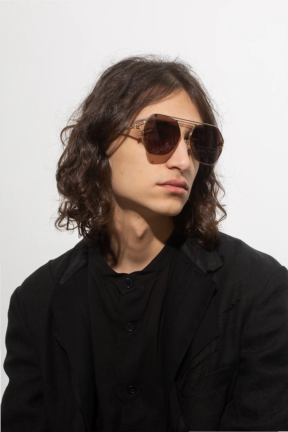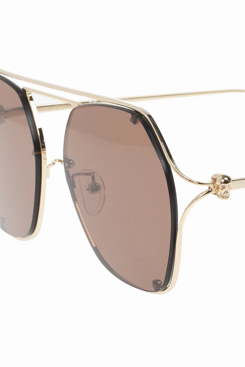 Metalowe okulary przeciwsłoneczne w kolorze złotym Alexander McQueen. Podwójny mostek. Ozdobne zauszniki z aplikacją w kształcie charakterystycznej dla marki czaszki oraz z wygrawerowanym logo. Brązowe, certyfikowane soczewki UVA/UVB. Dołączone czarne etui z wytłoczonym logo.