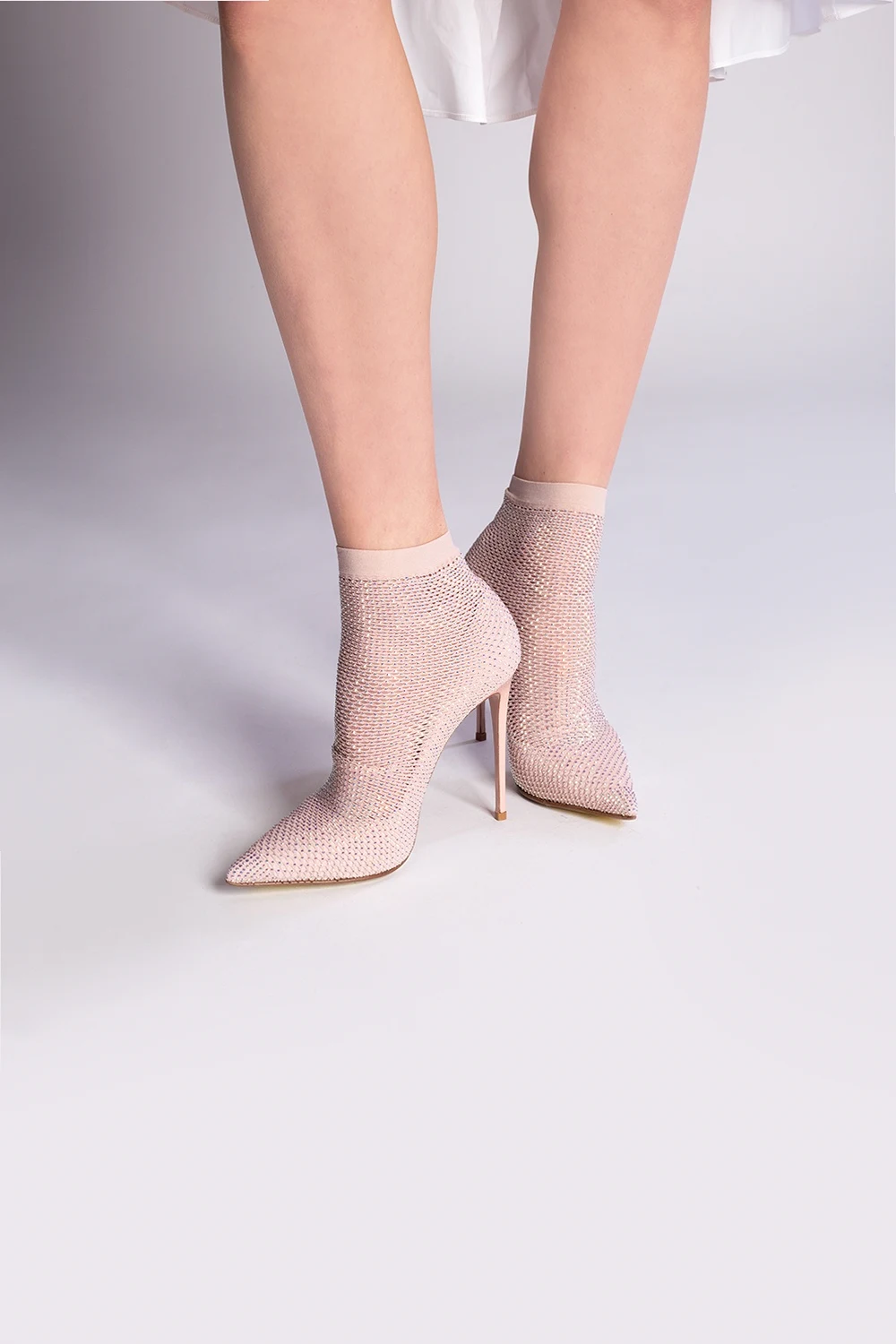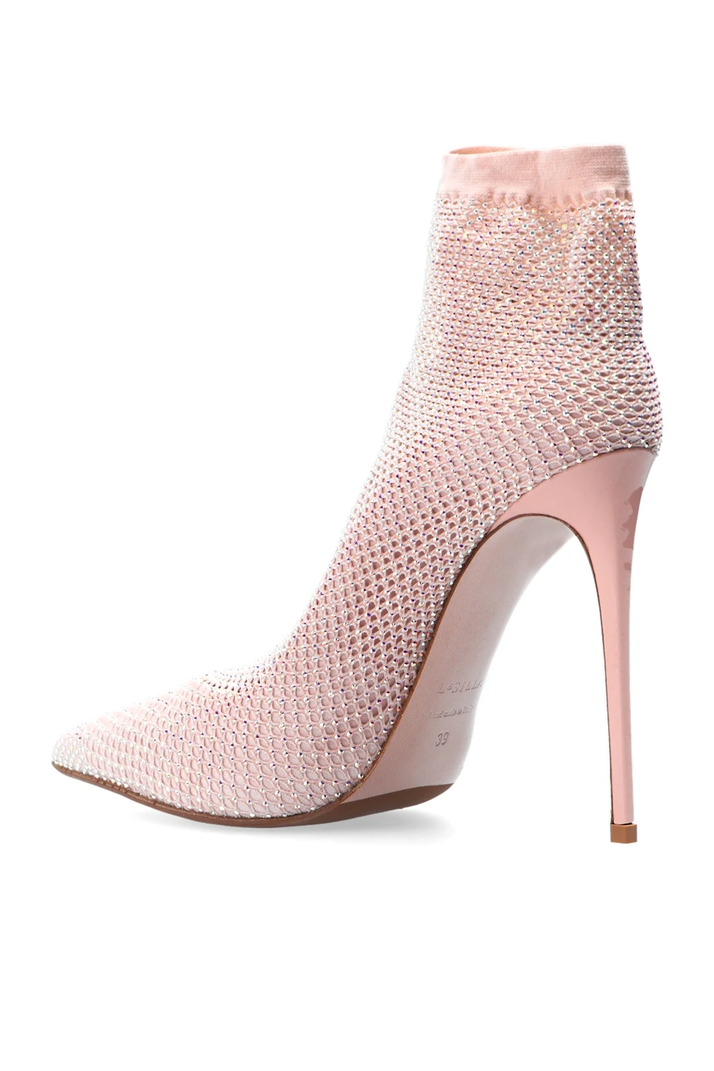 Różowe szpilki ze skarpetą, model ‘Gilda’ Le Silla. Wykonane z siatki. Wykończone skórą. Wysadzane dekoracyjnymi cekinami. Brązowo-kremowa podeszwa wykonana ze skóry oraz gumy.