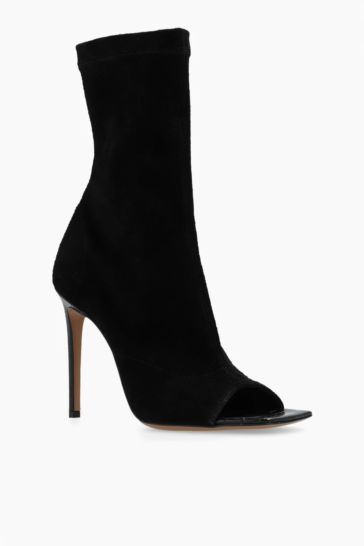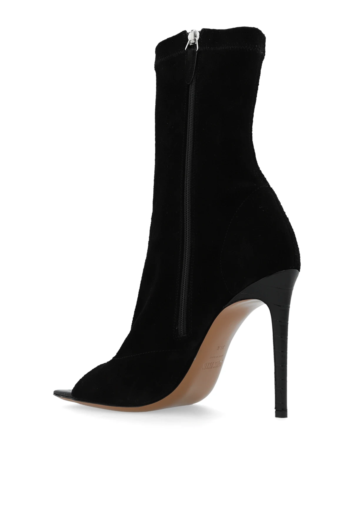 Czarne buty na obcasie, model ‘Amanda’ Paris Texas. Wykonane z cielęcego zamszu. Zapinane z boku na zamek. Wycięcie odkrywające palce. Obcas wykończony skórą cielęcą imitującą skórę krokodyla. Beżowa, skórzana podeszwa.
