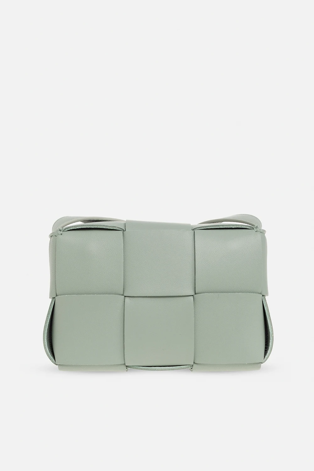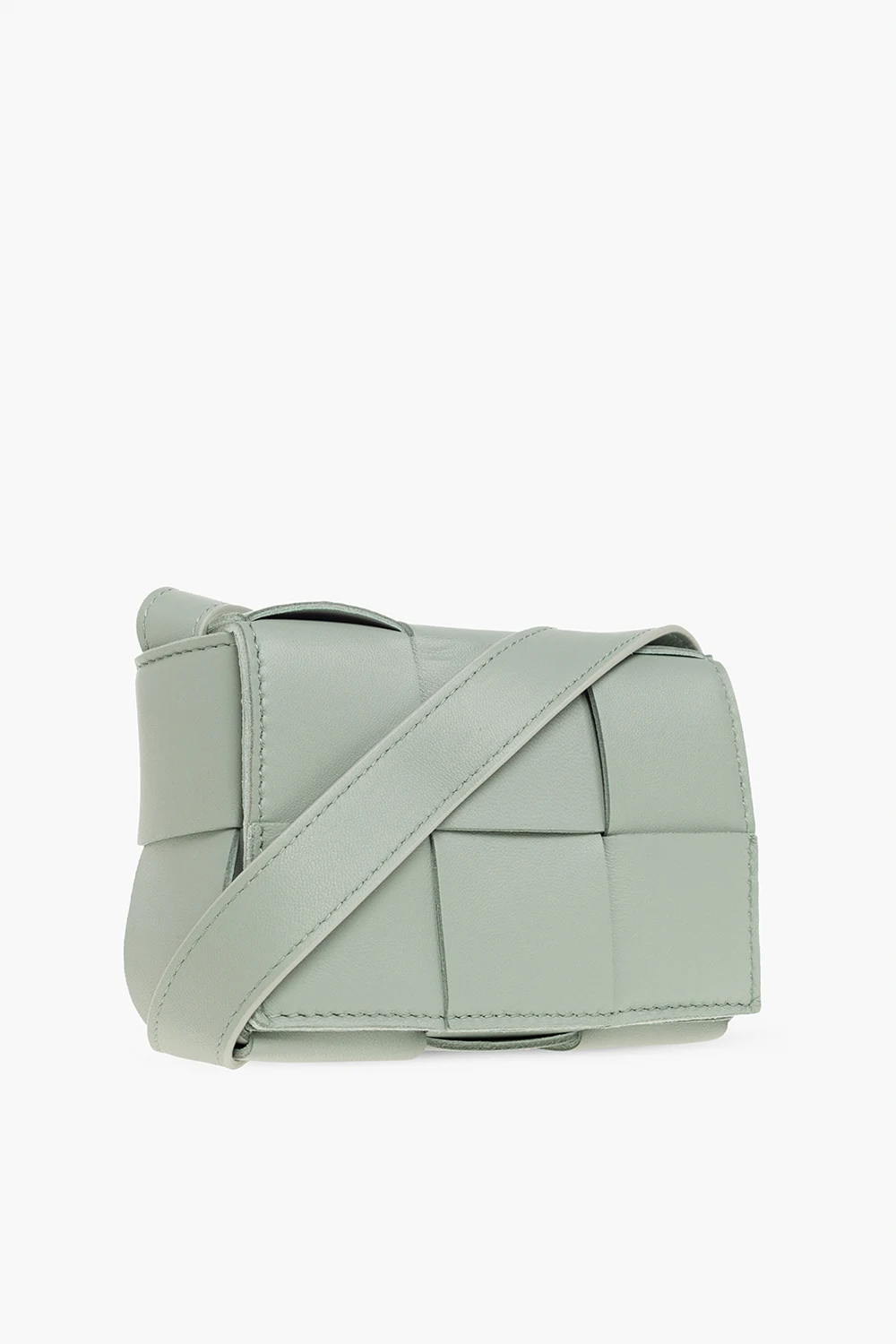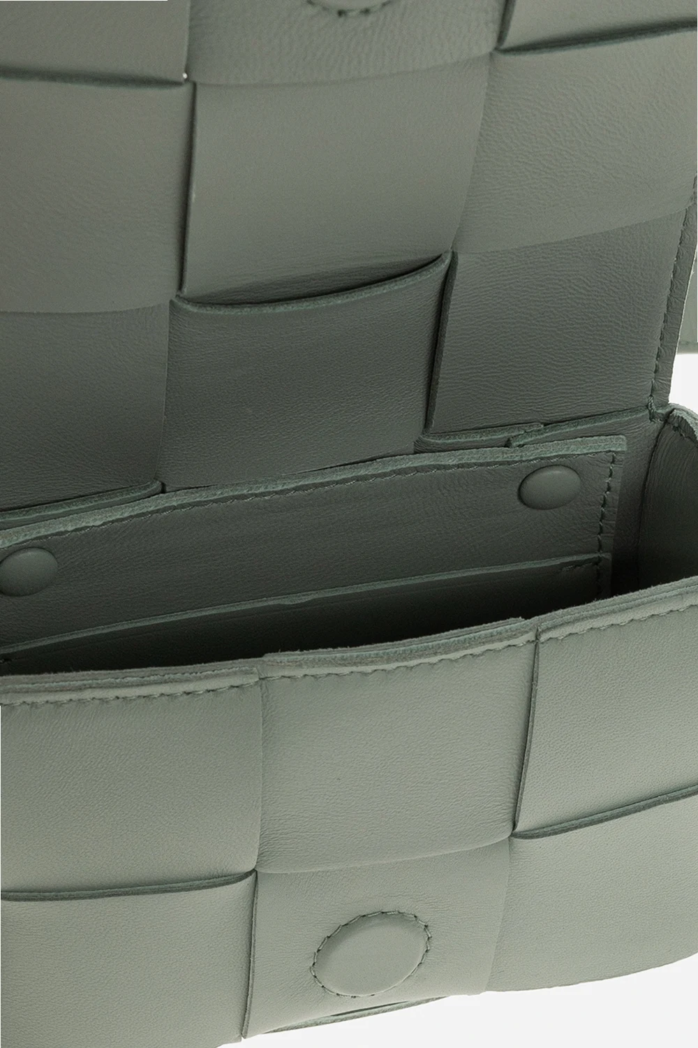 Szarozielona torba na ramię, model ‘Candy Cassette Mini’ Bottega Veneta. Wykonana z jagnięcej skóry. Zamykana na klapę z magnetycznym zatrzaskiem. Ozdobiona charakterystyczną dla marki plecionką ‘Intreccio’. Pas z możliwością regulacji długości. Wewnątrz komora oraz miejsce na kartę. Metalowe wykończenie w kolorze złotym.