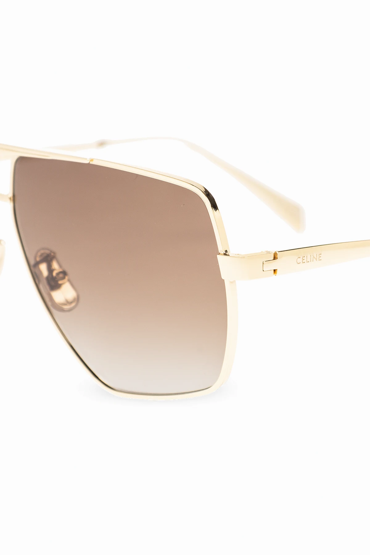 Okulary przeciwsłoneczne w kolorze złotym, model ‘Frame 25’ Celine. Oprawki typu ‘aviator’. Zauszniki ozdobione wygrawerowanym logo. Brązowe, gradalne soczewki z polaryzacją i ochroną przed promieniowaniem UVA i UVB. Dołączone etui.