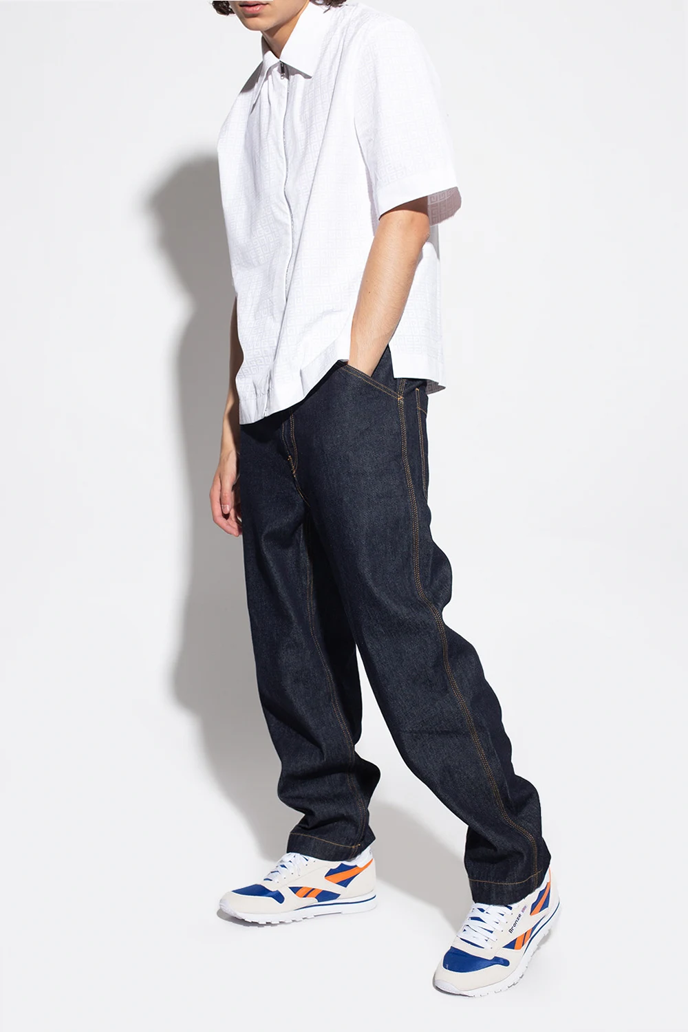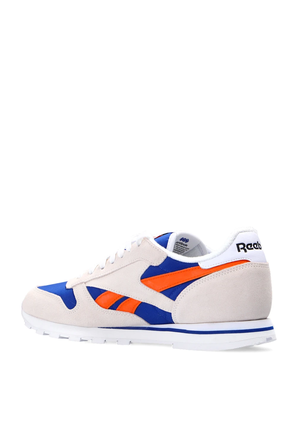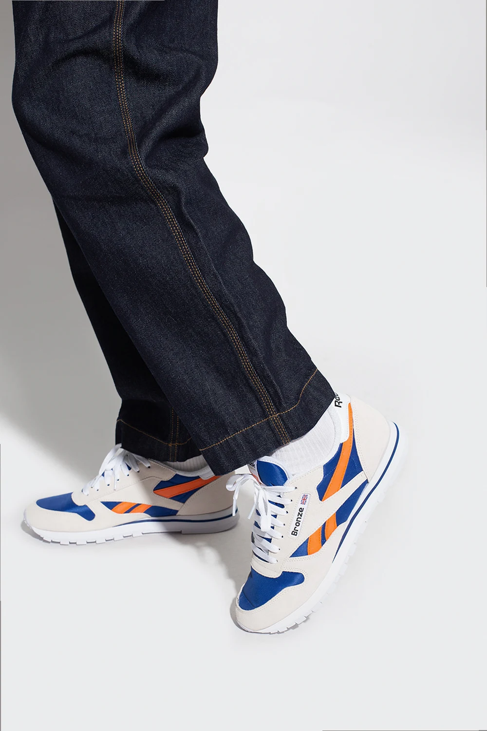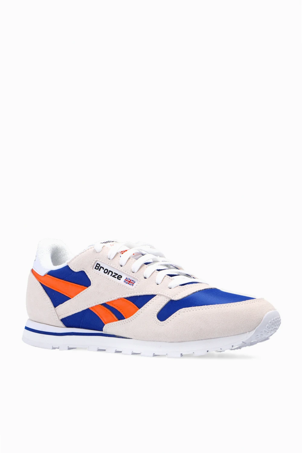 Beżowo-ciemnoniebieskie, sznurowane buty sportowe, model ‘Classic’ Reebok x Bronze. Wykończone zamszem. Na języku naszywka z logo. Pomarańczowa wstawka. Podeszwa środkowa z pianki EVA. Wyjmowana wkładka. Biała, gumowa podeszwa.