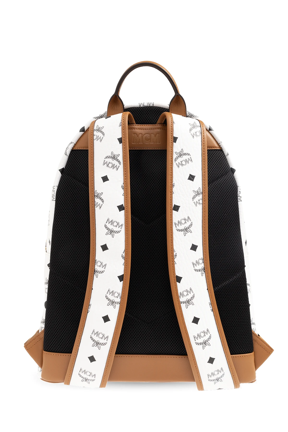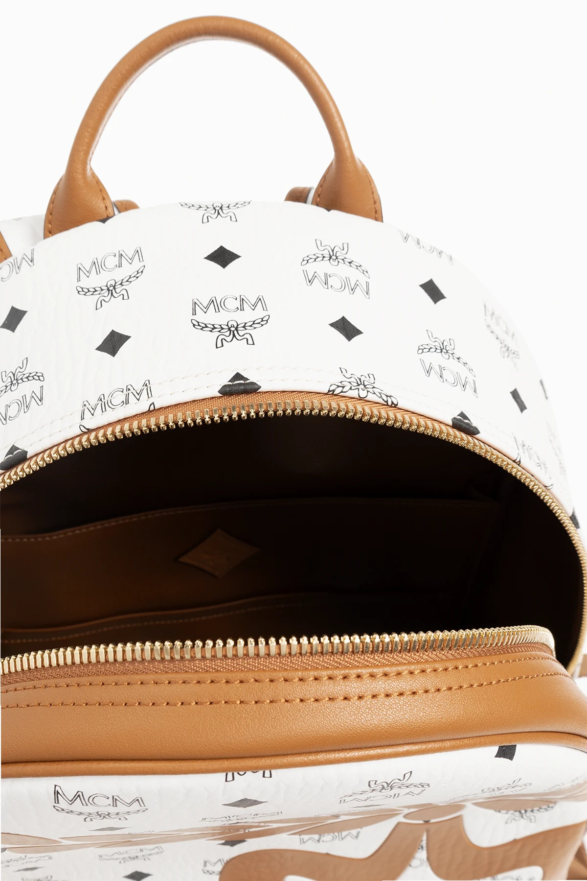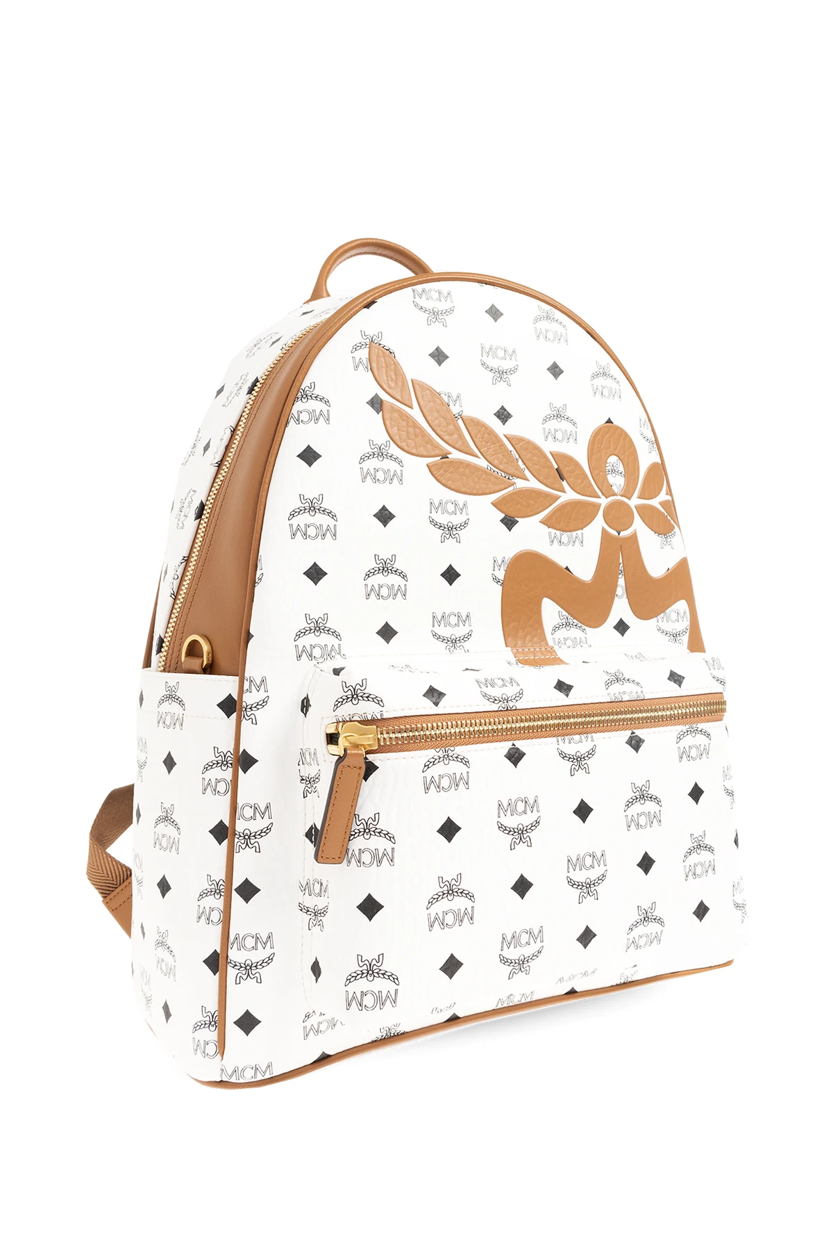 Biało-brązowy plecak, model ‘Stark Medium’ MCM. Wykonany z powlekanego płótna z charakterystycznym wzorem z monogramem ‘Visetos’ w kolorze czarnym. Zamykany na dwubiegunowy zamek. Z przodu kieszeń zamykana na zamek. Po bokach wsuwana kieszeń. Półokrągła rączka. Regulowane szelki. Wewnątrz komora i dwie wsuwane kieszenie. Metalowe elementy w kolorze złotym.