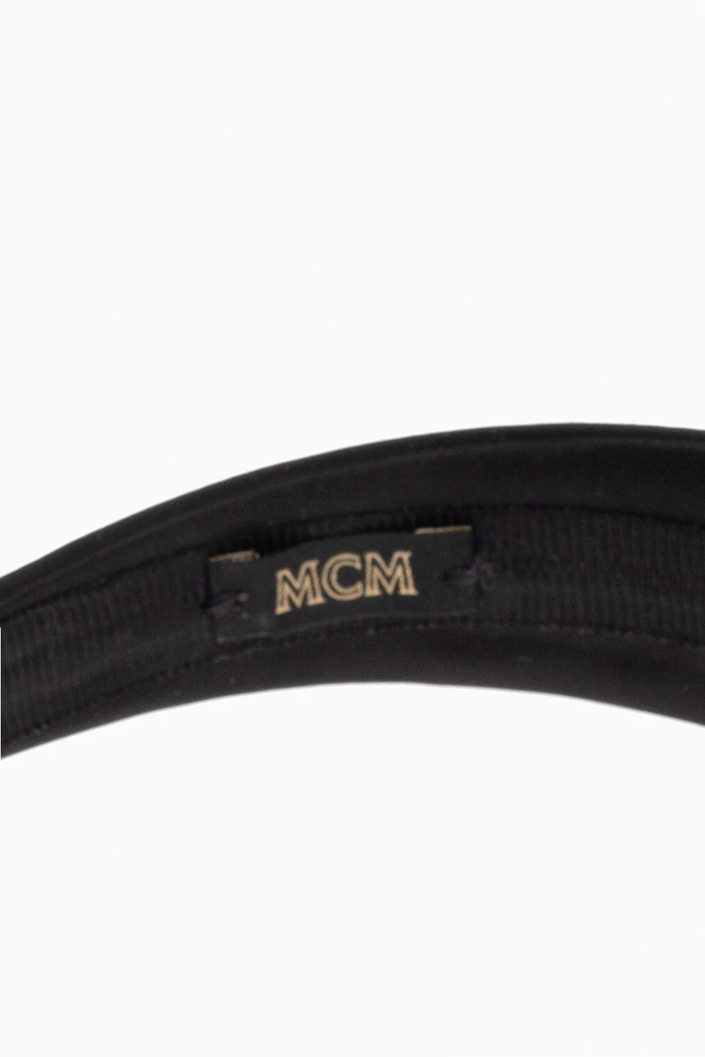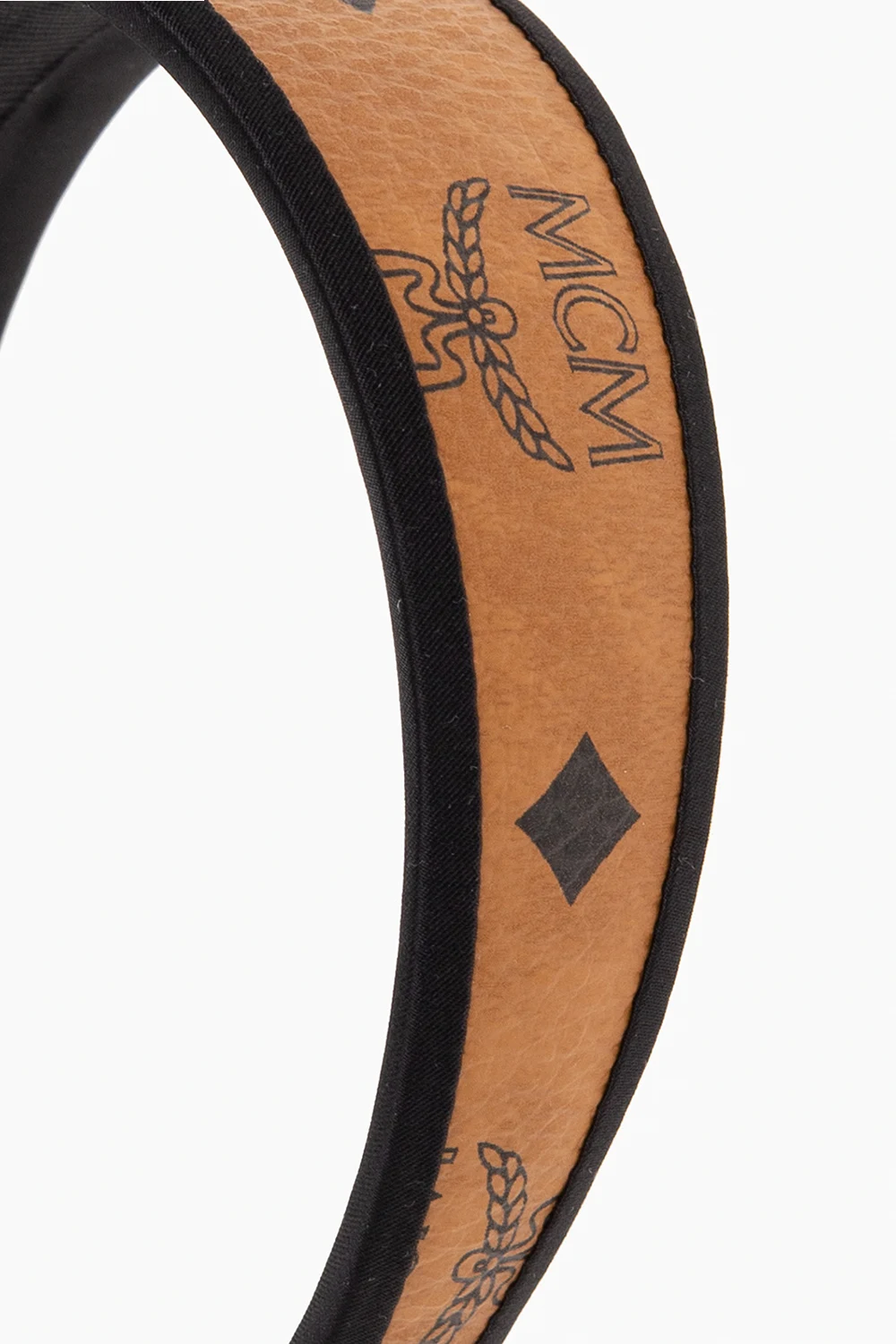 Brązowo-czarna opaska na głowę MCM. Wykonana z charakterystycznego dla marki, powlekanego płótna z logo ‘Visetos’. Wykończona satynowymi lamówkami.
