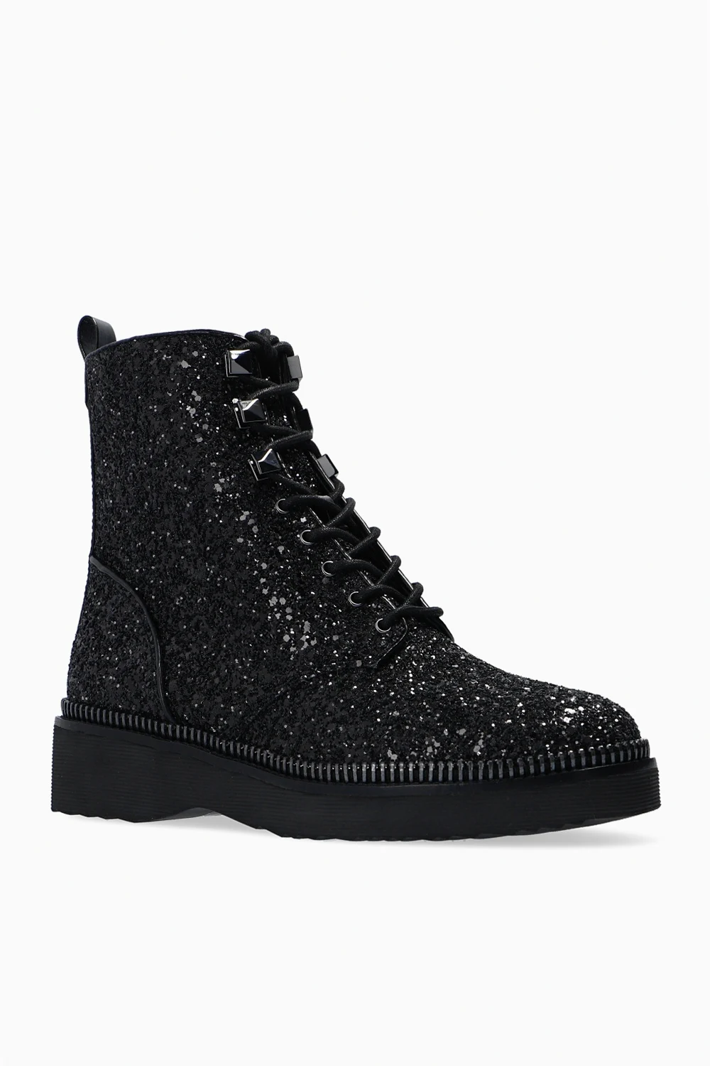Czarne, sznurowane botki, model ‘Haskell’ Michael Michael Kors. Wykończone brokatem. Z boku zapinane na zamek. Metalowe elementy w kolorze srebrnym. Czarna, gumowa podeszwa.