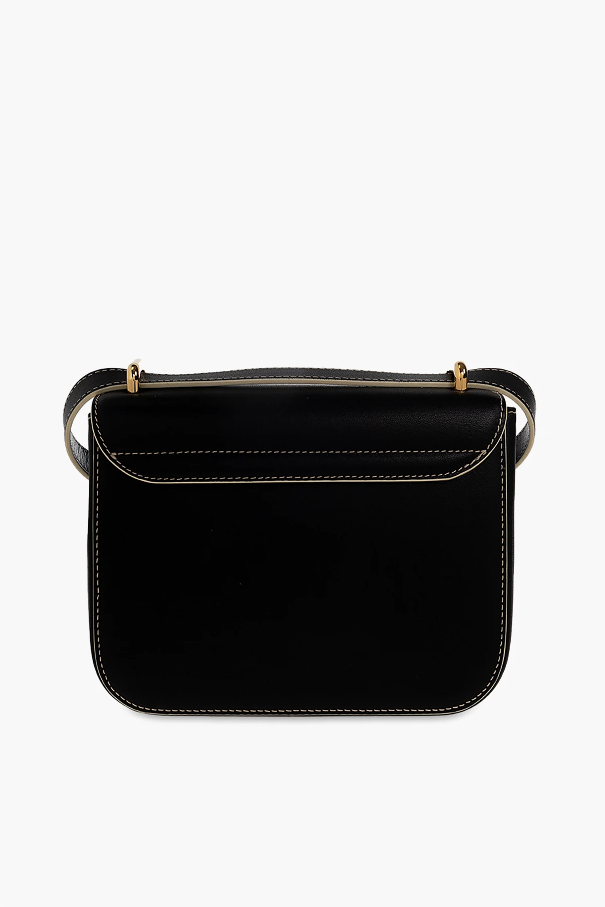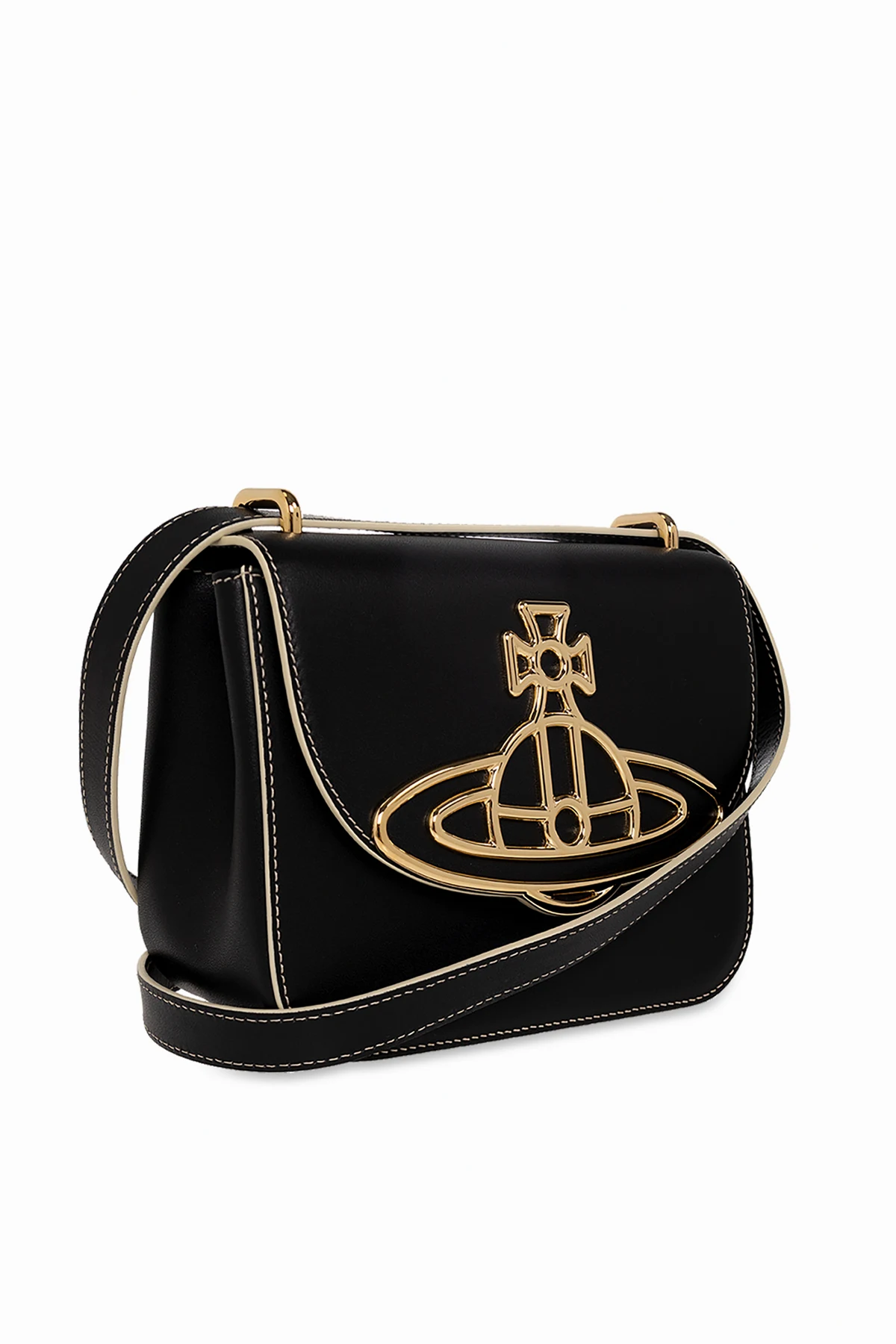 Czarna torba na ramię, model ‘Linda’ Vivienne Westwood. Wykonana z cielęcej skóry. Zamykana na magnetyczny zatrzask. Z przodu ozdobiona metalową aplikacją w kształcie logo. Przeszycia w kolorze białym. Odpinany pasek na ramię z możliwością regulacji długości. Wewnątrz komora i miejsce na kartę. Metalowe elementy w kolorze złotym.