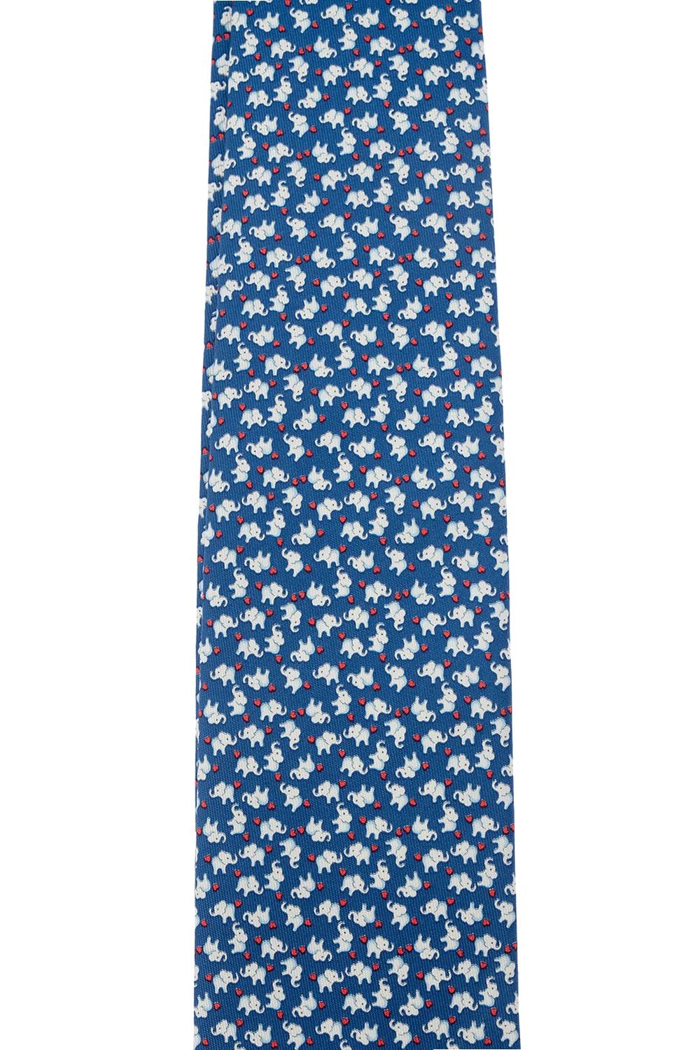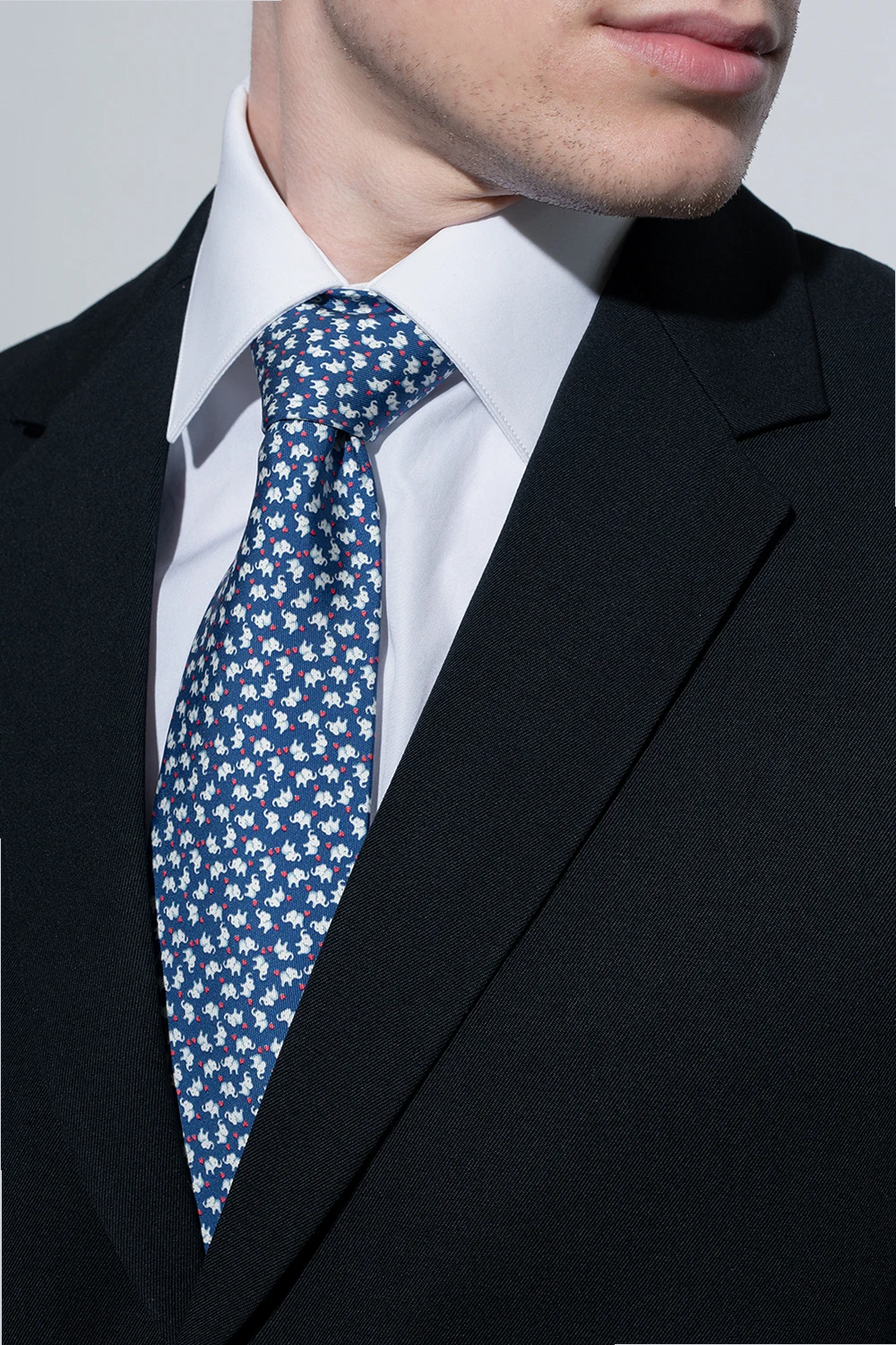 Niebieski krawat Salvatore Ferragamo. Wykonany z jedwabiu. Ozdobiony nadrukowanym wzorem z motywem zwierzęcym w kolorze biało-czerwonym.