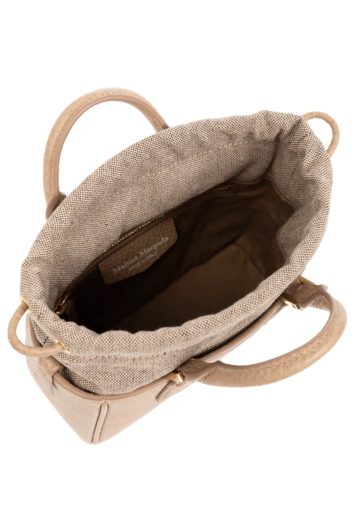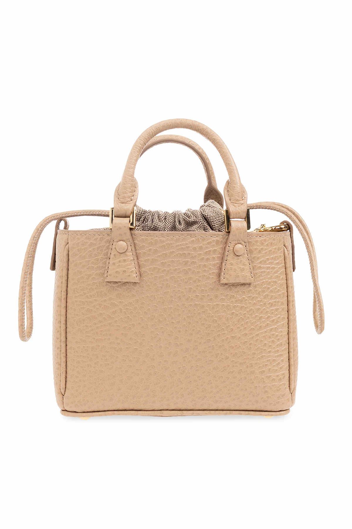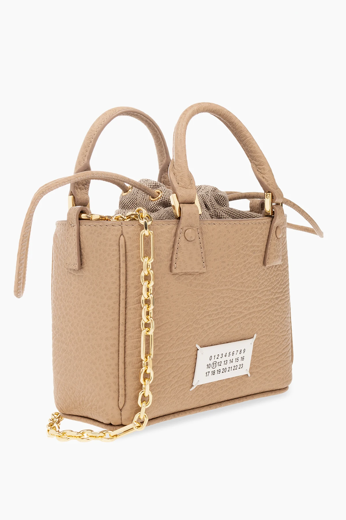 Brązowa torba na ramię, model ‘5AC’ Maison Margiela. Wykonana ze skóry cielęcej o ziarnistej fakturze i bawełnianego płótna. Ściągana trokami. Z przodu biała naszywka z logo. Dwie półokrągłe rączki i pas na ramię z łańcuchem. Wewnątrz komora z kieszenią zamykaną na zamek. Metalowe wykończenie w kolorze złotym.