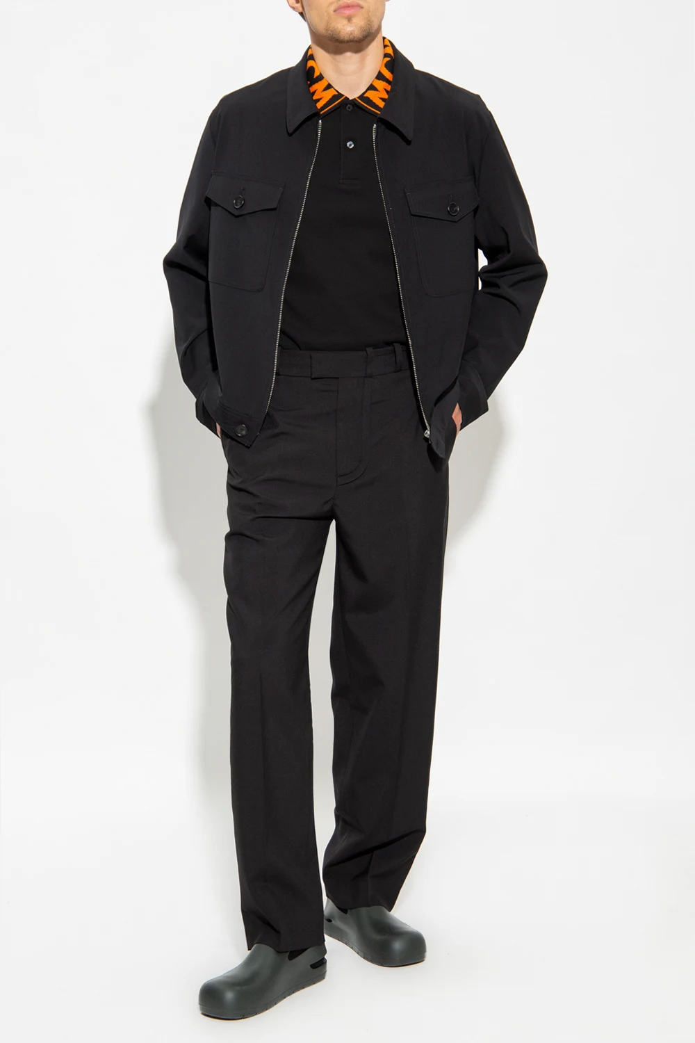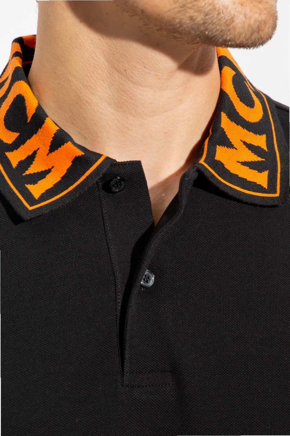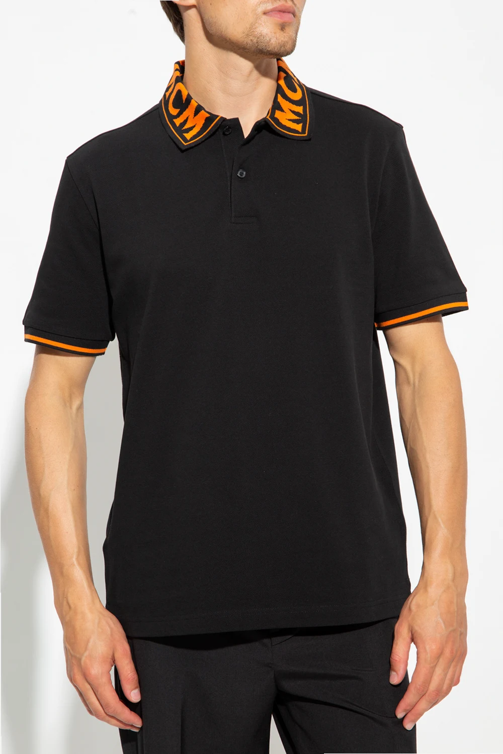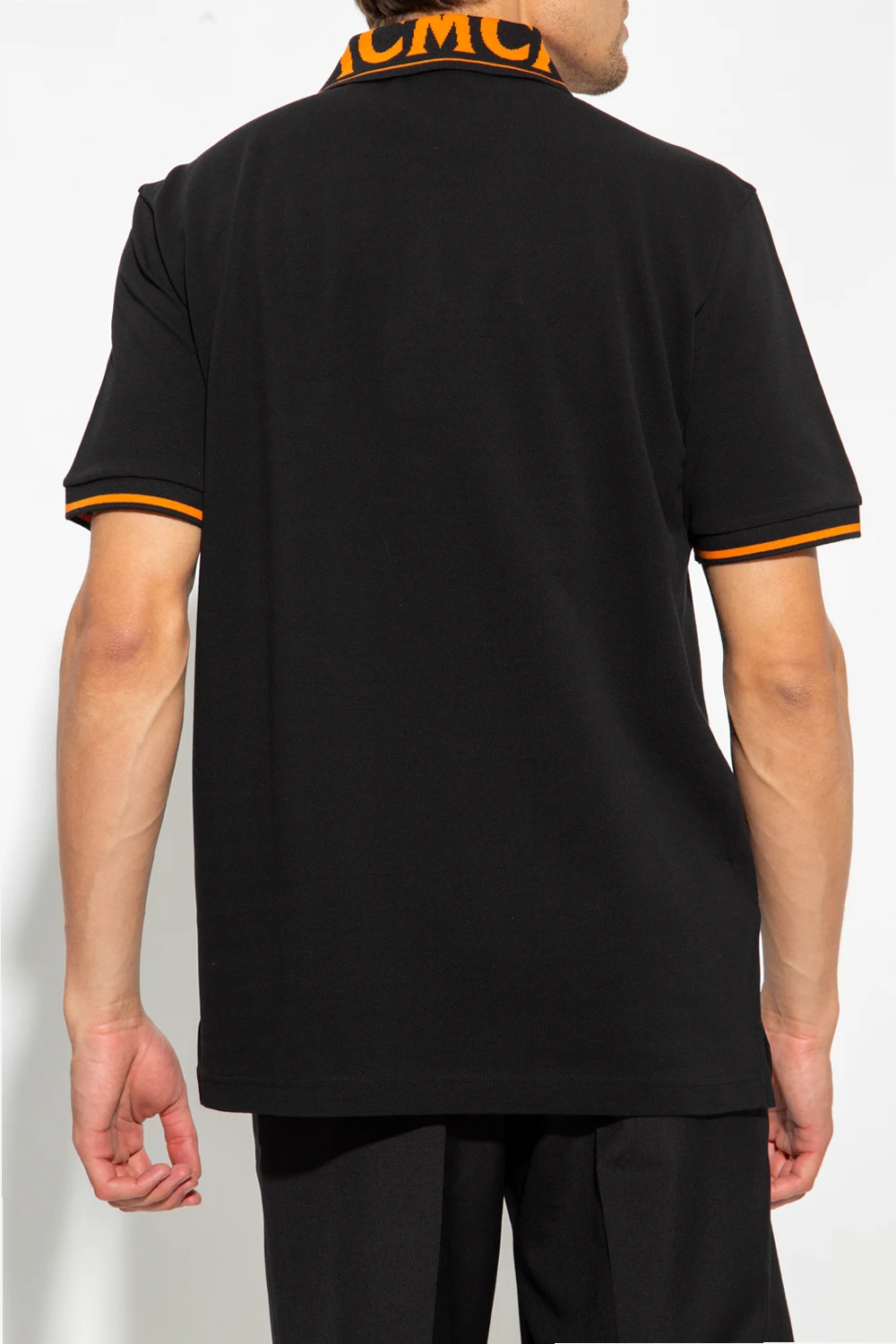 Czarne polo MCM. Wykonane z bawełny. Kołnierz zapinany na guziki ozdobiony pomarańczowym, wyszytym logo. Krótkie rękawy wykończone ściągaczem.
