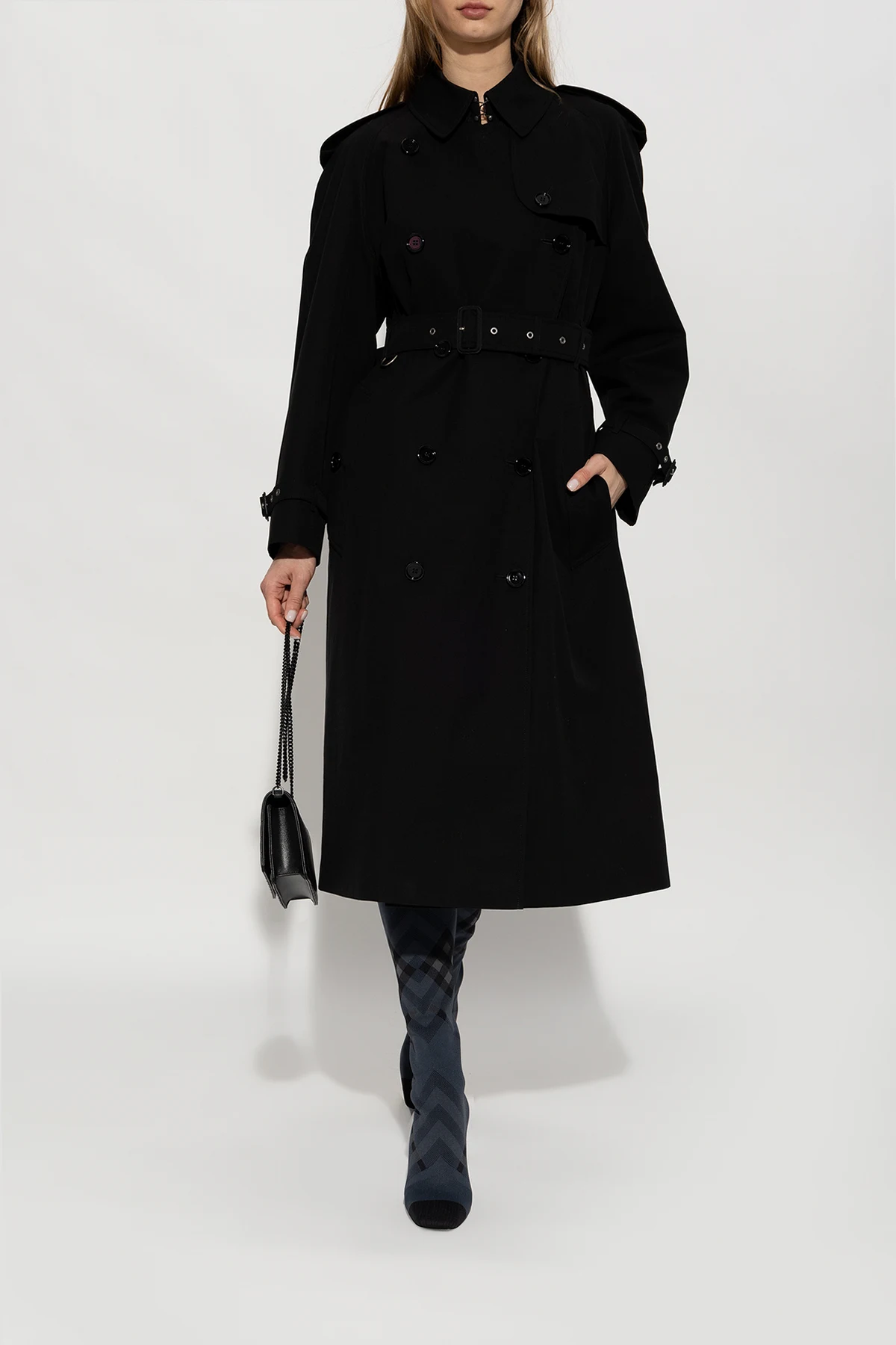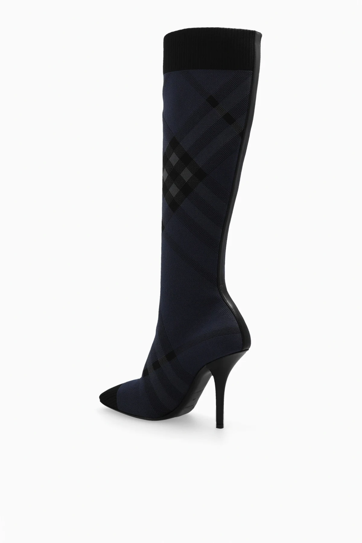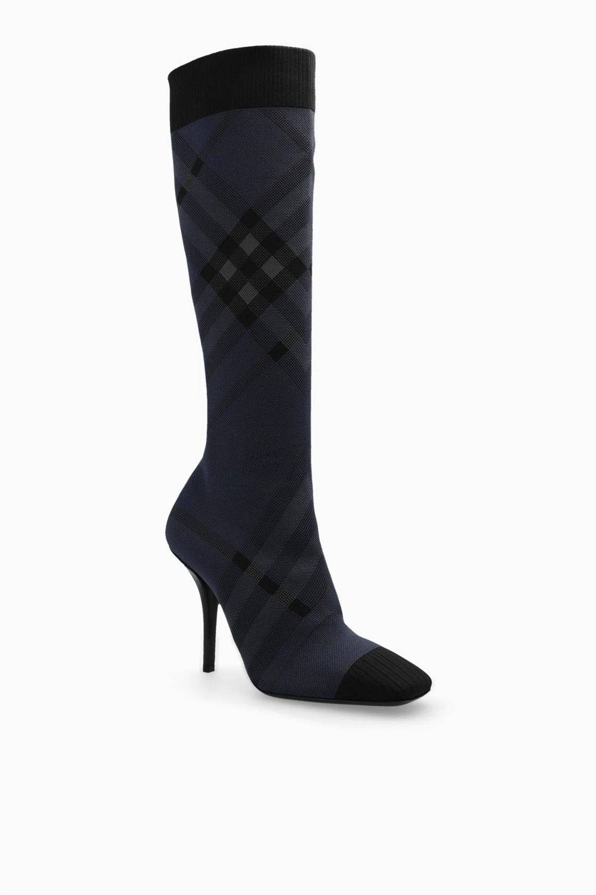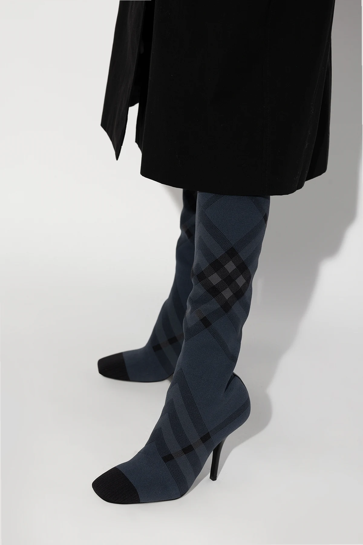 Czarno-szare kozaki na obcasie, model ‘Dolman’ Burberry. Wykonane z materiału. Góra wykończona ściągaczem. Ozdobione charakterystyczną kratą. Kwadratowy nosek. Czarna, skórzana podeszwa.