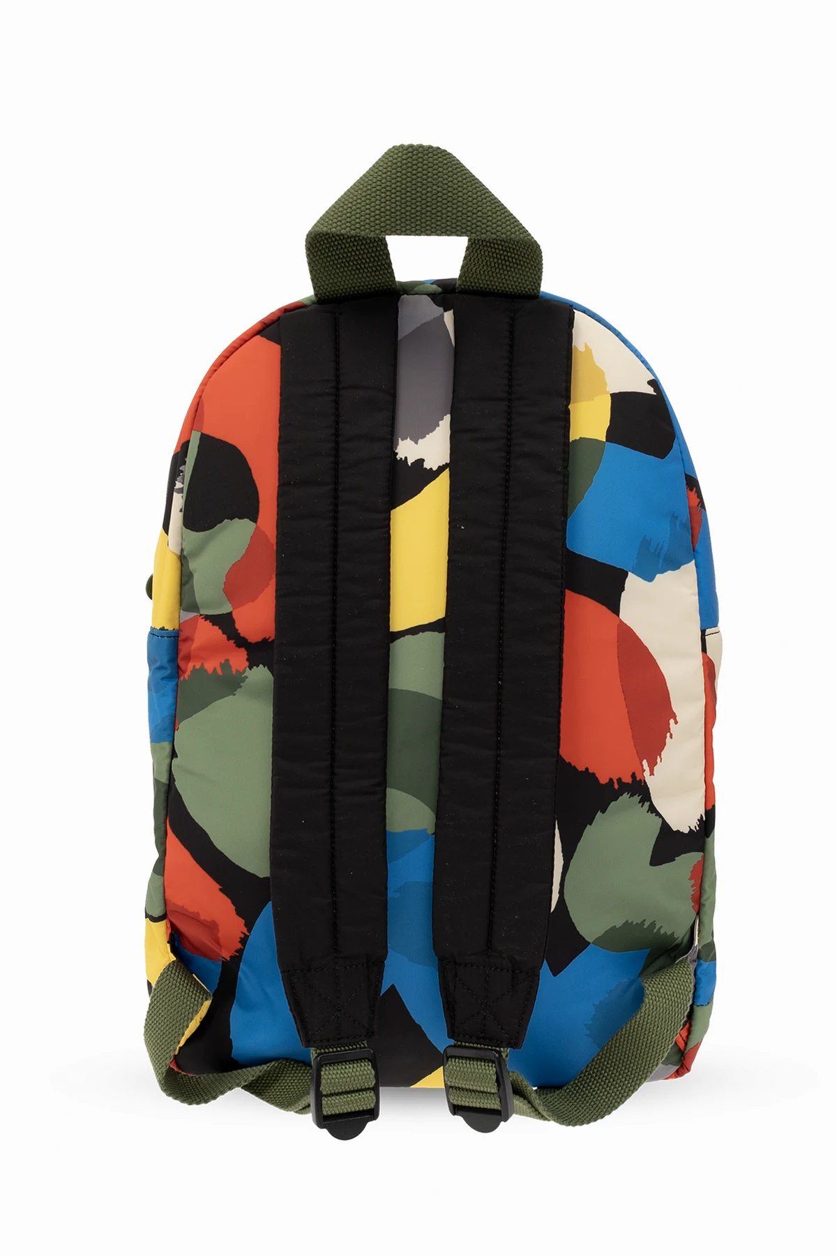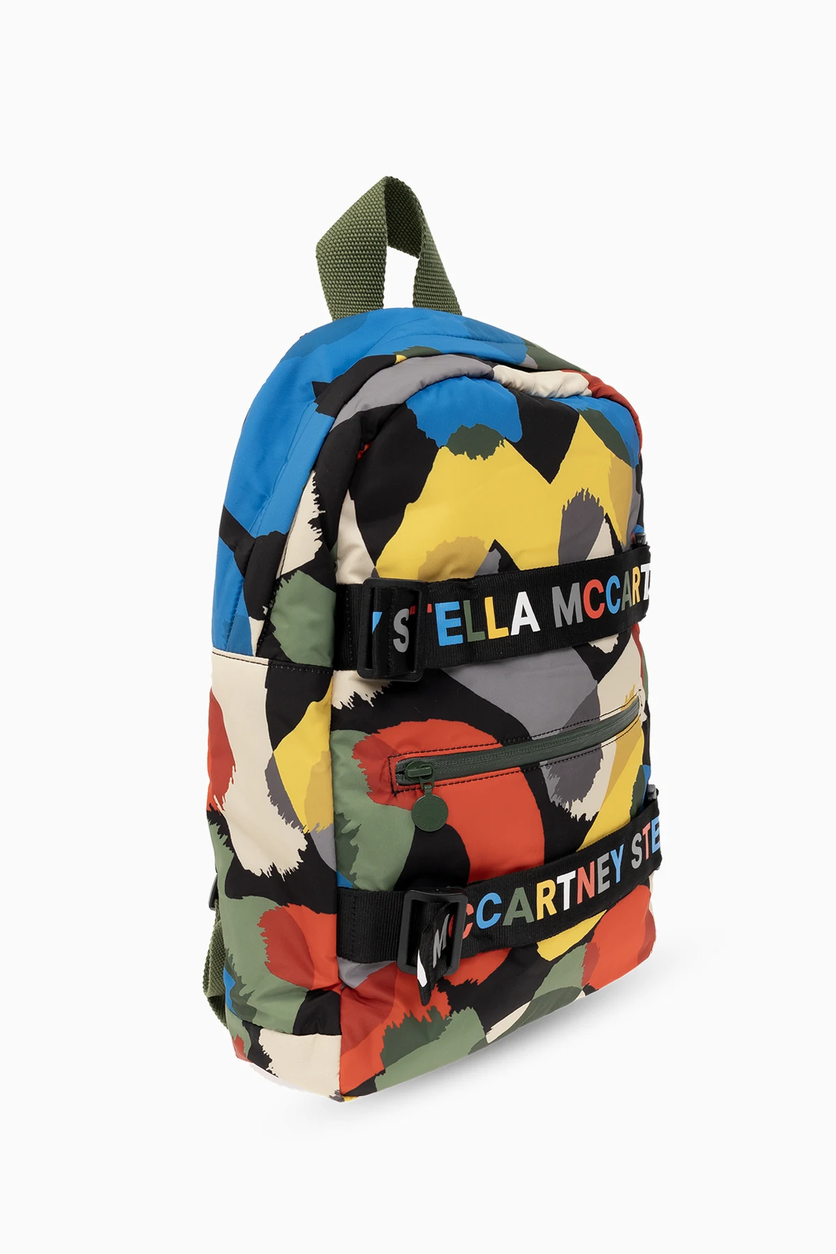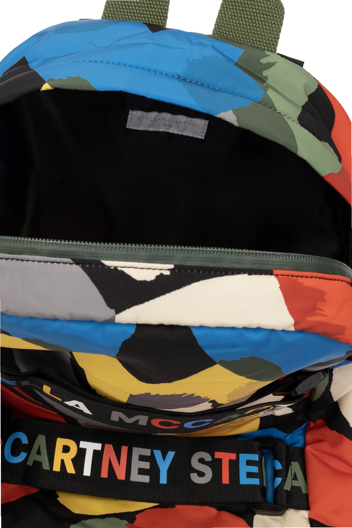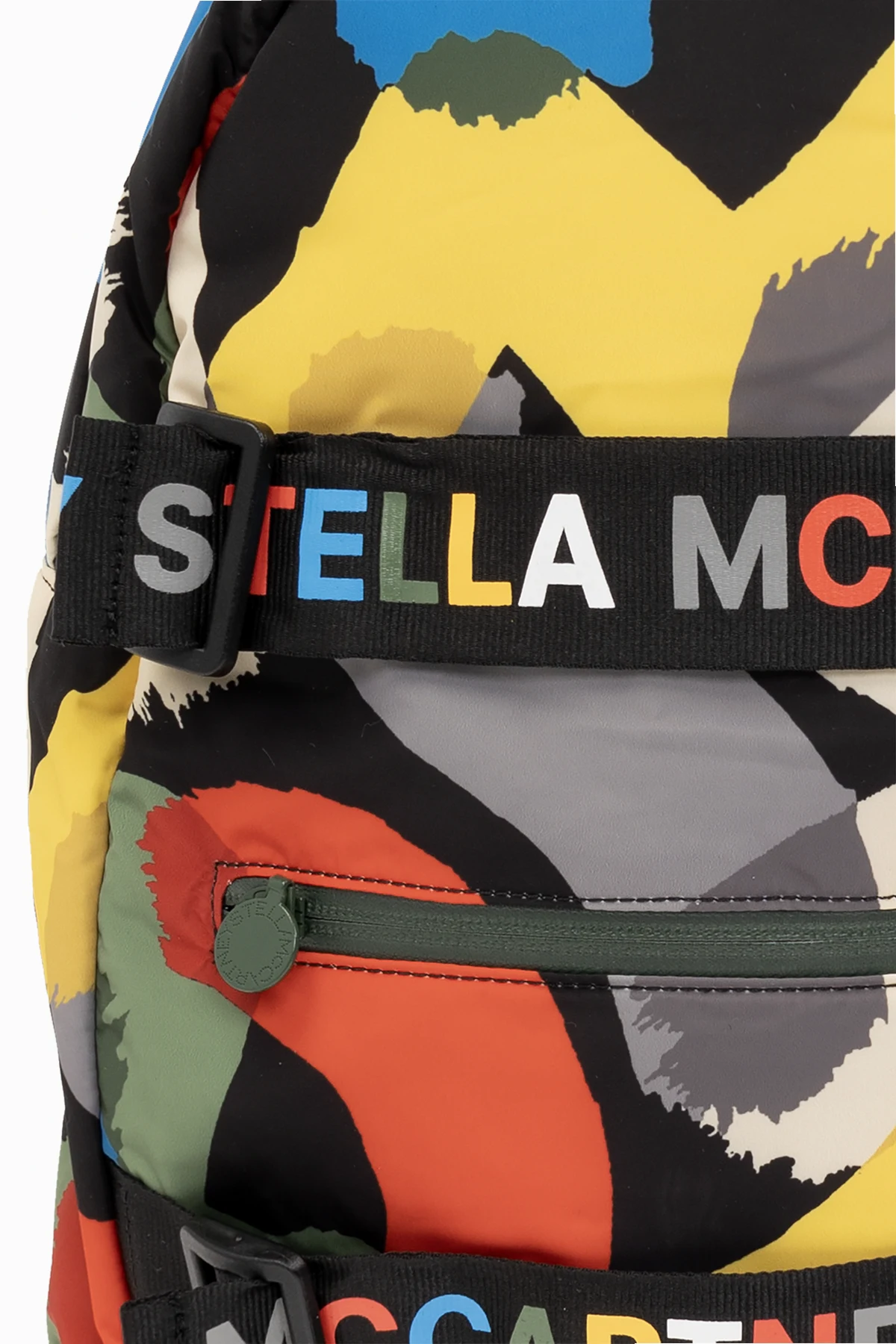 Kolorowy plecak Stella McCartney Kids. Wykonany z materiału pozyskanego z recyklingu. Zamykany na dwubiegunowy zamek. Ozdobiony wzorem oraz regulowanymi paskami z logo. Z przodu kieszeń z zamknięciem na zamek. Na górze krótki uchwyt, z tyłu regulowane szelki. Wewnątrz komora.